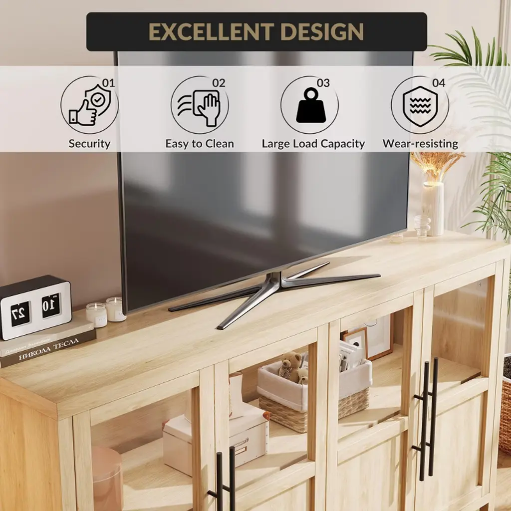 55" Large Buffet Cabinet With 4 Glass Doors, Sideboard Buffet Cabinet With Storage For Kitchen Dining Room, Living Room,wood Color