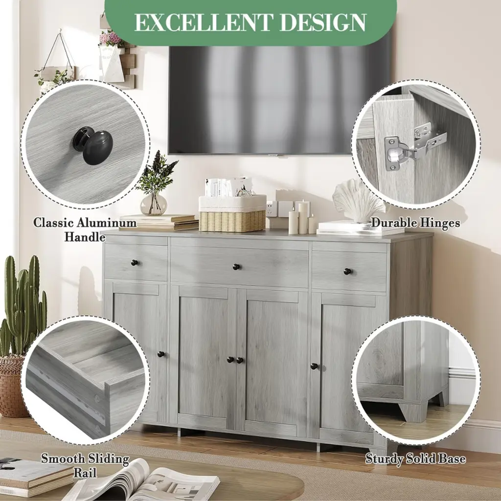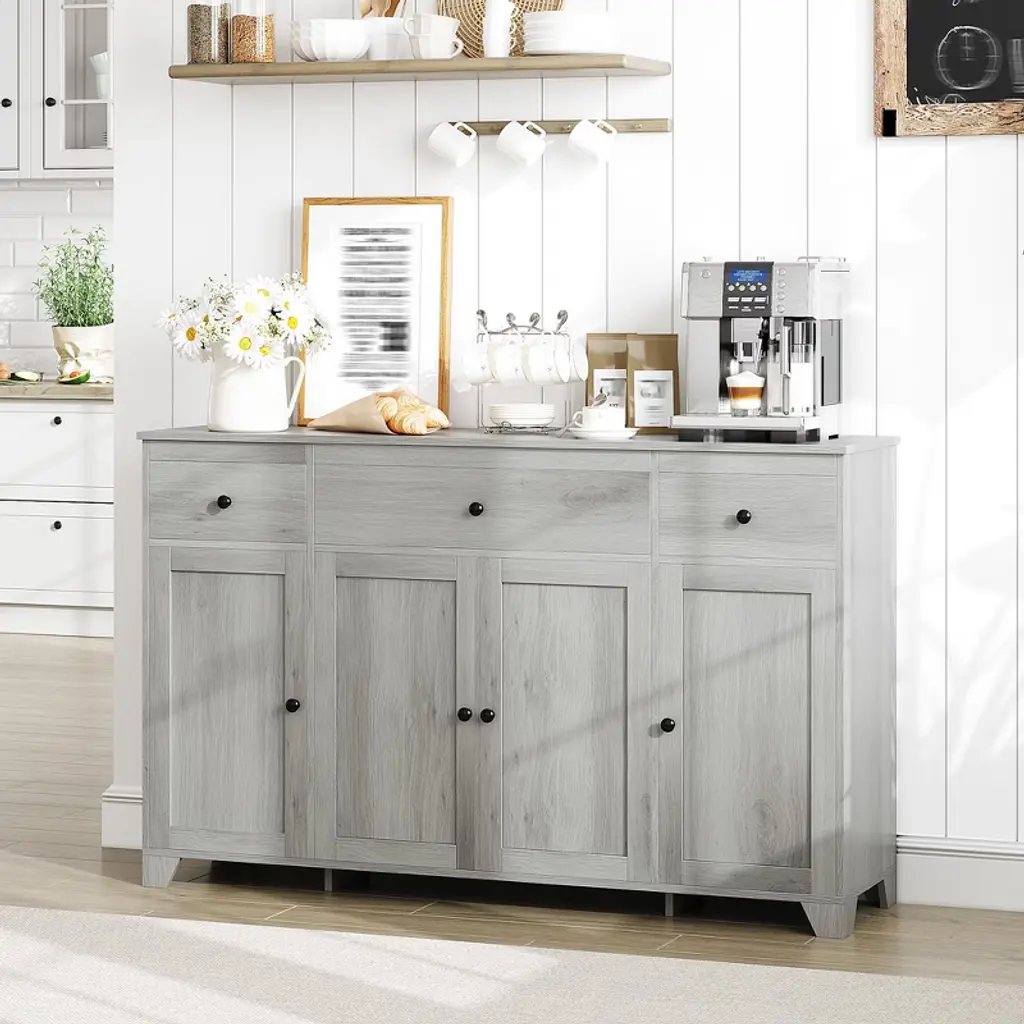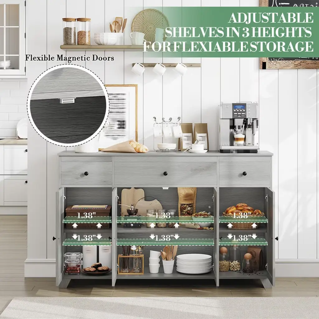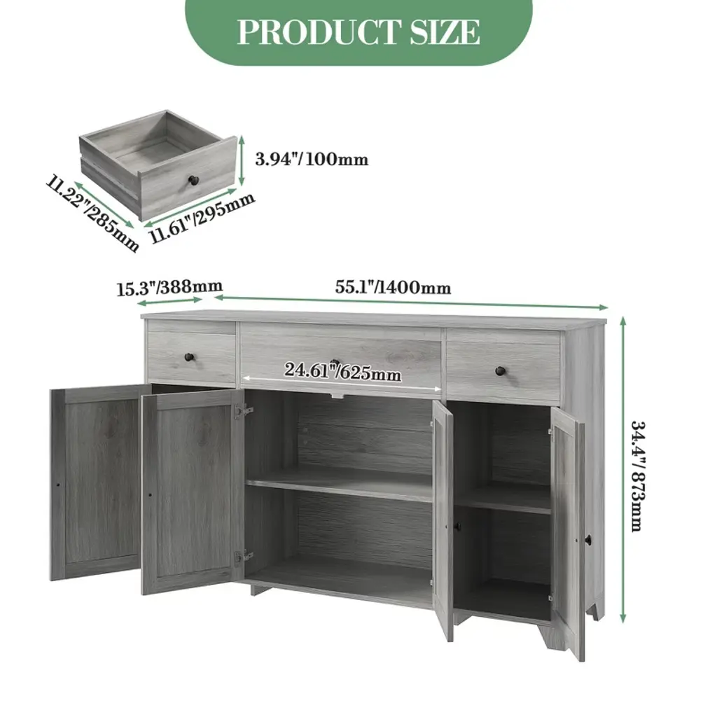 Feature:This 55" sideboard buffet cabinet blends modern simplicity with practical storage. Featuring three drawers and four doors with an adjustable interior shelf, it keeps dinnerware, cookware, and pantry items neatly organized while the open countertop offers space for appliances or a coffee bar. The clean-lined design fits contemporary and minimalist interiors, and durable construction ensures reliable daily use across dining rooms, kitchens, or living areas.Package Included:1 × 55" Sideboard Buffet Cabinet with 3 Drawers & 4 Doors