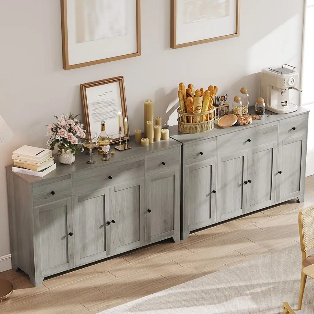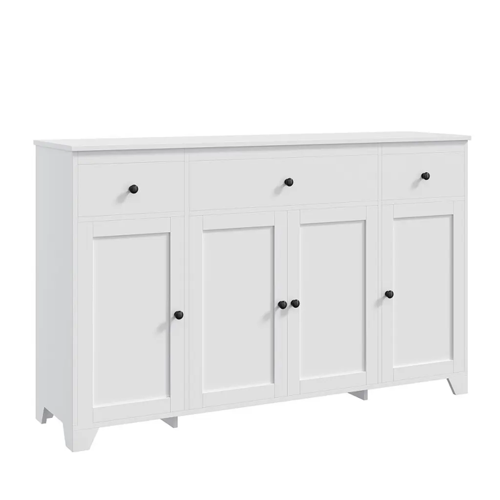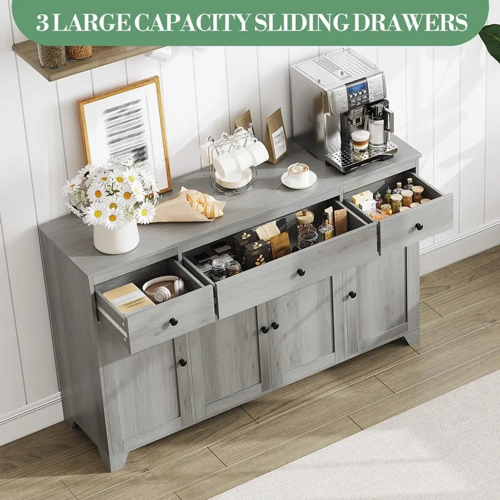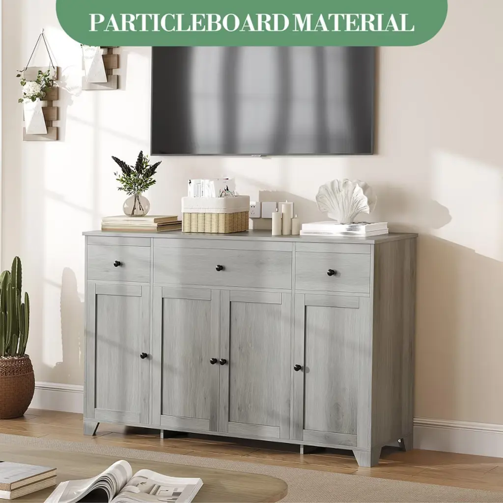 Feature:This 55" sideboard buffet cabinet blends modern simplicity with practical storage. Featuring three drawers and four doors with an adjustable interior shelf, it keeps dinnerware, cookware, and pantry items neatly organized while the open countertop offers space for appliances or a coffee bar. The clean-lined design fits contemporary and minimalist interiors, and durable construction ensures reliable daily use across dining rooms, kitchens, or living areas.Package Included:1 × 55" Sideboard Buffet Cabinet with 3 Drawers & 4 Doors