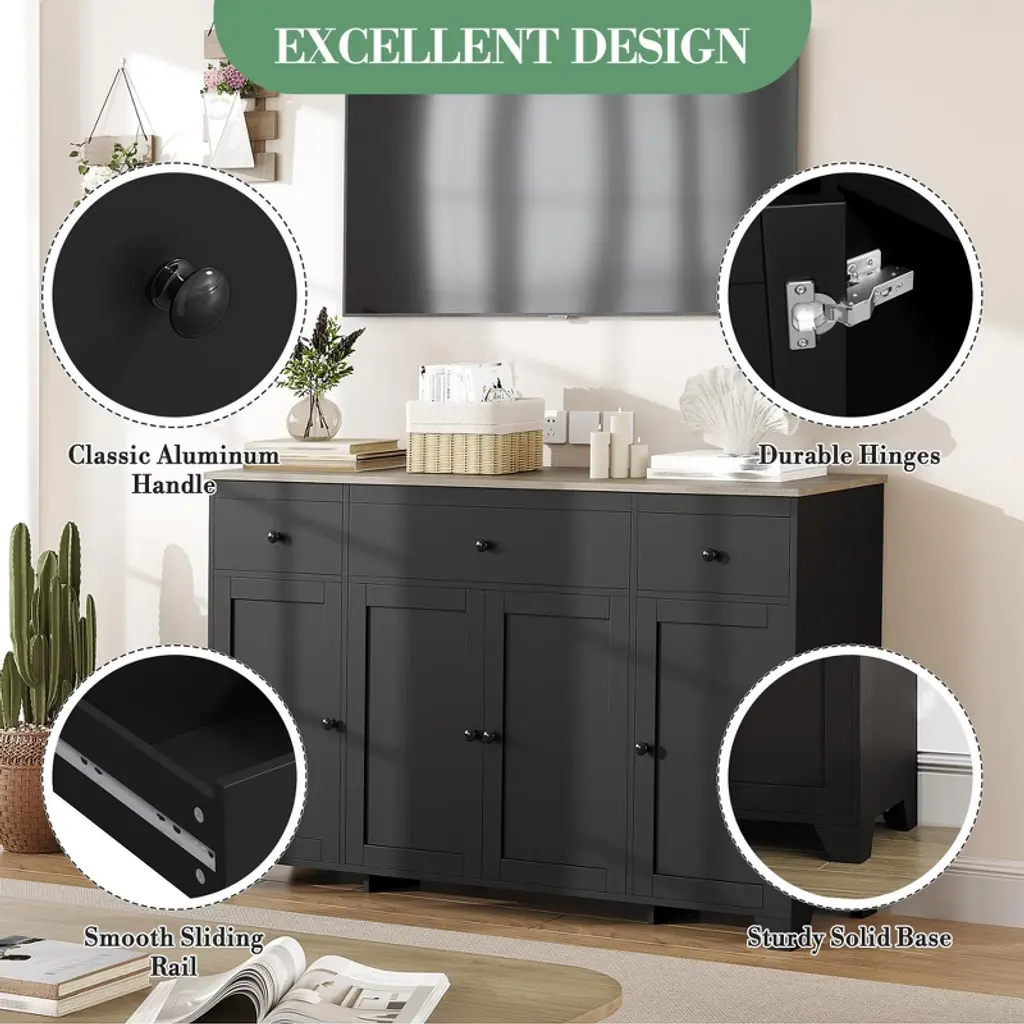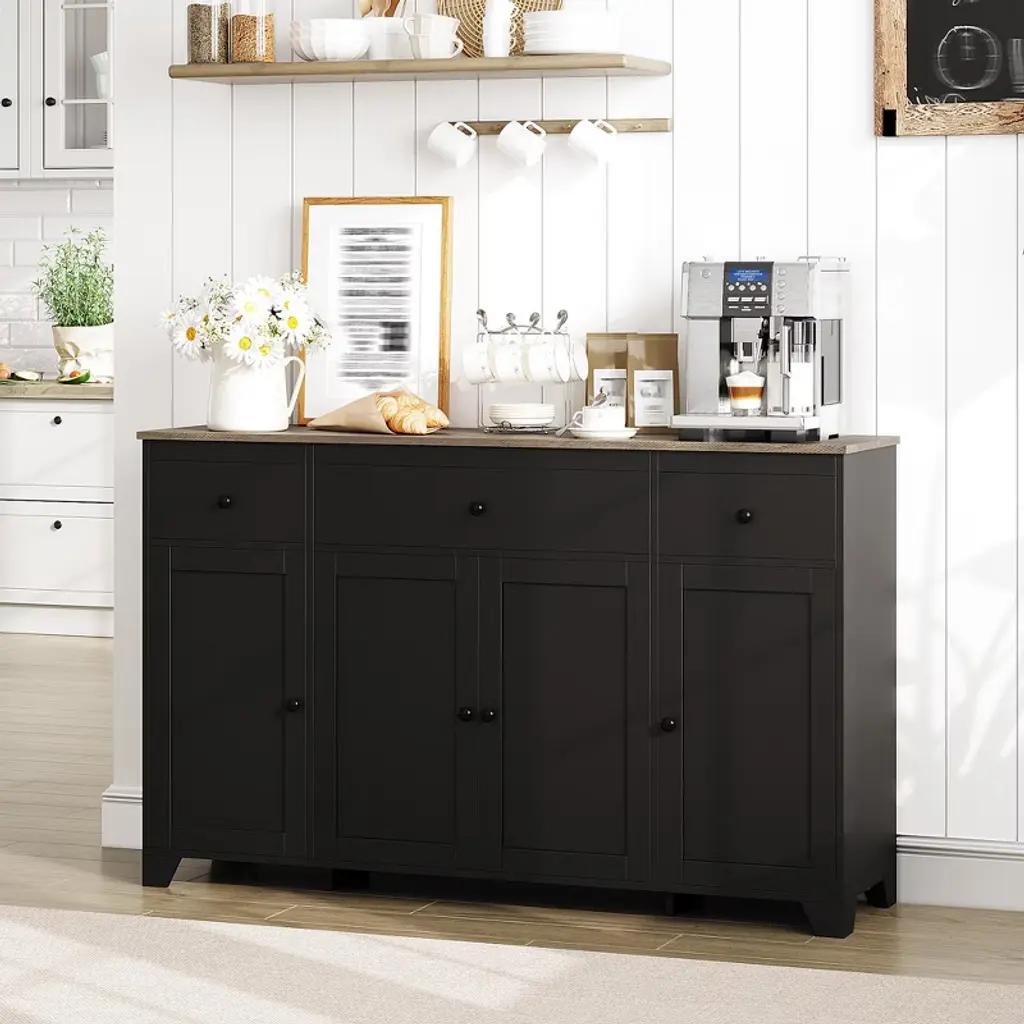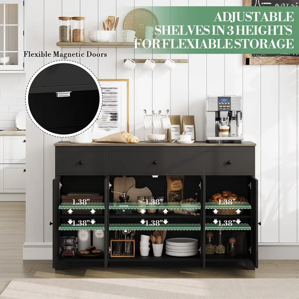 Feature:This 55" sideboard buffet cabinet blends modern simplicity with practical storage. Featuring three drawers and four doors with an adjustable interior shelf, it keeps dinnerware, cookware, and pantry items neatly organized while the open countertop offers space for appliances or a coffee bar. The clean-lined design fits contemporary and minimalist interiors, and durable construction ensures reliable daily use across dining rooms, kitchens, or living areas.Package Included:1 × 55" Sideboard Buffet Cabinet with 3 Drawers & 4 Doors
