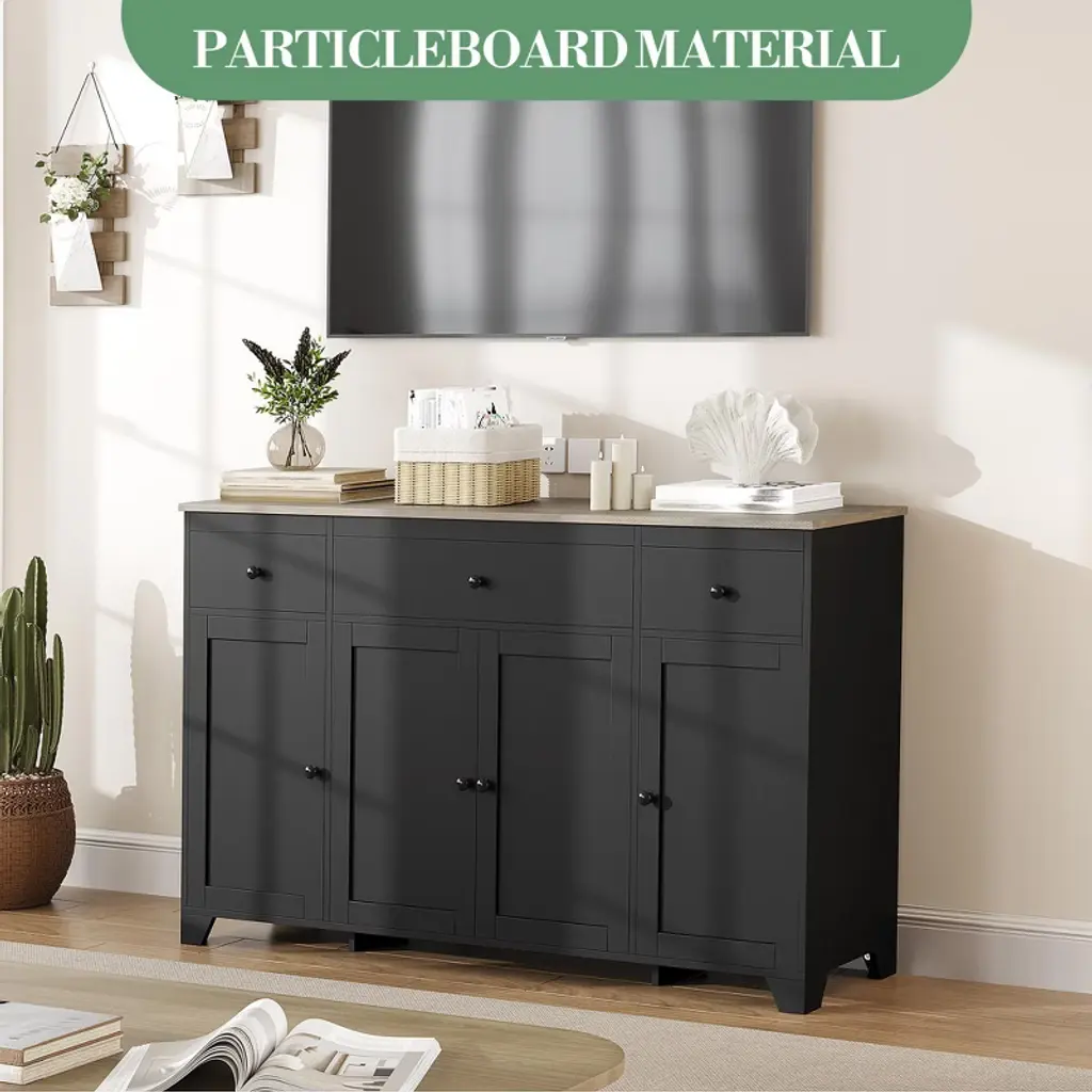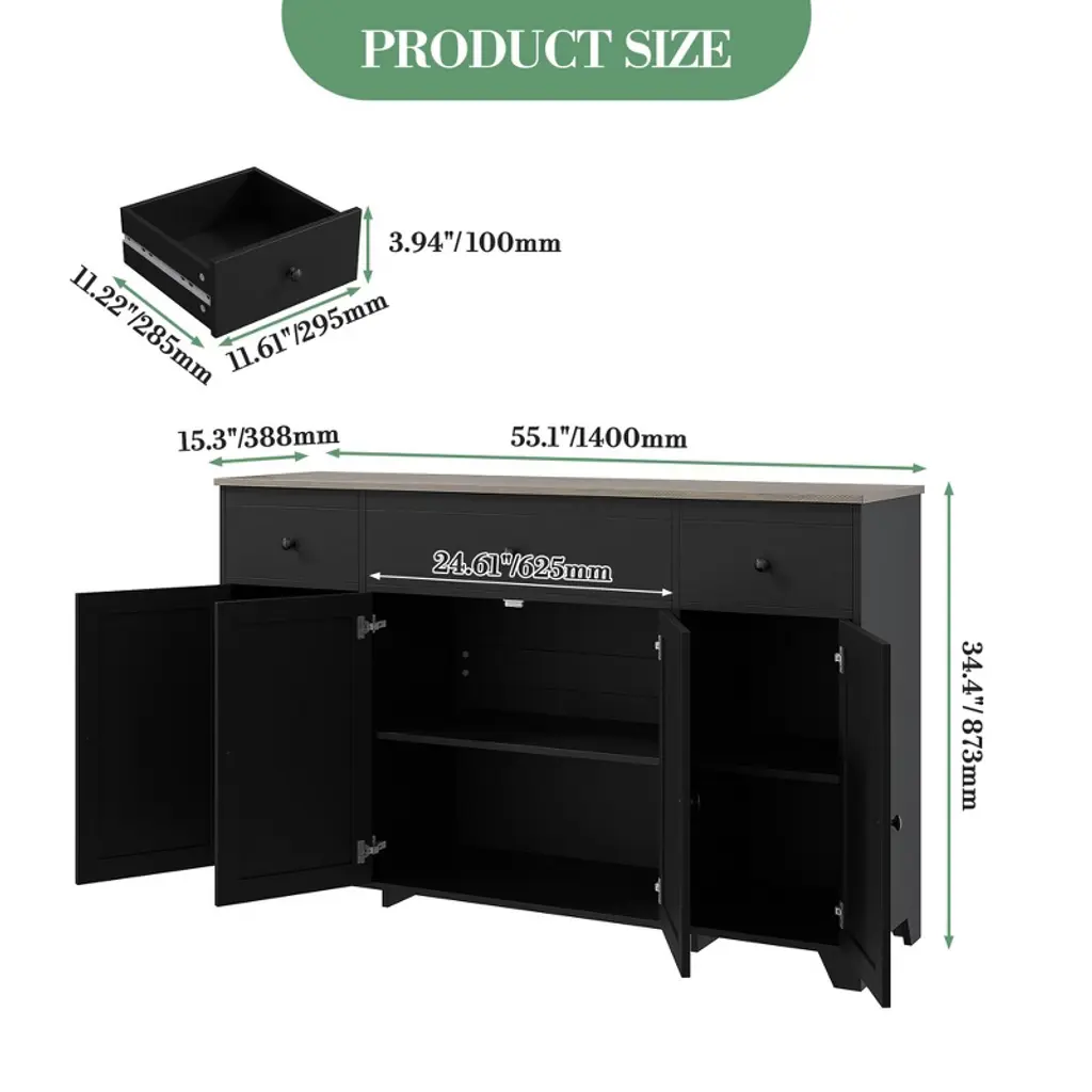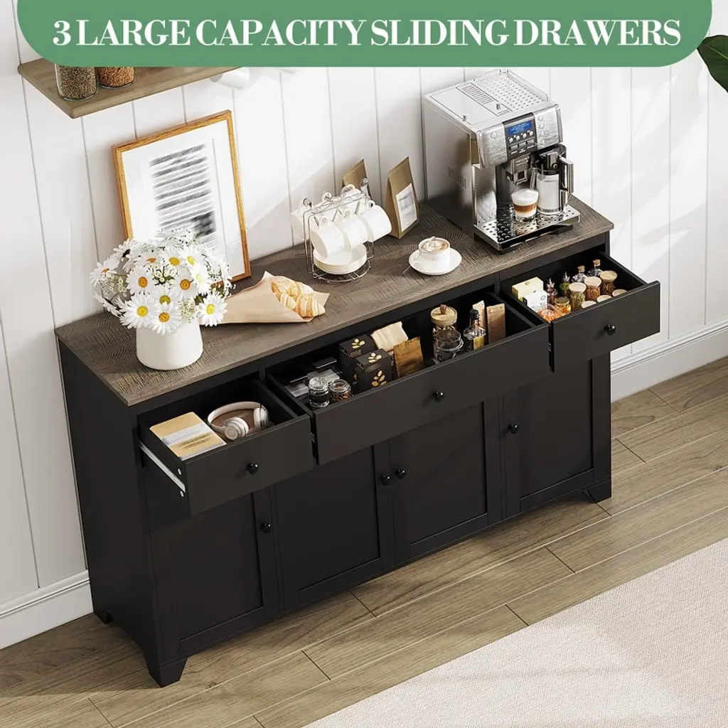 Feature:This 55" sideboard buffet cabinet blends modern simplicity with practical storage. Featuring three drawers and four doors with an adjustable interior shelf, it keeps dinnerware, cookware, and pantry items neatly organized while the open countertop offers space for appliances or a coffee bar. The clean-lined design fits contemporary and minimalist interiors, and durable construction ensures reliable daily use across dining rooms, kitchens, or living areas.Package Included:1 × 55" Sideboard Buffet Cabinet with 3 Drawers & 4 Doors