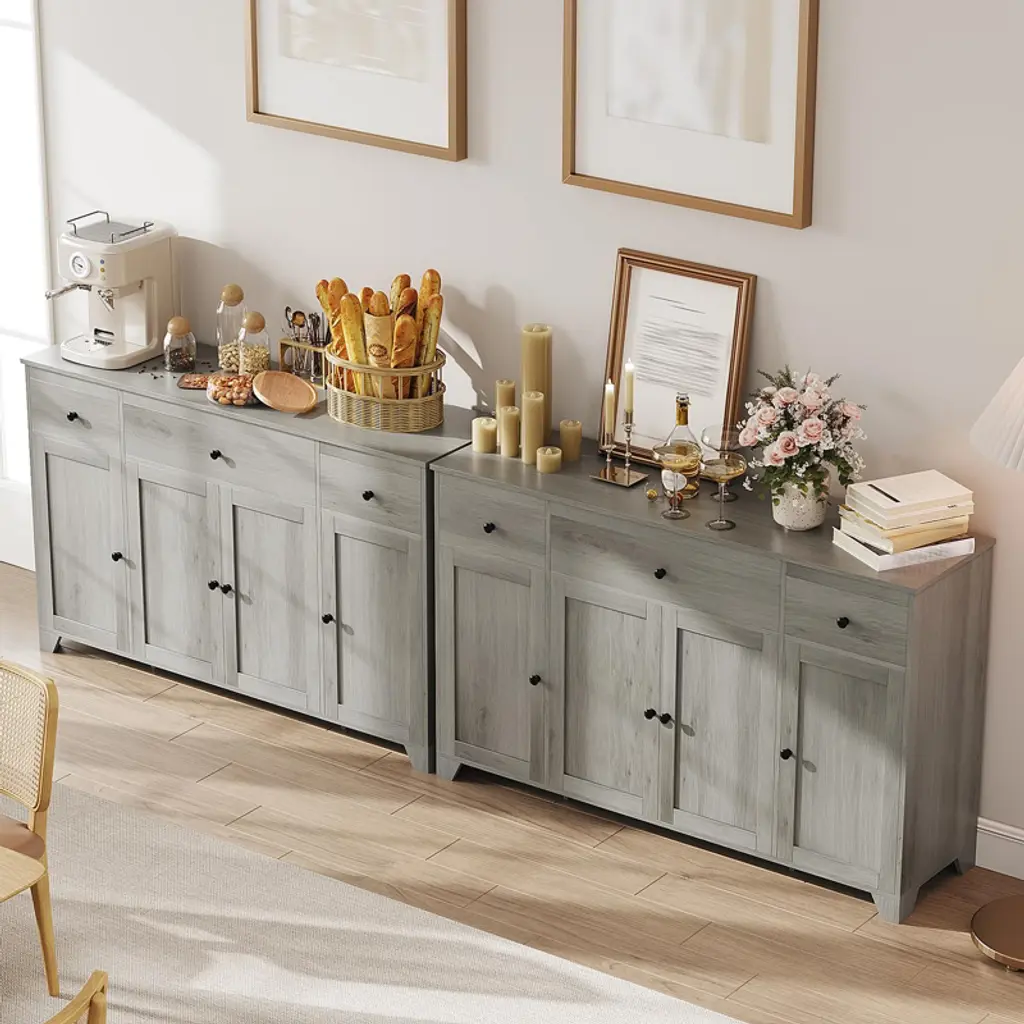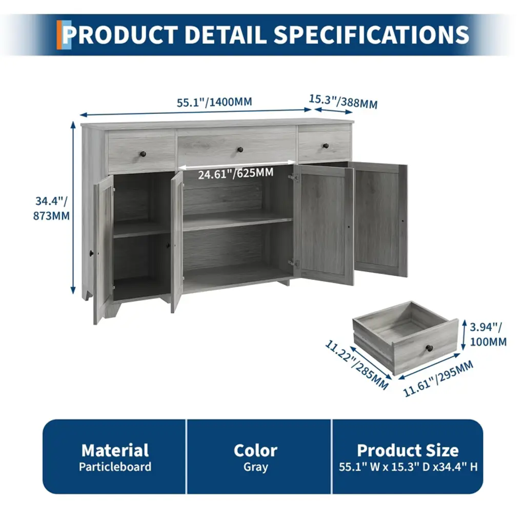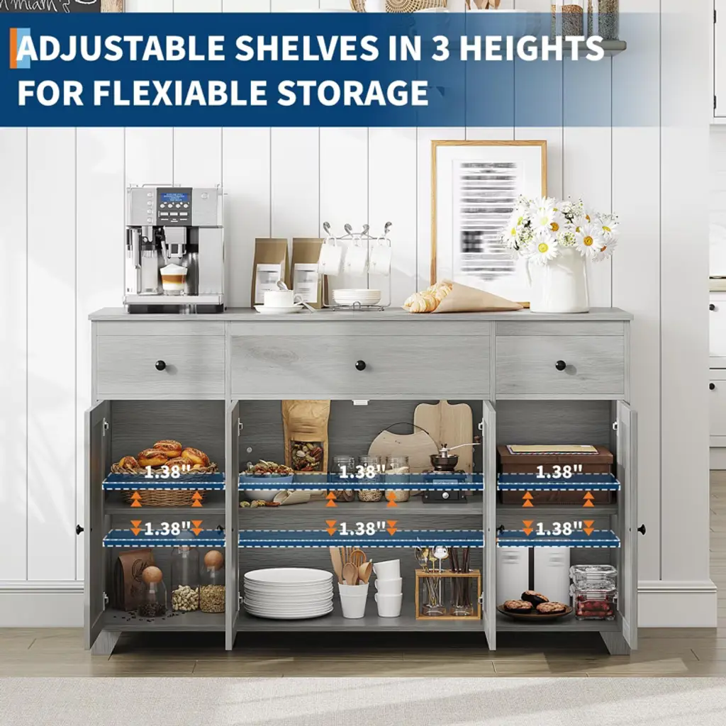 55" Modern Sideboard Buffet Cabinet ¨C Adjustable Coffee Bar & Storage SolutionStylish & Functional Storage for Any SpaceElevate your home organization with the 55" Sideboard Buffet Cabinet¡ªa sleek, minimalist storage solution perfect for kitchens, dining rooms, living areas, and home offices. Featuring adjustable shelves, 3 drawers, and 4 spacious compartments, this versatile cabinet keeps everything from coffee essentials to dinnerware neatly organized while enhancing your decor.? Fully Adjustable Shelves ¨C Customize storage for bottles, appliances & decor? Minimalist Modern Design ¨C Clean lines, flat panel doors & matte black handles? Multi-Functional Use ¨C Coffee bar, buffet server, entryway console & more? Premium Sturdy Build ¨C High-density wood, 300 lb capacity & smooth-gliding drawers? Easy 1-2 Hour Assembly ¨C Pre-drilled holes & clear instructions includedKey Features1. Fully Adjustable Storage 3 Height-Adjustable Interior Shelves ¨C Fit tall wine bottles, small appliances, or decorative items 3 Spacious Drawers ¨C Ideal for silverware, linens, or kitchen tools 4 Large Compartments ¨C Conceal clutter behind sleek cabinet doors 2. Minimalist Modern Aesthetic Flat Panel Doors ¨C Clean, pattern-free design for a clutter-free look Black Metal Handles ¨C Subtle contemporary accent Neutral Finish ¨C Blends with Scandinavian, industrial & modern farmhouse decor 3. Versatile Placement Options? Coffee Bar Station ¨C Store mugs, pods, syrups & machines??? Buffet Server ¨C Display dishes & serve food during gatherings?? Entryway Console ¨C Hide keys, mail & everyday clutter?? Living Room Storage ¨C Organize books, media & decor4. Premium Durable Construction High-Density Manufactured Wood ¨C Resists warping & daily wear Reinforced Corners ¨C Enhanced stability & longevity Ball-Bearing Drawers ¨C Smooth open/close operation 300 lb Weight Capacity ¨C Sturdy enough for heavy items 5. Hassle-Free Assembly Pre-Drilled Holes & Numbered Parts ¨C Simplifies setup Illustrated Instructions ¨C Most users assemble in 1-2 hours No Technical Skills Needed ¨C Straightforward DIY process Technical SpecificationsAttributeDetailsBrand£ºTROPOWMaterial£ºHigh-density manufactured woodColor£ºMatte neutral finishDimensions£º55"W x 15.1"D x 31.9"HWeight Capacity300 lbs (136 kg)Storage Features3 drawers + 4 doors + 3 adjustable shelvesHandle TypeBlack metal minimalist pullsAssemblyTools & instructions includedWhy Choose This Sideboard Cabinet?? Maximizes Storage ¨C Adjustable shelves fit items of all sizes? Sleek & Modern ¨C Enhances any contemporary decor style? Multi-Functional ¨C Works as coffee bar, buffet, console & more? Heavy-Duty Build ¨C Supports up to 300 lbs without sagging? Easy to Assemble ¨C User-friendly setup in under 2 hours