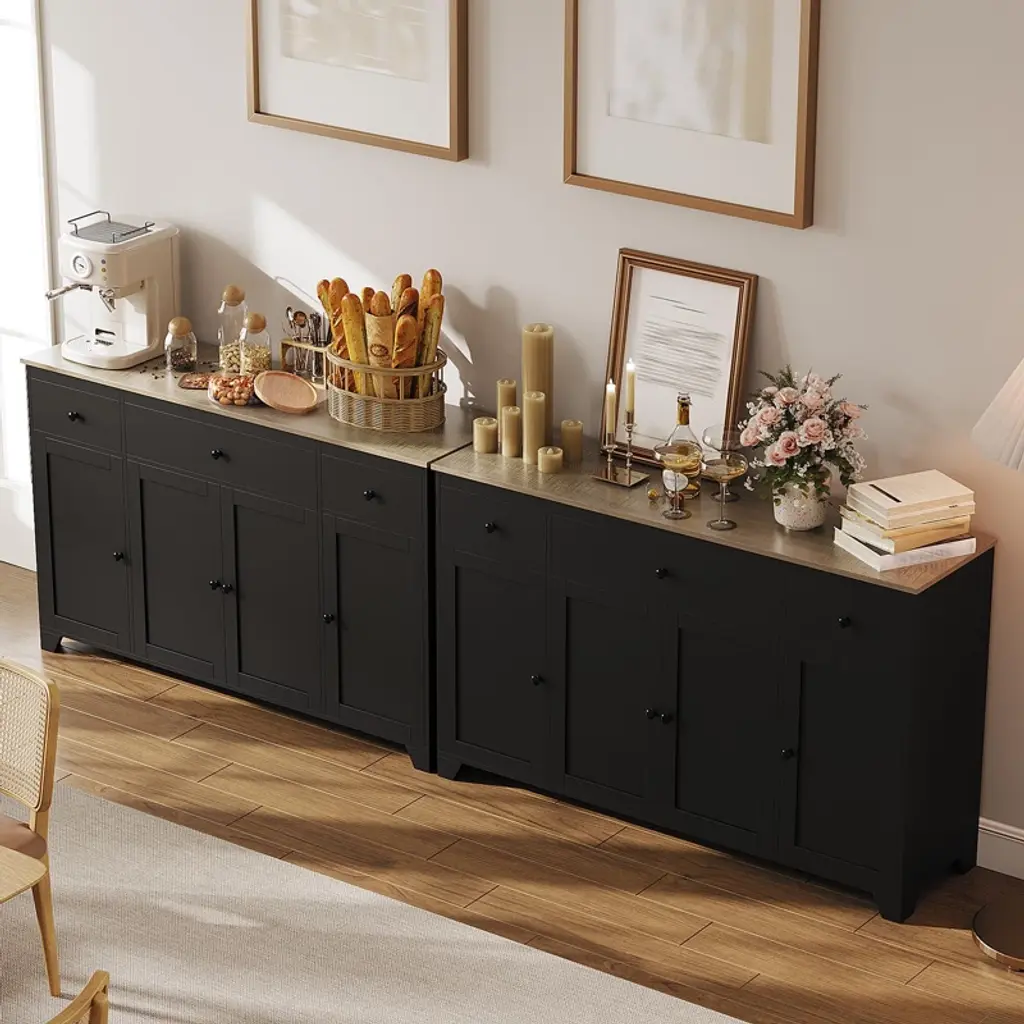 55" Sideboard Buffet Cabinet With Storage, Coffee Bar With Adjustable Shelves, 3 Drawers And 4 Minimalist Doors, Long Storage Cabinet For Kitchen