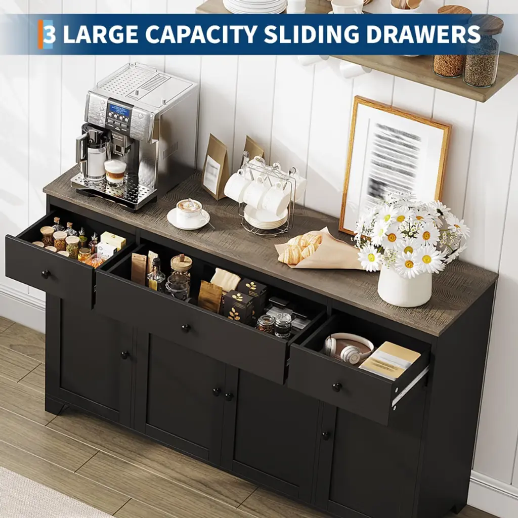 55" Modern Sideboard Buffet Cabinet ¨C Adjustable Coffee Bar & Storage SolutionStylish & Functional Storage for Any SpaceElevate your home organization with the 55" Sideboard Buffet Cabinet¡ªa sleek, minimalist storage solution perfect for kitchens, dining rooms, living areas, and home offices. Featuring adjustable shelves, 3 drawers, and 4 spacious compartments, this versatile cabinet keeps everything from coffee essentials to dinnerware neatly organized while enhancing your decor.? Fully Adjustable Shelves ¨C Customize storage for bottles, appliances & decor? Minimalist Modern Design ¨C Clean lines, flat panel doors & matte black handles? Multi-Functional Use ¨C Coffee bar, buffet server, entryway console & more? Premium Sturdy Build ¨C High-density wood, 300 lb capacity & smooth-gliding drawers? Easy 1-2 Hour Assembly ¨C Pre-drilled holes & clear instructions includedKey Features1. Fully Adjustable Storage 3 Height-Adjustable Interior Shelves ¨C Fit tall wine bottles, small appliances, or decorative items 3 Spacious Drawers ¨C Ideal for silverware, linens, or kitchen tools 4 Large Compartments ¨C Conceal clutter behind sleek cabinet doors 2. Minimalist Modern Aesthetic Flat Panel Doors ¨C Clean, pattern-free design for a clutter-free look Black Metal Handles ¨C Subtle contemporary accent Neutral Finish ¨C Blends with Scandinavian, industrial & modern farmhouse decor 3. Versatile Placement Options? Coffee Bar Station ¨C Store mugs, pods, syrups & machines??? Buffet Server ¨C Display dishes & serve food during gatherings?? Entryway Console ¨C Hide keys, mail & everyday clutter?? Living Room Storage ¨C Organize books, media & decor4. Premium Durable Construction High-Density Manufactured Wood ¨C Resists warping & daily wear Reinforced Corners ¨C Enhanced stability & longevity Ball-Bearing Drawers ¨C Smooth open/close operation 300 lb Weight Capacity ¨C Sturdy enough for heavy items 5. Hassle-Free Assembly Pre-Drilled Holes & Numbered Parts ¨C Simplifies setup Illustrated Instructions ¨C Most users assemble in 1-2 hours No Technical Skills Needed ¨C Straightforward DIY process Technical SpecificationsAttributeDetailsBrand£ºTROPOWMaterial£ºHigh-density manufactured woodColor£ºMatte neutral finishDimensions£º55"W x 15.1"D x 31.9"HWeight Capacity300 lbs (136 kg)Storage Features3 drawers + 4 doors + 3 adjustable shelvesHandle TypeBlack metal minimalist pullsAssemblyTools & instructions includedWhy Choose This Sideboard Cabinet?? Maximizes Storage ¨C Adjustable shelves fit items of all sizes? Sleek & Modern ¨C Enhances any contemporary decor style? Multi-Functional ¨C Works as coffee bar, buffet, console & more? Heavy-Duty Build ¨C Supports up to 300 lbs without sagging? Easy to Assemble ¨C User-friendly setup in under 2 hours