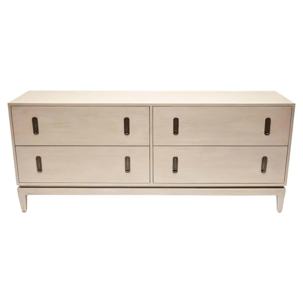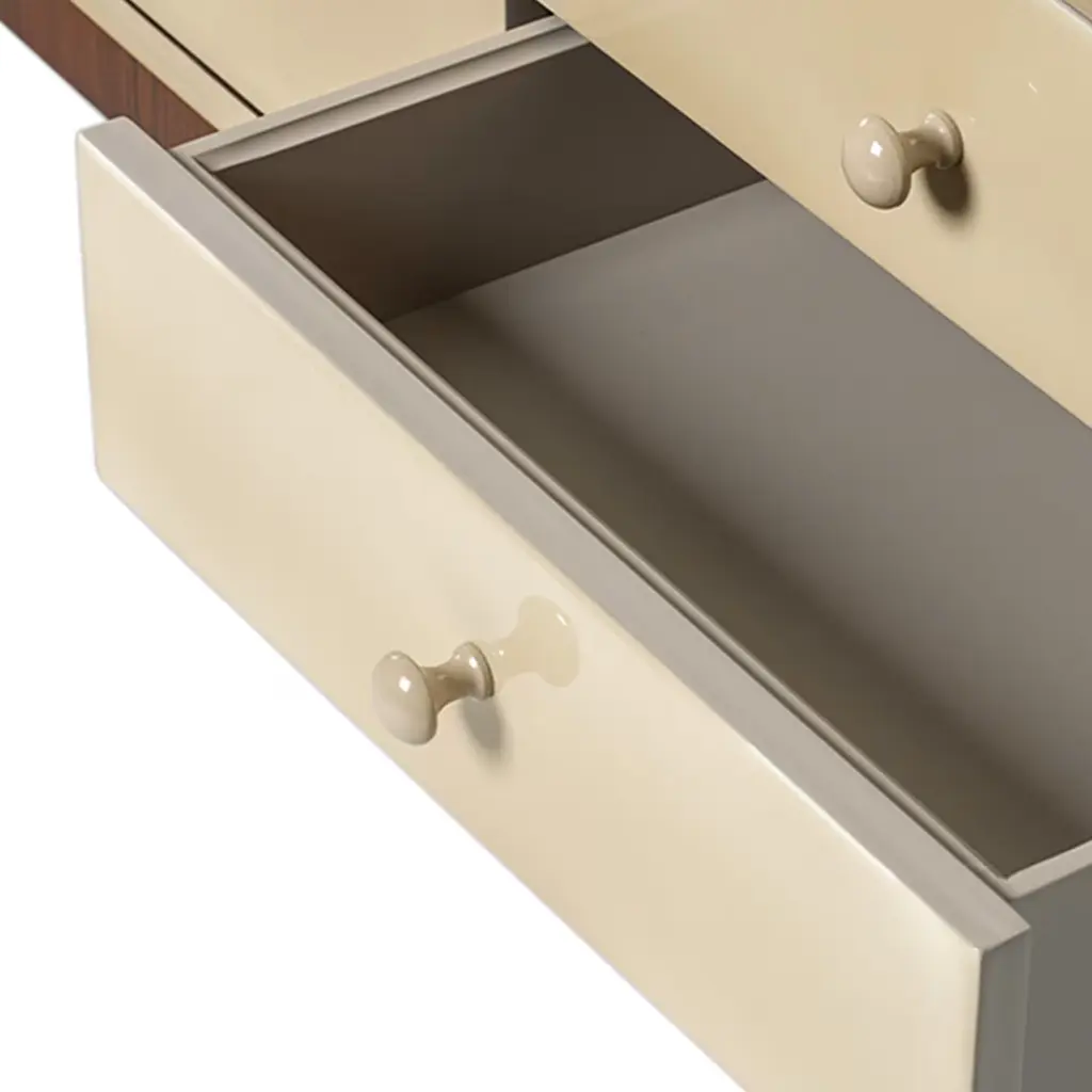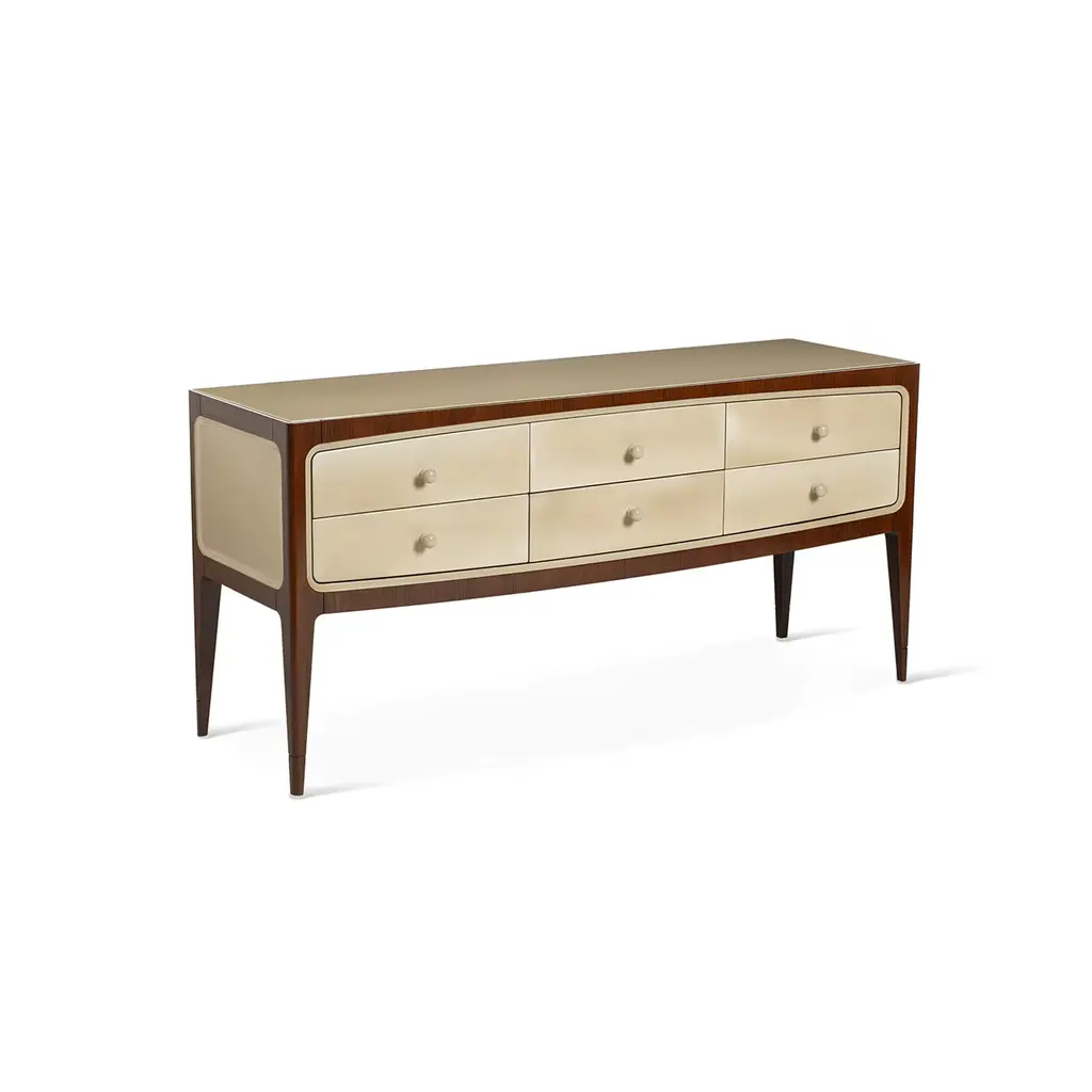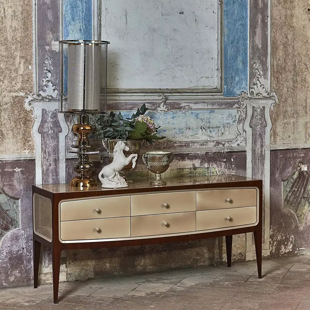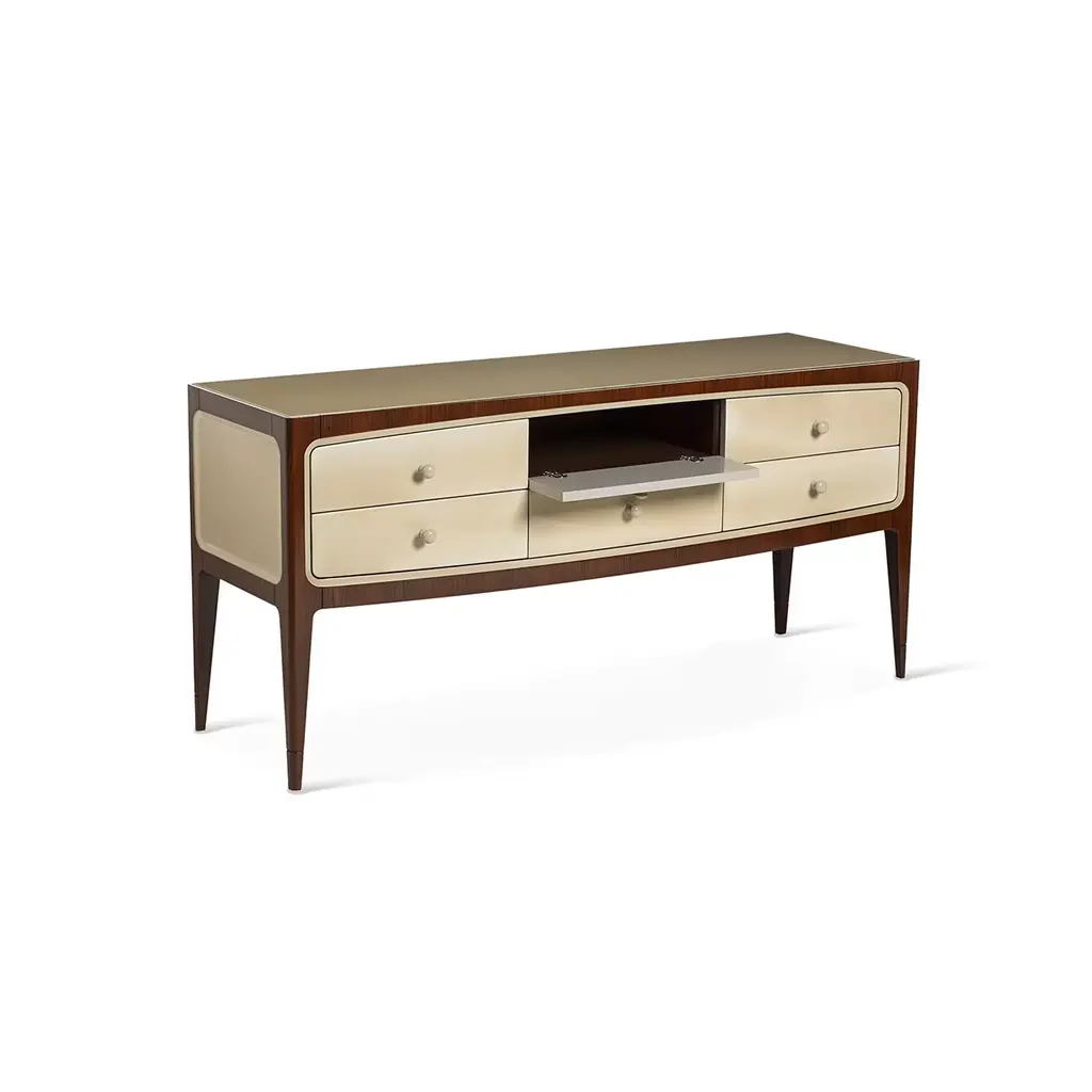 A sideboard with drawers with the classic style of the 60s. In total it has 5 drawers sliding on metal guides and 1 folding desk in the center. The structure is in beechwood and rosewood veneering, while the front, the top, and the sides are made in resin. It's polished all-around to appear shiny and neat.