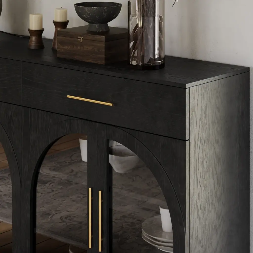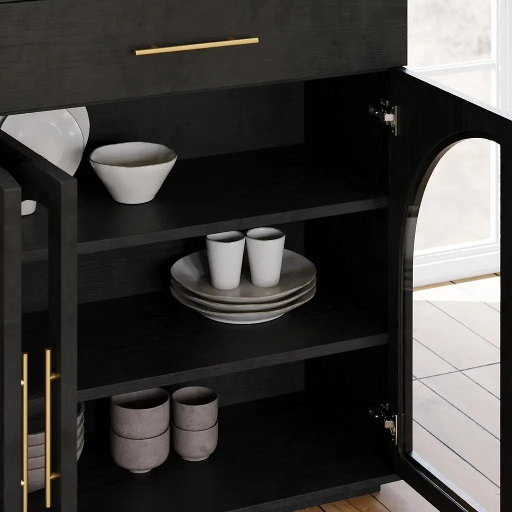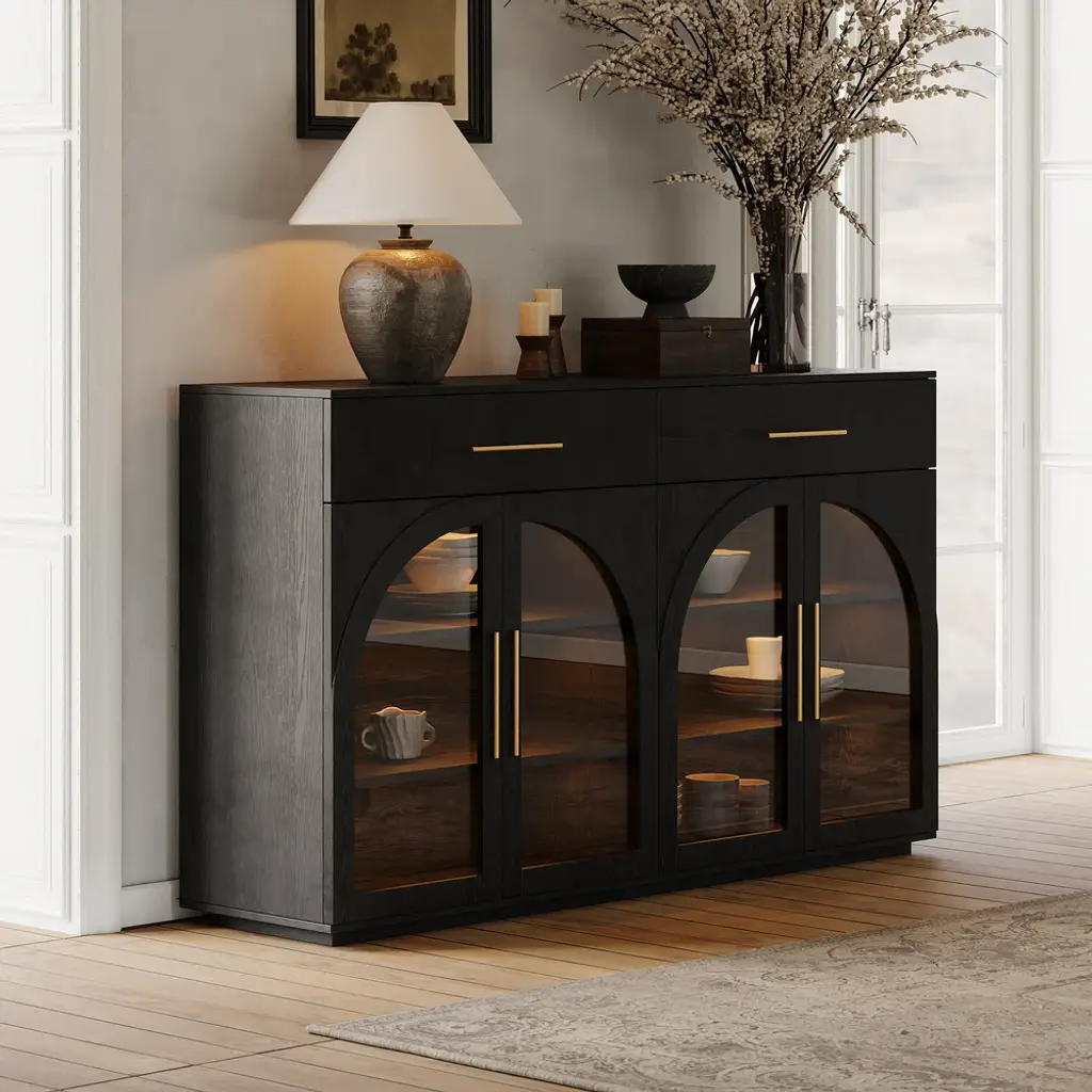 This sideboard blends quiet drama and smart function—arched glass doors frame your curated items while the sensor-activated LED lighting wakes up when you approach, casting a soft glow that highlights texture and depth; black-stained finish and gold pulls keep the look elevated and moody without overdoing it.