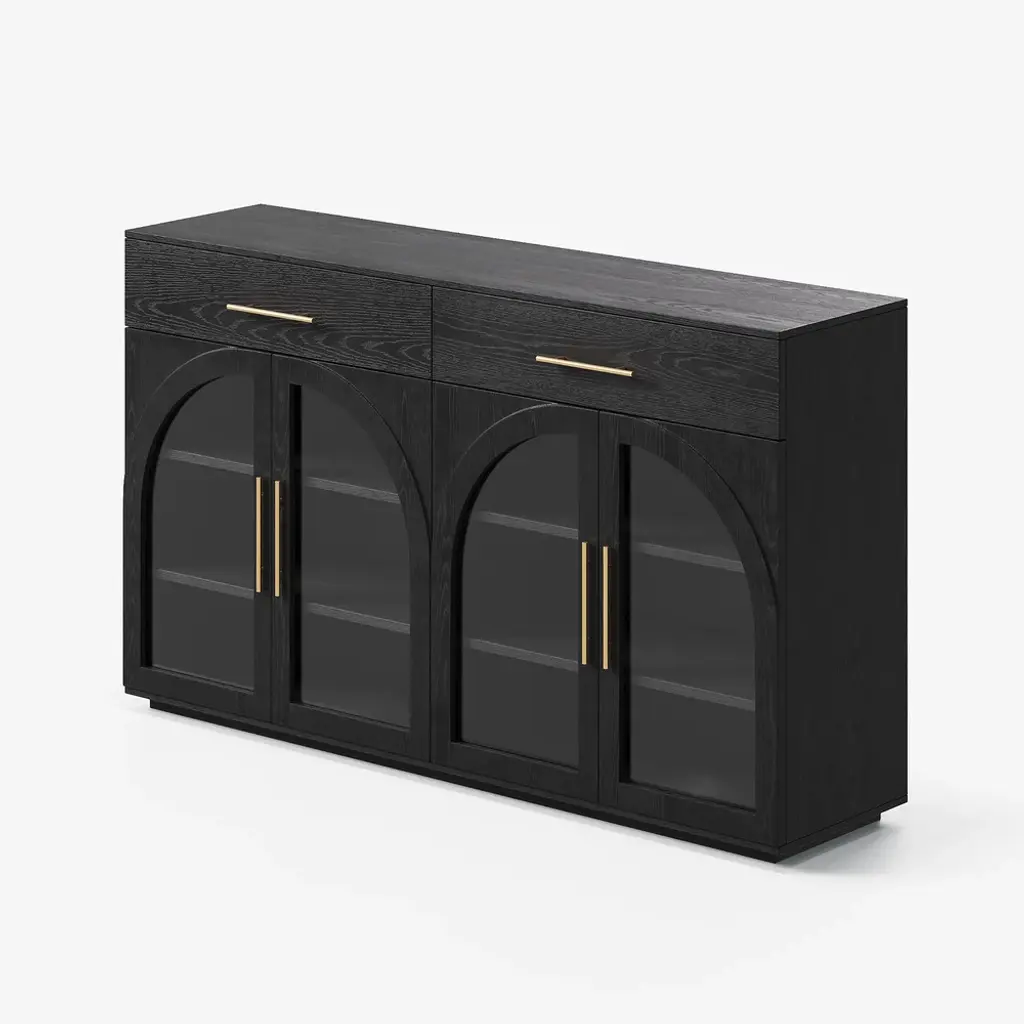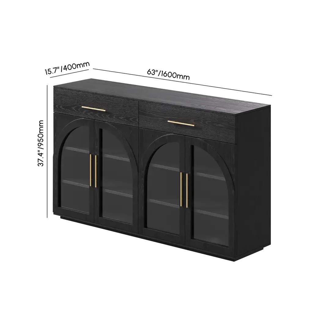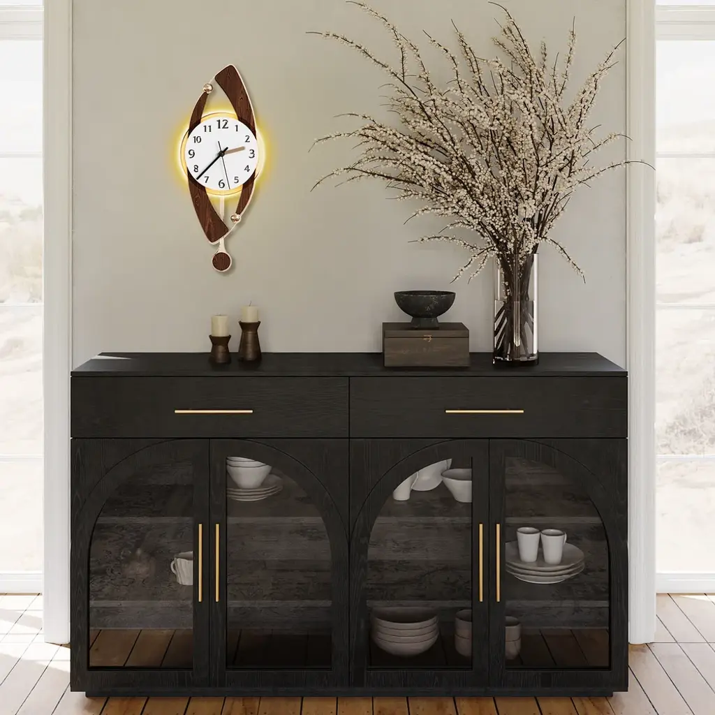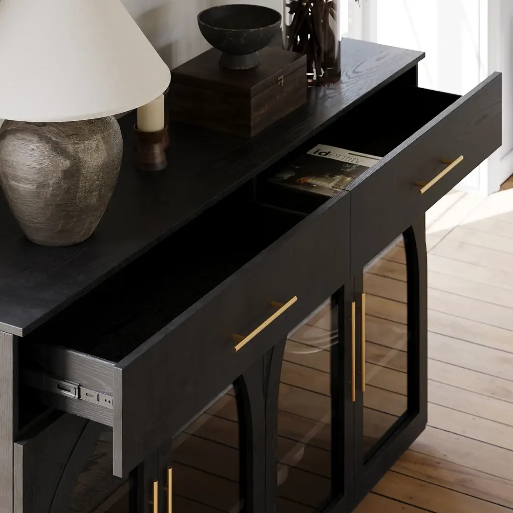 This sideboard blends quiet drama and smart function—arched glass doors frame your curated items while the sensor-activated LED lighting wakes up when you approach, casting a soft glow that highlights texture and depth; black-stained finish and gold pulls keep the look elevated and moody without overdoing it.