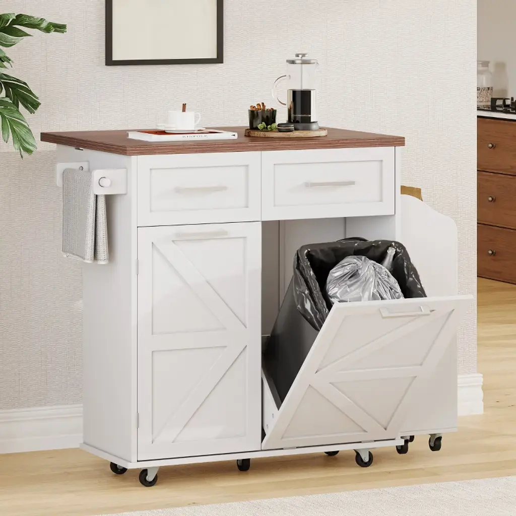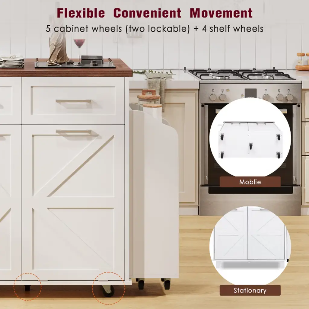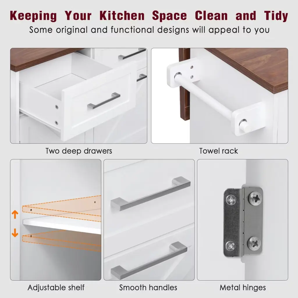Specification Product Name: 47.2" Farmhouse Kitchen Island with Drop Leaf Main Material: MDF Filler: MDF Use Case: Kitchen Number of Drawers: 2 Number of Doors: 2 Product Dimension(Overall): 47.2 x 27.2 x 39.2 inches Tabletop Weight Capacity: 300 LBS Drawer Weight Capacity: 33 LBS Shelf Weight Capacity: 75 LBS Drop Leaf Capacity: 33 LBS Product Notice 1. Wipe with a soft dry cloth. Avoid the use of harsh chemicals and household cleaners as they may damage the finish. 2. Hardware may loosen over time; periodically check that all connections are tight.