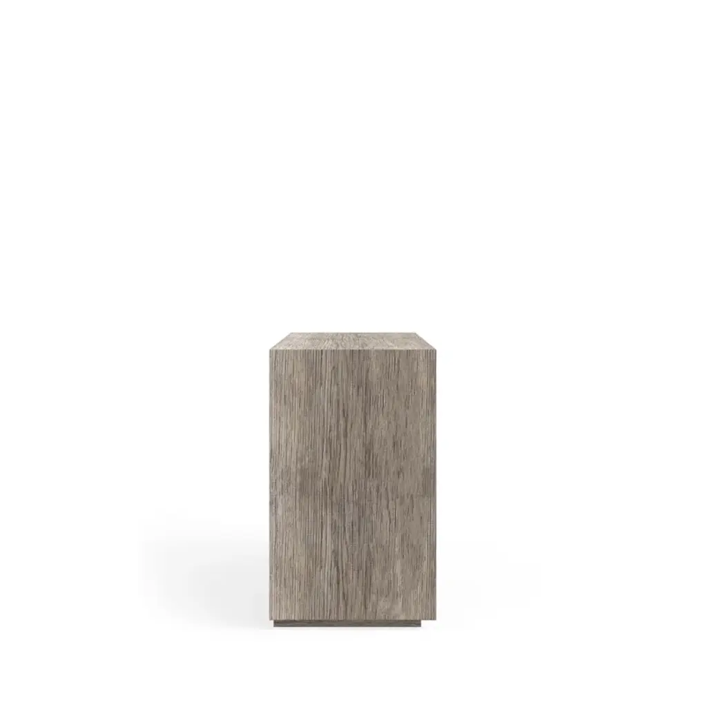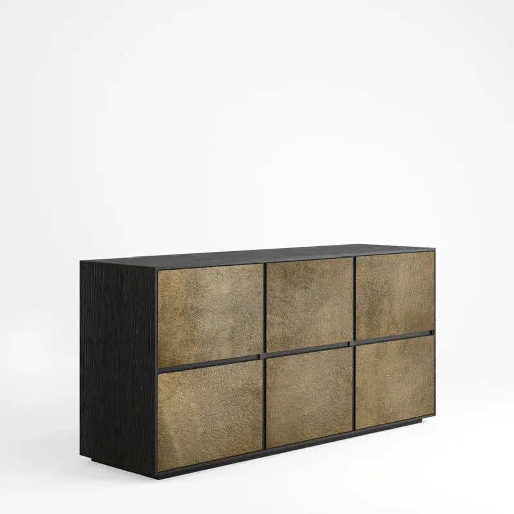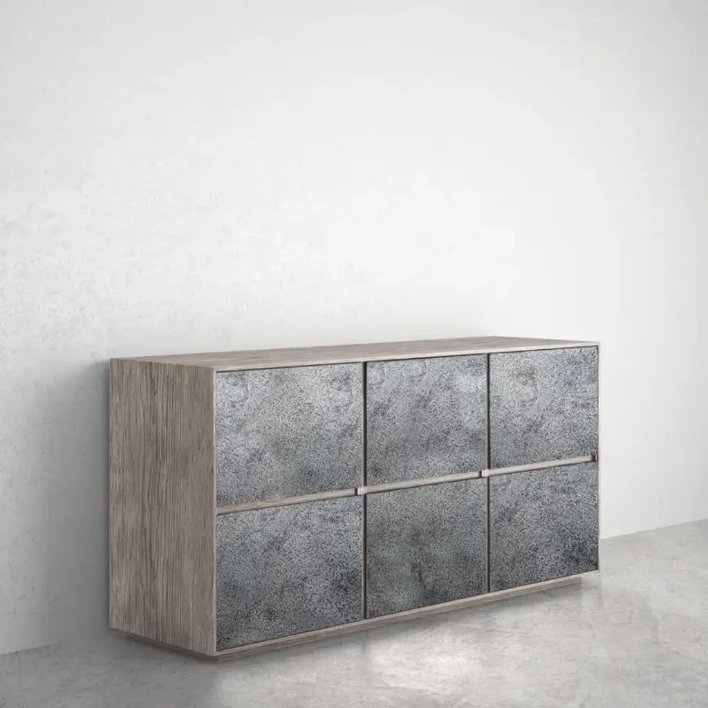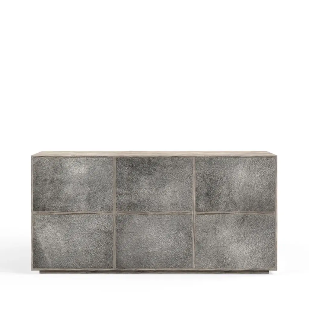 With a warm shimmer reminiscent of mica minerals, this multifaceted sideboard introduces an interplay of light and shadow. Applied by hand, intricately pieced silverleaf wraps touch-latch doors and drawers of varying dimensions for added depth and reflection. Its dark chocolate-painted interior features adjustable shelves behind each door for streamlined storage intentionally styled to make a statement in any interior.