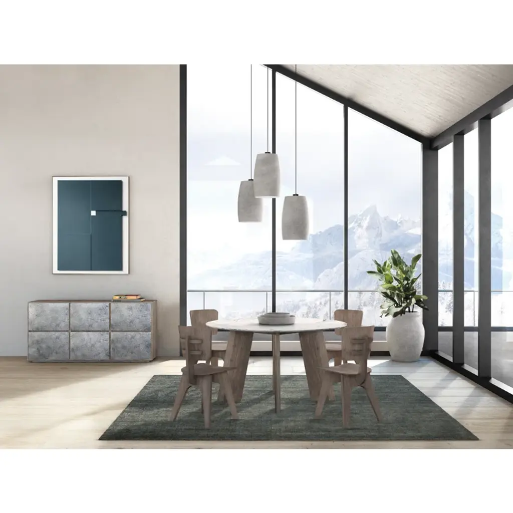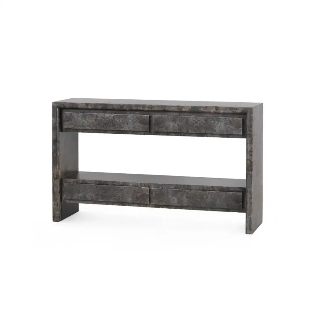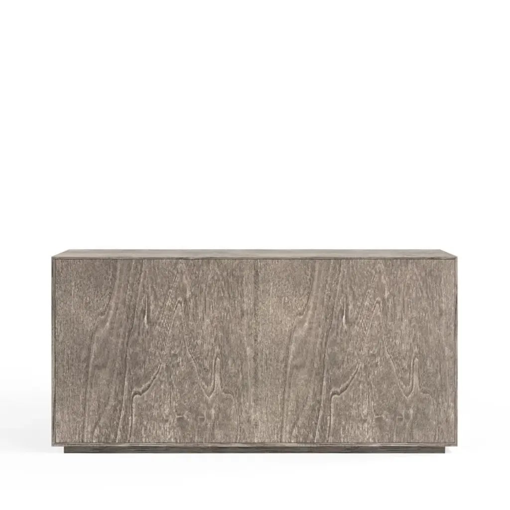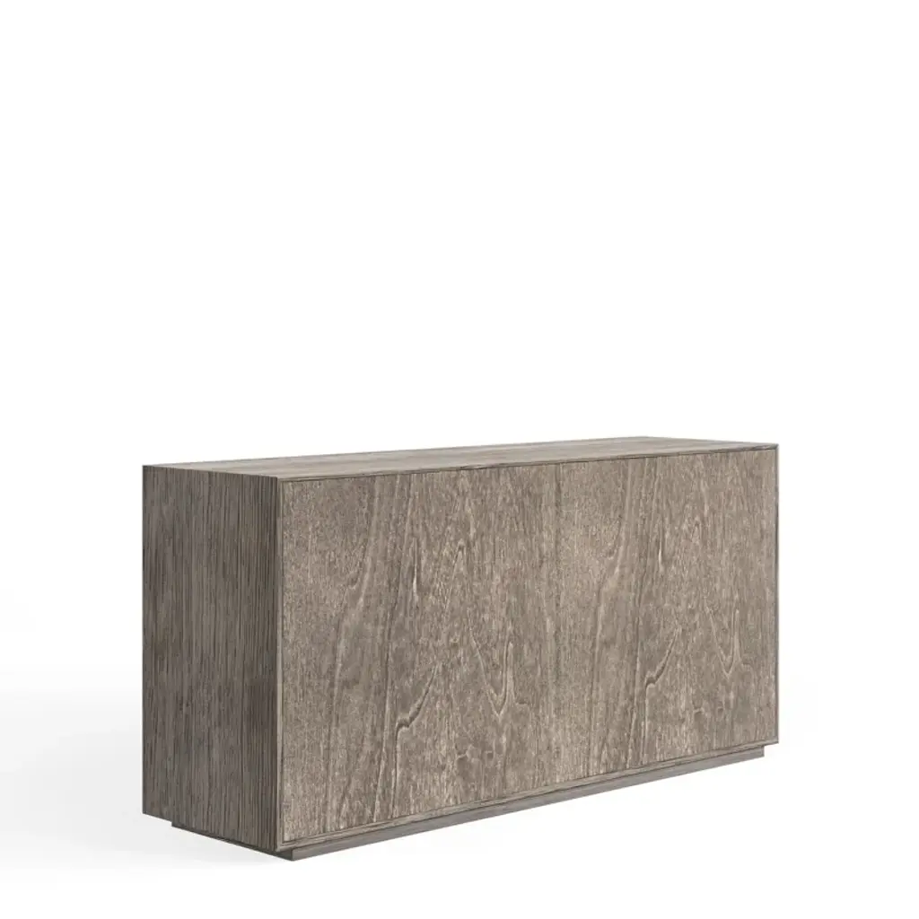 With a warm shimmer reminiscent of mica minerals, this multifaceted sideboard introduces an interplay of light and shadow. Applied by hand, intricately pieced silverleaf wraps touch-latch doors and drawers of varying dimensions for added depth and reflection. Its dark chocolate-painted interior features adjustable shelves behind each door for streamlined storage intentionally styled to make a statement in any interior.