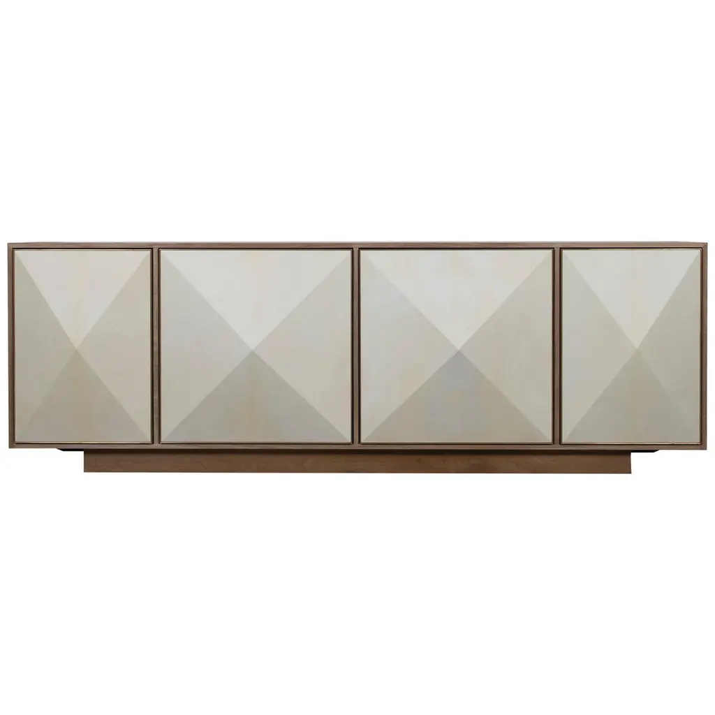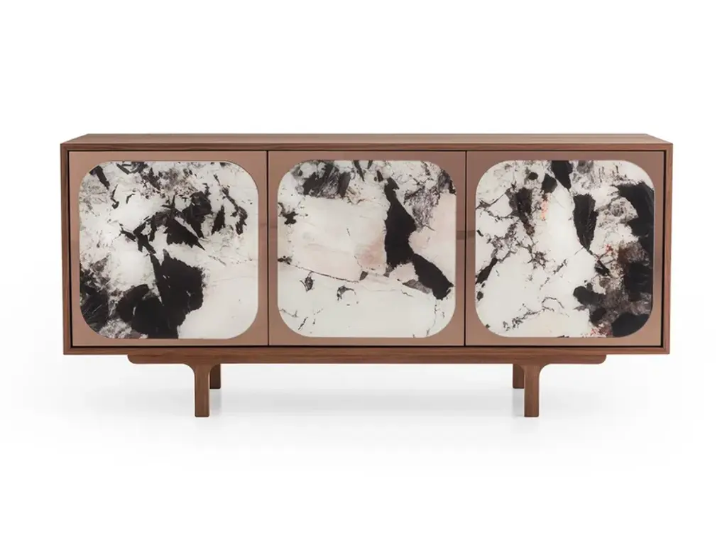 Extraordinary contemporary convex wood structure storage sideboard with two adjustable shelves. All doors are soft-closed with a luxurious high quality black frame finish. The prominent black-colored exterior gives a striking feel of symmetry and brilliance. The base is gold brushed copper feet.