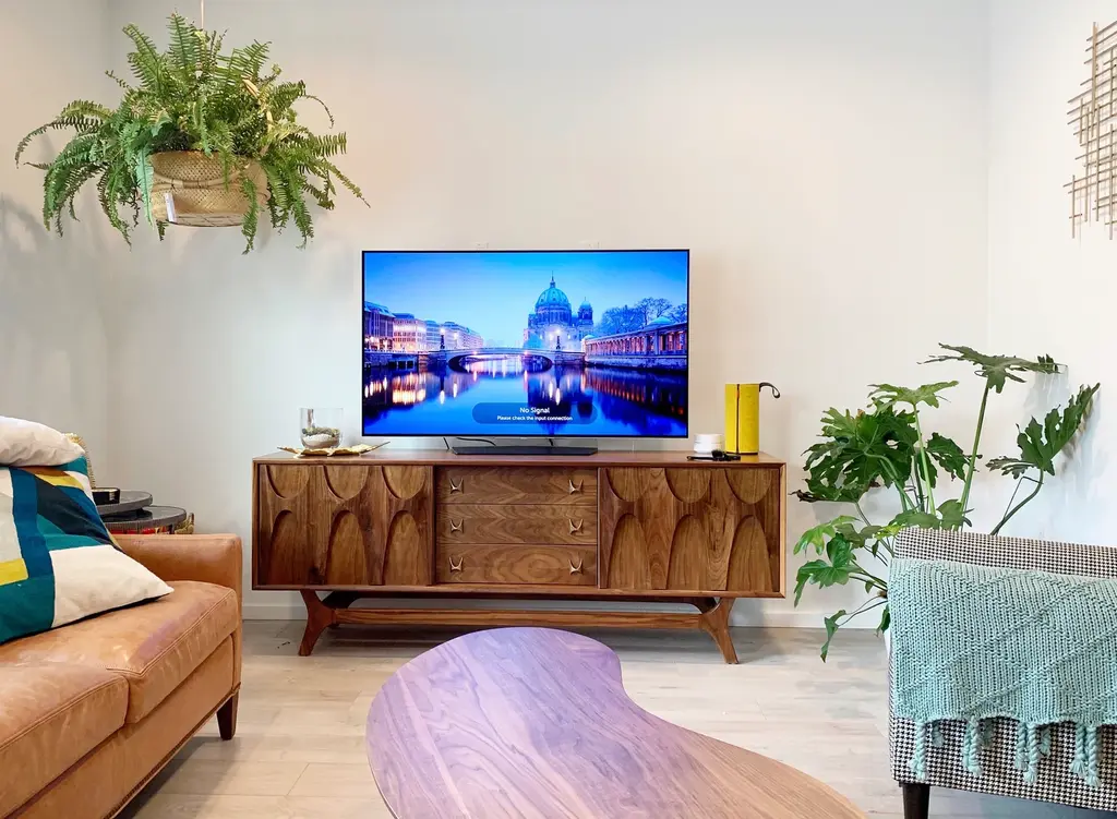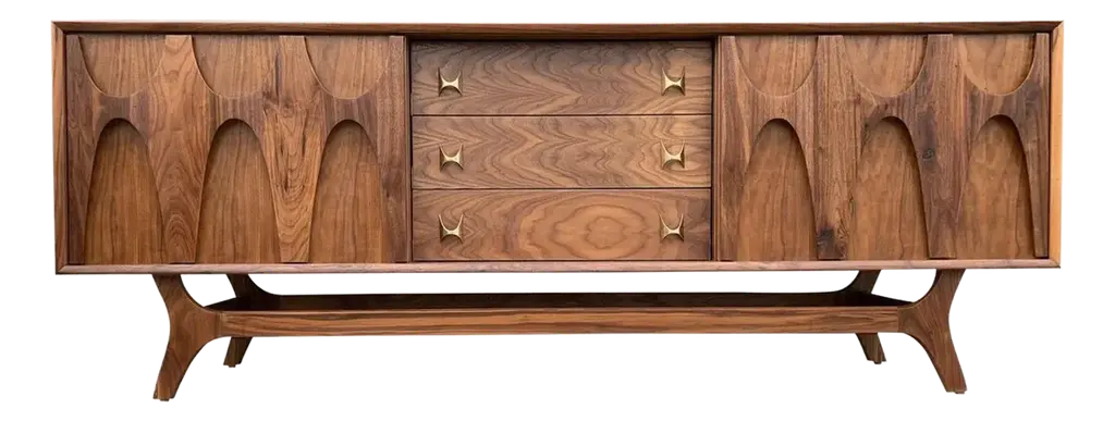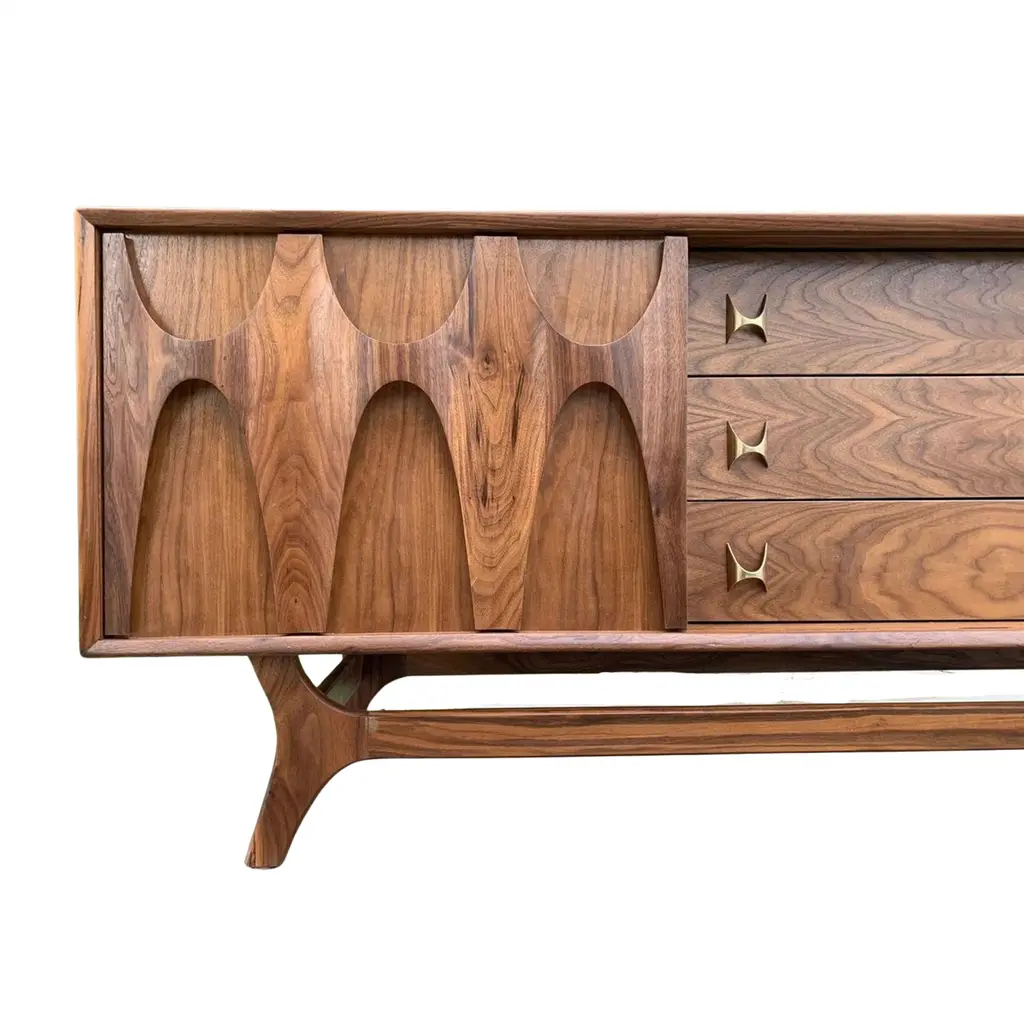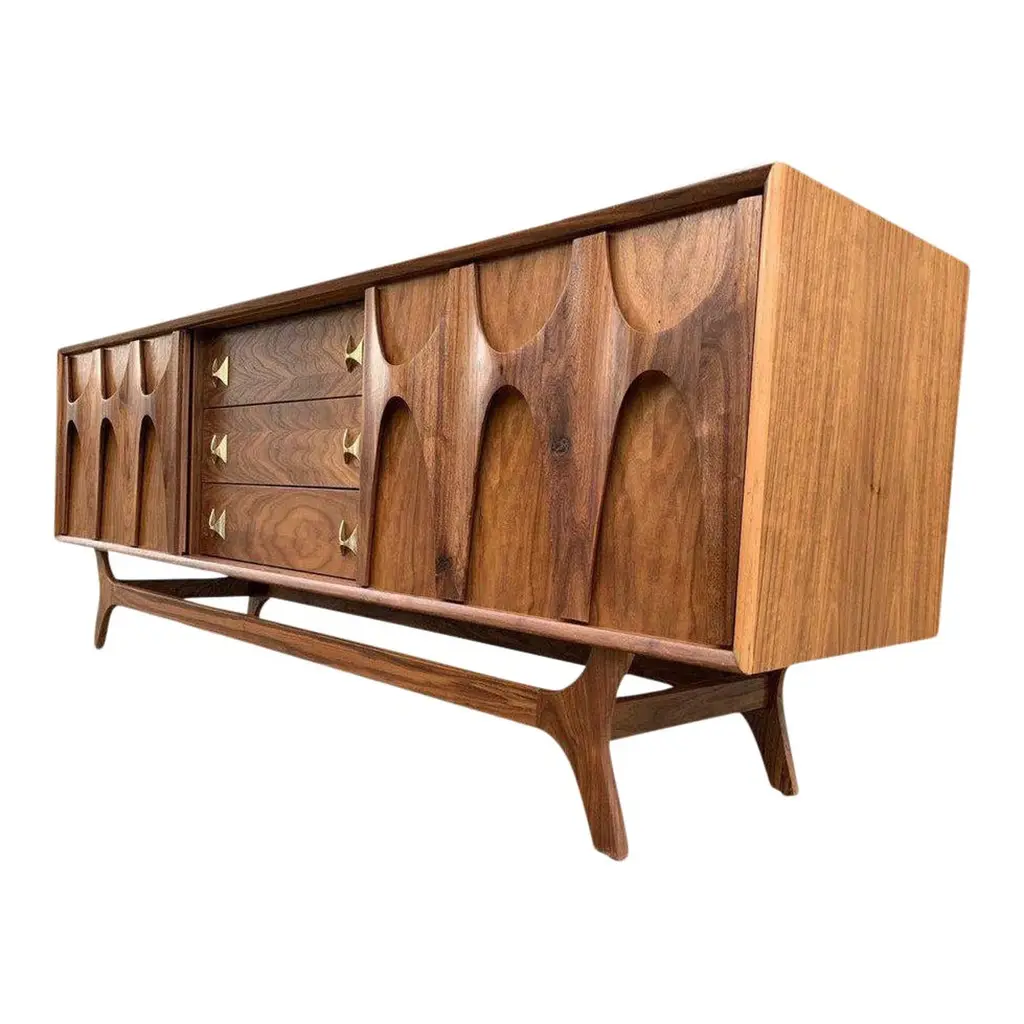 A stunning unique Mid Century Brasilia Style credenza sideboard. Features solid walnut hand carved sculptural doors. Credenza made of solid and walnut veneer, center drawers with brass colored pulls-adjustable shelves on each side. This piece is a hand crafted reproduction -made in California with natural wood tones and grain that may vary.
