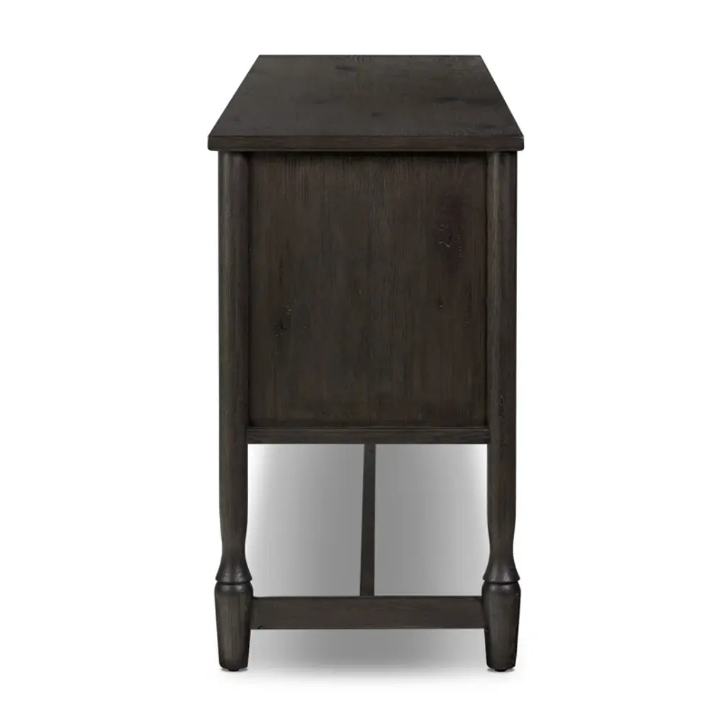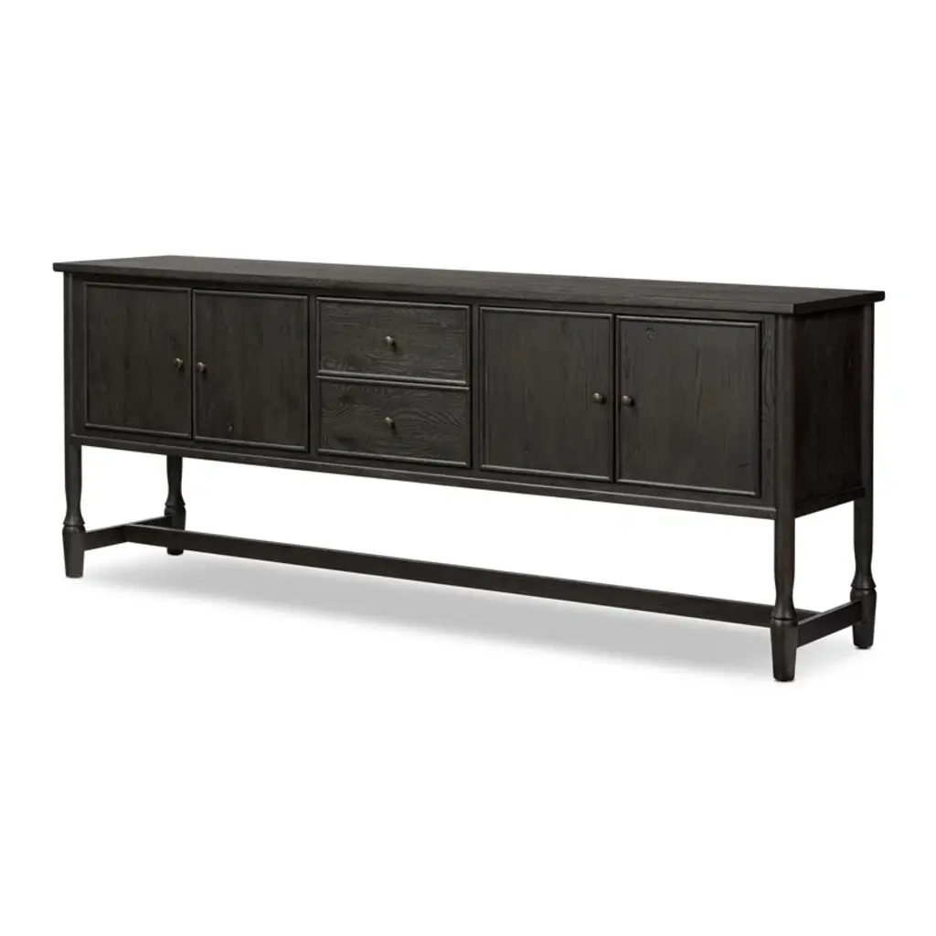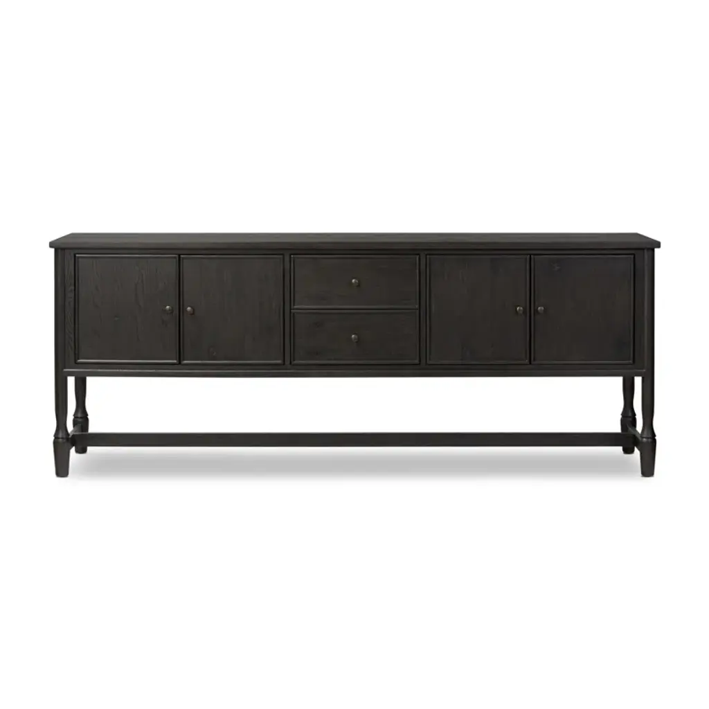 Small, rounded molding and turn shape legs — classic storage with an update. Configured with two drawers in the middle and two doors on either side with bronze hardware, this sideboard offers ample storage space with detailed design, finished to accent the rich characteristics of the wood. A design collaboration by Amber Lewis and Four Hands.
