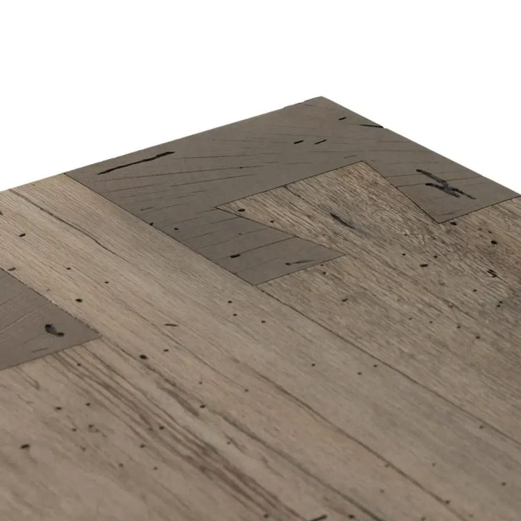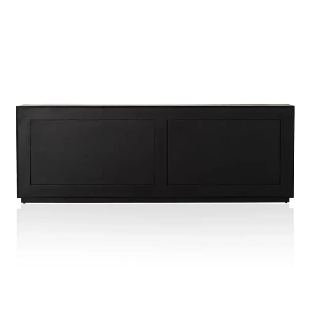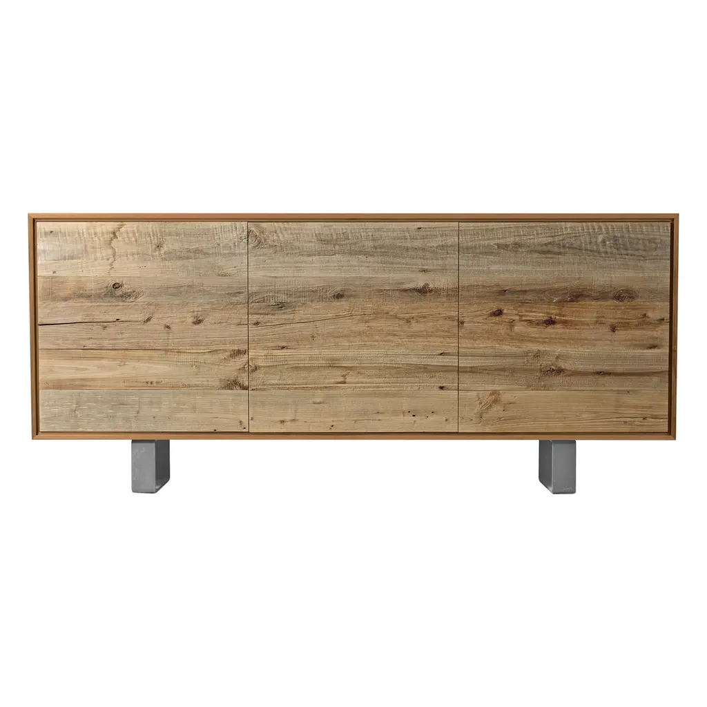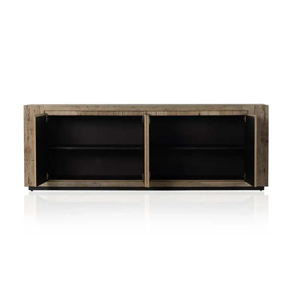 Made from thick-cut oak veneer with a faux rustic finish made to emulate wormwood, this low, large-scale sideboard features chunky squared legs.