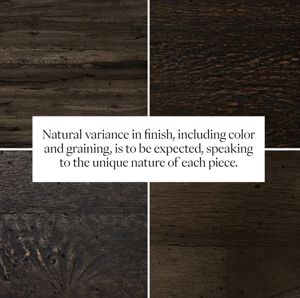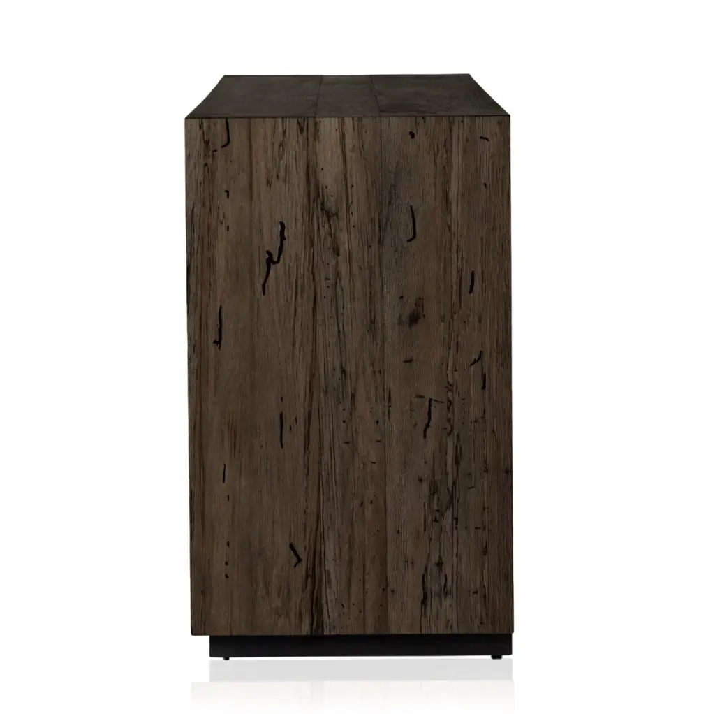 Constructed using a thick-cut oak veneer, this sideboard has a faux rustic finish that evokes the appearance of wormwood oak. The low, large-scale design is accented by chunky, squared legs and intricate dovetail joinery.