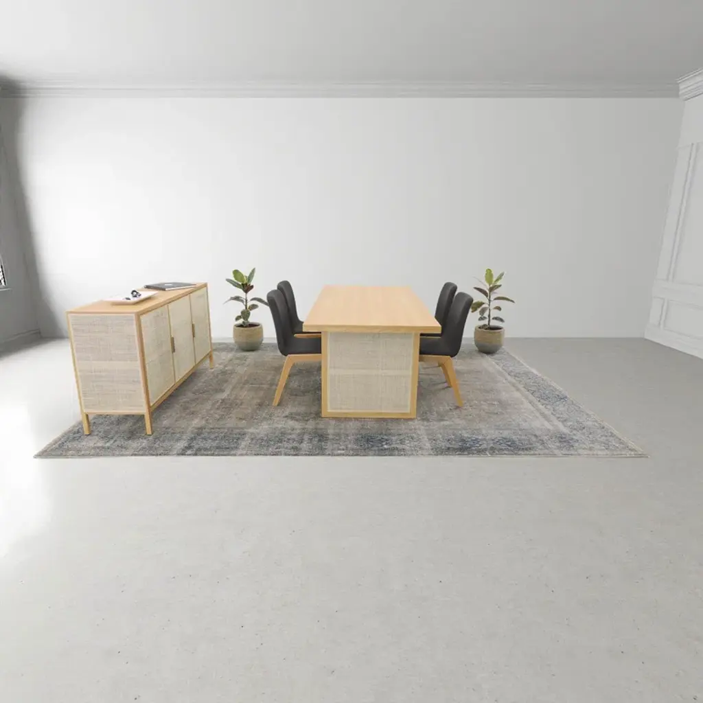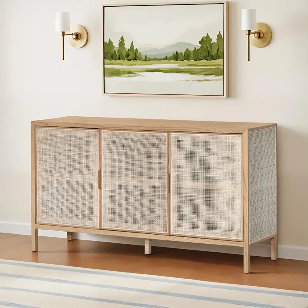 This sideboard is a beautiful and versatile piece that will add warmth and style to any room. This sideboard follows straightforward design principles and delivers a rustic and evocative style, with authentic wicker doors and sides that highlight the natural beauty of the sideboard. Crafted with care using oak and oak veneer, this sideboard measures 59.1W x 17.7H x 33.5D and has three easy-to-open doors that reveal four spacious storage spaces. This piece is perfect for storing linens, dishware, or any other household items.