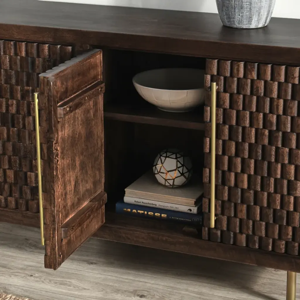 Embrace timeless design with this sideboard, crafted to bring warmth and sophistication to your space. Made from solid wood, it features intricate carved details and a rich finish that highlights its natural grain. This sideboard offers ample storage with its four doors, making it a versatile addition to dining rooms or living areas. Whether used to store dinnerware or as a display for cherished decor, its classic appeal is undeniable. Consider pairing it with other wood pieces for a cohesive look.