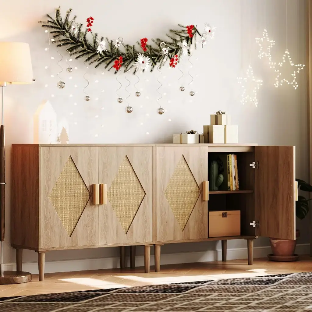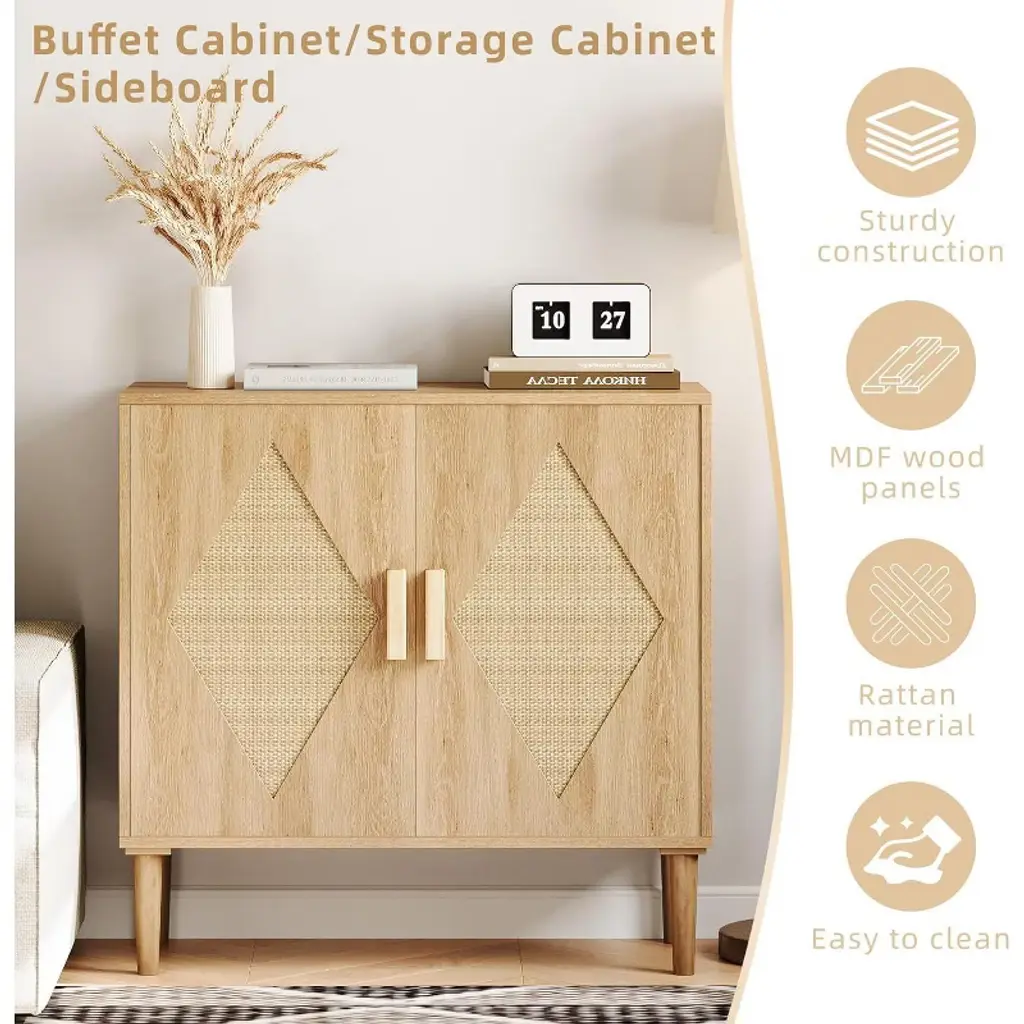 The Acekool Two-Piece Dining Sideboard combines natural elegance with versatile storage. Featuring handcrafted rattan doors set against a natural wood tone, it adds a cozy, bohemian vibe to any living or dining space. This piece adapts to various storage needs, serving as a sideboard for dining essentials, a TV stand, or a shoe cabinet while keeping your area tidy. Its adjustable middle shelf offers flexible storage options for items large and small. With dimensions of 31.5" length, 31.2" height, and 13.78" depth, the sideboard is designed to provide stable, long-lasting support with four solid legs. Assembly is user-friendly with detailed instructions and tools included. Specifications: Length: 31.5 inchesHeight: 31.2 inchesDepth: 13.78 inchesStorage: Double doors with adjustable middle shelfDesign: Handcrafted rattan panels with natural wood finishLegs: Four sturdy legs for stabilityAssembly: Included instructions and tools