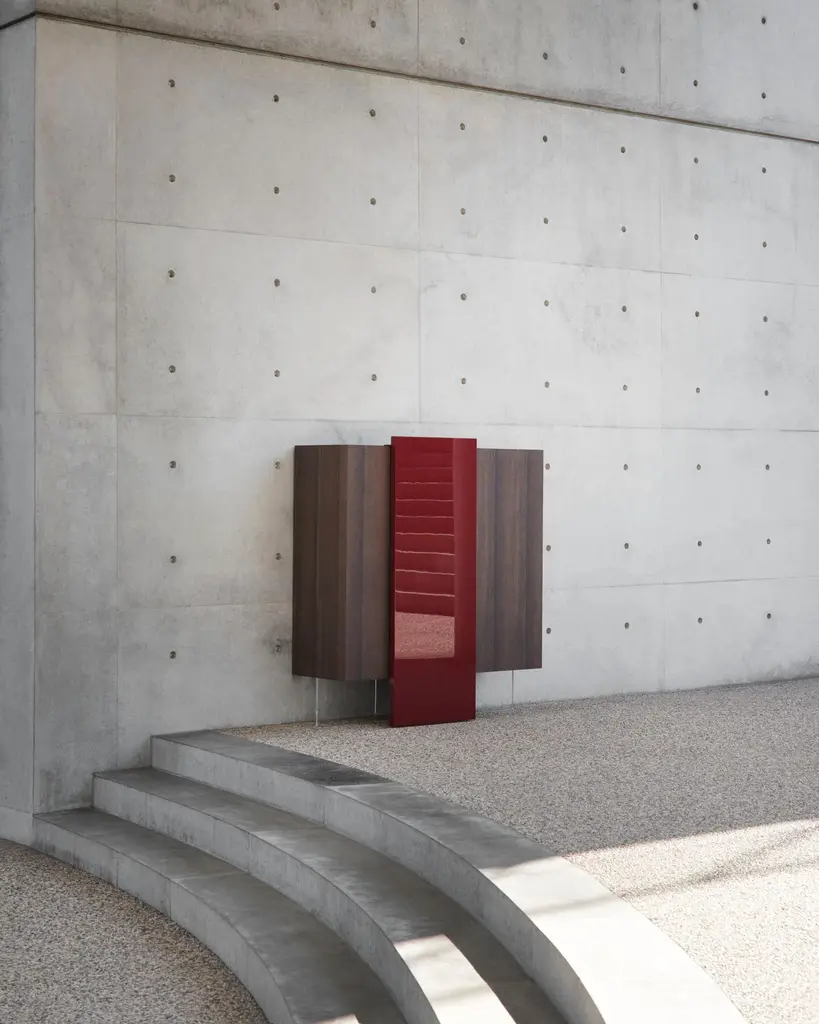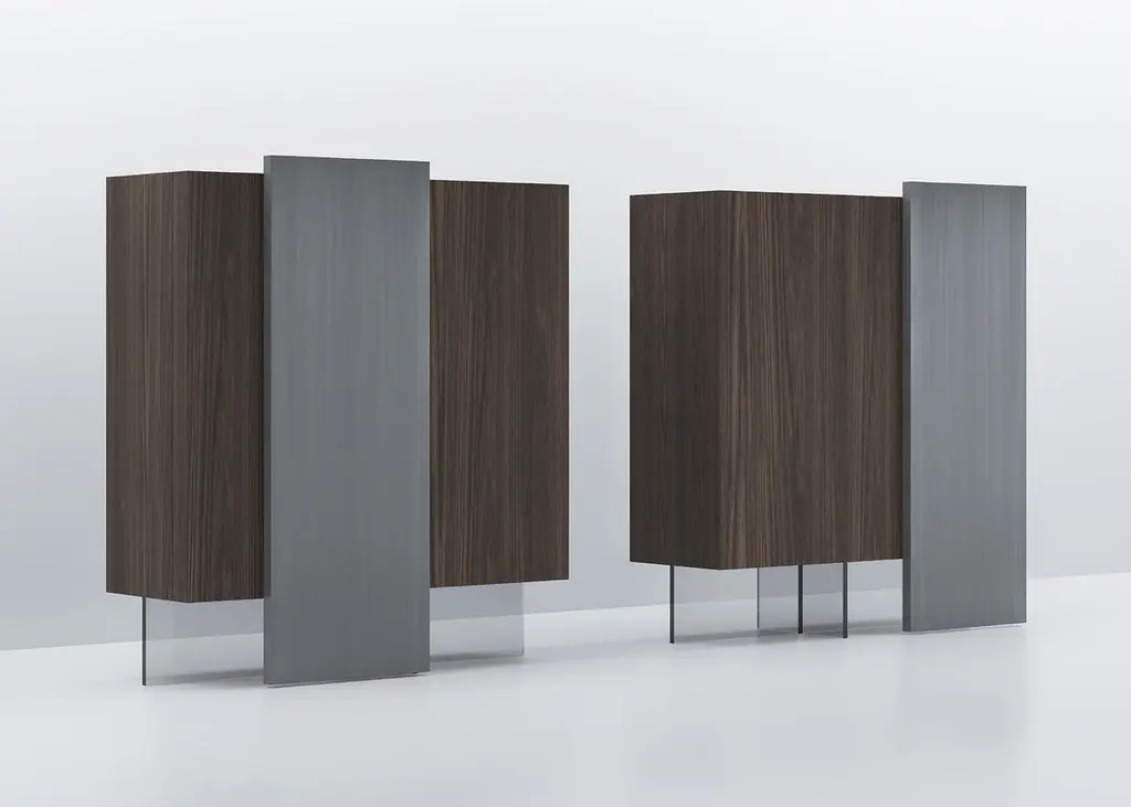 A pair of vertical sideboards that can stand alone or be paired, thanks to their different layout.Cabinet unit closed by two hinged doors and a sliding panel overlapping them to reveal a further compartment. The thick top integrates and hides the sliding system inside. Shelves included, in wood in the same finish (in the 76 cm compartment) and in transparent grey glass (in the 51 cm compartment).Self-supporting unit, it also has wall safety anchor at the back. Shipped disassembled.A family of sideboards, high and low, for dining or living rooms, characterized by the combination of different opening systems. The transparent methacrylate base creates a suspension effect and makes the sliding door seem to be the only support element, which at first appears to be fixed. The visual interval between the main monolithic body and the sliding panel is emphasized by the use of contrasting materials or finishes.Finishes:-Cabinet and hinged doors in veneer heat-treated Eucalyptus, black Eucalyptus, Swamp oak, Swamp ash () or lacquered matt or glossy finish in different colors. Interior always veneer in wooden versions, matt lacquered in lacquered versions.- Sliding door: Volcanic Earth finishes () colors Lipari white, Vesuvio brown, Etna grey,lacquered with brushed metal Nikel-15 () or glossy finish in different colors.Lacquered colors: Black, White, White SW, Ghiaia Grey, Pietra Grey, Fumo Grey, Lino, Sabbia, Warm Grey, Argilla, Red NY, Red Vico, Blue Iseo, Green Iseo.Swamp oak and Swamp ashSpecial veneer identified as a ''fossil'' since obtained from trunks found below ground, where they have been preserved under layers of clay for hundreds of years. The anaerobic environment inhibited the growth of microorganisms preventing the inexorable process of slow decay. On the contrary, over time the internal elements are transformed and others have been added: the mineral salts are combined with those present in the wood matrix, slowly transforming the organic state. This long natural process, which cannot be replicated, gives the wood a unique, precious appearance, with surprising colors and textures. The aging of the wood can also cause the formation of cracks and splits which are puttied and repaired but not eliminated during processing, because they are the signs of time that provide evidence of the great age and uniqueness of the material.Volcanic Earth finishesSpatulated finish done by hand using a volcanic earth-based microcement mixture protected with special resins, pleasing to the touch and wear resistant.Metallic brushed finishesA family of exclusive finishes, obtained by applying special paints, developed using nanotechnologies and containing true metallic micro-particles. Hand brushing creates infinite lines of colour and shade to give a precious, constantly unique effect.Born in Milan in 1981, Giacomo Moor, after graduating in Design with a final dissertation on wood published by Abitare, opened his studio with his partner. With his multidisciplinary team, designers and woodworkers, he designs products for companies, he creates limited editions for galleries, produces unique pieces for private clients, and he is engaged in every step of the process. Giacomo Moor unites the precision and the formal rigour of the design with the sensitivity of manual craftsmanship, his empirical and resolving approach, and his capacity to combine technical and aesthetical skills, managing the production process, are constant elements of his working method.Additional Information:Material: Wood, metalFrame finish: Glossy lacquered burgundy (LO88), Sliding door - Glossy lacquered brick red (LL24)Base: Transparent methacrylate.Dimensions: 135 W x 49.5 D x 150 H cm (B version - V031)Sliding door: L 55 cmAvailable in other frame finish options: Glossy lacquered white LL02, Glossy lacquered SW white LL09, Glossy lacquered linen LL10, Glossy lacquered sand LL12, Glossy lacquered clay LL15, Glossy lacquered mustard yellow LL23, Glossy lacquered burgundy LL20, Glossy lacquered pink LL21, Glossy lacquered dark green LL22, Glossy lacquered Navy blue LL25, Glossy lacquered black LL06, Matt lacquered white LO73, Matt lacquered SW white LO74, Matt lacquered linen LO75, Matt lacquered sand LO76, Matt lacquered clay LO81, Matt lacquered mustard yellow LO91, Matt lacquered brick red LO92, Matt lacquered pink LO89, Matt lacquered dark green LO90, Matt lacquered Navy blue LO93, Matt lacquered black LO72, Swamp ash ES57, Eucalyptus ES48, Black eucalyptus ES47, Dark stained walnut ES59, Glossy lacquered white LL02, Glossy lacquered SW white LL09, Glossy lacquered linen LL10, Glossy lacquered sand LL12, Glossy lacquered clay LL15, Glossy lacquered mustard yellow LL23, Glossy lacquered burgundy LL20, Glossy lacquered pink LL21, Glossy lacquered dark green LL22, Glossy lacquered Navy blue LL25, Glossy lacquered black LL06, Brushed metallic nickel 15 - matt lacquered LMO90, Volcanic earth Vesuvio brown TV02, Volcanic earth Etna grey TV01, Volcanic earth Lipari white TV03Available in other version: A version - V038Available in other various options