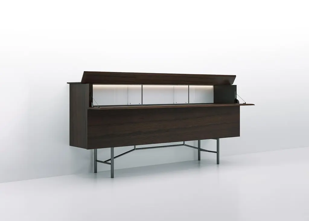 Particularly high buffet, of great storage capacity, characterized by the unusual horizontal division into two compartments with different heights, closed by two large flap doors of finely tapered edges. The upper compartment adopts an evolution of the innovative Dual-Flap® opening system (Acerbis patent). In just one simple gesture the front panel tilts down, while part of the top rises to reveal the full contents of the unit, backlit by a LED illuminated white methacrylate rear panel. The upper door, once open, offers a bearing surface at an especially convenient height for serving. Doors and top are matt lacquered, glossy lacquered or veneered. External sides are matt lacquered or veneered. Matt Slate Grey lacquered interior, dividers and back-lit rear panel in matt metahacrylate. LED lighting system with automatic switching on at door opening. Transparent glass shelves. Metal base with brushed nickel finish.Finishes- Lacquered colours: Black, White, White SW, Ghiaia Grey, Pietra Grey, Fumo Grey, Lino, Sabbia, Warm Grey, Argilla, Red NY, Red Vico, Blue Iseo, Green Iseo.- Veneers: brown oak, lauro preto, thermo-treated eucalyptus, black eucalyptus.Born on 13 November 1957, Massimo Castagna graduated in architecture in 1984 from Milan Politecnico; he began his professional activities in 1986, founding the studio AD architettura. He has gained considerable professional experience in the field of architecture, interior design, art direction and design in the furnishing sector. One of his major creations has been the “Piramide” laboratory the Everest-K2-CNR scientific committee for the Italian National Research Council, which was built in Nepal beginning in 1991 at an altitude of 5050 m., to be used as a high-altitude research laboratory, a project selected for the 18th Milan Triennale.Additional Information:Material: Wood, steelFrame finish: Black eucalyptus ES47Base finish: Micaceous grey paintedDimensions: 250 W x 48 D x 111 H cmAvailable in other frame finish options: Glossy lacquered white LL02, Glossy lacquered SW white LL09, Glossy lacquered linen LL10, Glossy lacquered sand LL12, Glossy lacquered clay LL15, Glossy lacquered mustard yellow LL23, Glossy lacquered brick red LL24, Glossy lacquered burgundy LL20, Glossy lacquered pink LL21, Glossy lacquered dark green LL22, Glossy lacquered Navy blue LL25, Glossy lacquered black LL06, Matt lacquered white LO73, Matt lacquered SW white LO74, Matt lacquered linen LO75, Matt lacquered sand LO76, Matt lacquered clay LO81, Matt lacquered mustard yellow LO91, Matt lacquered brick red LO92, Matt lacquered burgundy LO88, Matt lacquered pink LO89, Matt lacquered dark green LO90, Matt lacquered Navy blue LO93, Matt lacquered black LO72, Eucalyptus ES48Available in other size option: SmallAvailable in other versions:Power cable kit - Power cable with lucid LED power supply unit and touch switch a power supply unit must be added for each composition up to 240 cm, power supply unit 220-110 VOptional drawer - Max 1 per compartment, slate grey matt lacquer finishAvailable in other various options.