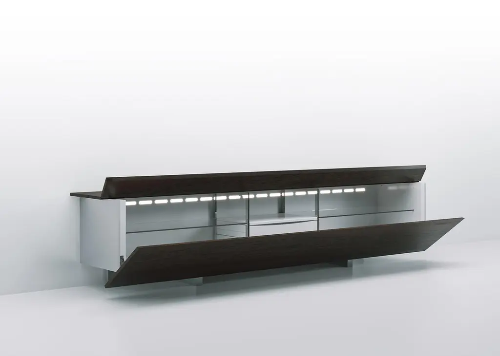 Sideboard featuring the innovative Dual-Flap® simultaneous opening system for both the door and part of the top. Door made from an ultra-light honeycomb panel with the same finish as the top. Interior and backing panel of white lacquered wood and white melamine coated wood. The backing panel, which goes down to the floor, offers great stability and also hides any sockets or electrical cables. Internal frame in shiny chrome-plated metal. External sides in shiny stainless steel. Feet in shiny stainless steel. The standard fitting includes a lighting system with a single switch and power cable. Bulbs: CE standard, freely available on the market. 240/220 V, available 110V. 3 clear glass shelves included in the price. Drawers are optional.Finish of top and door:- Matt or glossy lacquered in colours: Black, White, White SW, Ghiaia Grey, Pietra Grey, Fumo Grey, Lino, Sabbia, Warm Grey, Argilla, Red NY, Red Vico, Blue Iseo, Green Iseo.- Veneers: brown oak, lauro preto, flame-grained olive ash (1), ebony, thermo-treated eucalyptus, black eucalyptus.(1) Flame-grained olive-ash finish is manufactured carefully selecting and pairing one-piece veneer sheets on door and top. Therefore every item is unique and always characterized by a different and natural wood pattern.Each item is delivered disassembled with preassembled parts and electrical connections for easy installation.Lodovico Acerbis was born in Albino, Bergamo in 1939 and graduated in Economics and Business in Milan. In 1963 he joined his father’s company with the aim of creating design furniture by applying the most advanced technologies and the best materials. Founded in 1870, as a carpentry workshop, the company under his direction reached industrial dimensions and established itself as a leading company in the sector. Lodovico Acerbis combined his work as an industrialist with that of a designer, producing some of the most significant creations of Italian production, often signed together with Giotto Stoppino, with whom he created a fervent creative partnership.Additional Information:Material: Wood, steelFrame finish: Eucalyptus ES48Side finish: Shiny steel MT01Interior finish: Matt whiteDimensions: 290 W x 55 D x 63 H cmAvailable in other frame finish options: Glossy lacquered white LL02, Glossy lacquered SW white LL09, Glossy lacquered linen LL10, Glossy lacquered sand LL12, Glossy lacquered clay LL15, Glossy lacquered mustard yellow LL23, Glossy lacquered brick red LL24, Glossy lacquered burgundy LL20, Glossy lacquered pink LL21, Glossy lacquered dark green LL22, Glossy lacquered Navy blue LL25, Glossy lacquered black LL06, Matt lacquered white LO73, Matt lacquered SW white LO74, Matt lacquered linen LO75, Matt lacquered sand LO76, Matt lacquered clay LO81, Matt lacquered mustard yellow LO91, Matt lacquered brick red LO92, Matt lacquered burgundy LO88, Matt lacquered pink LO89, Matt lacquered dark green LO90, Matt lacquered Navy blue LO93, Matt lacquered black LO72, Black eucalyptus ES47, Ebony ES46Available in other size option: 220x55 cmAvailable in other versions:Pair of drawers in white lacquered wood with grey fabric-lined bottomPower cable kitAvailable in other various options