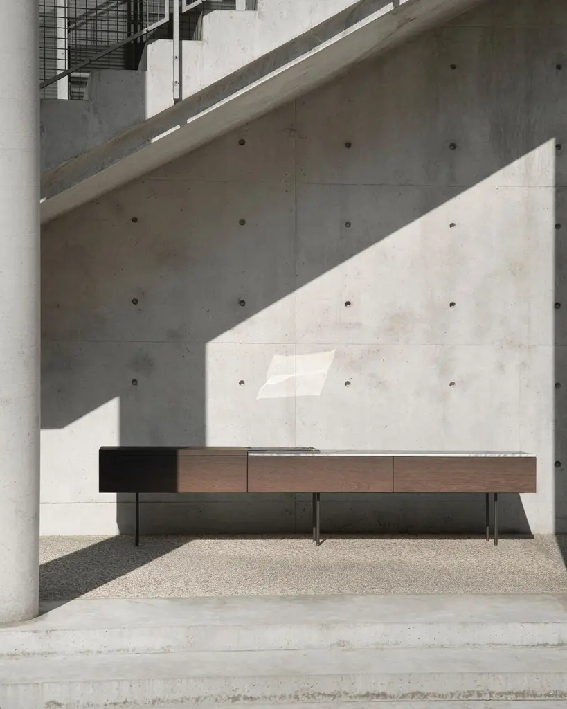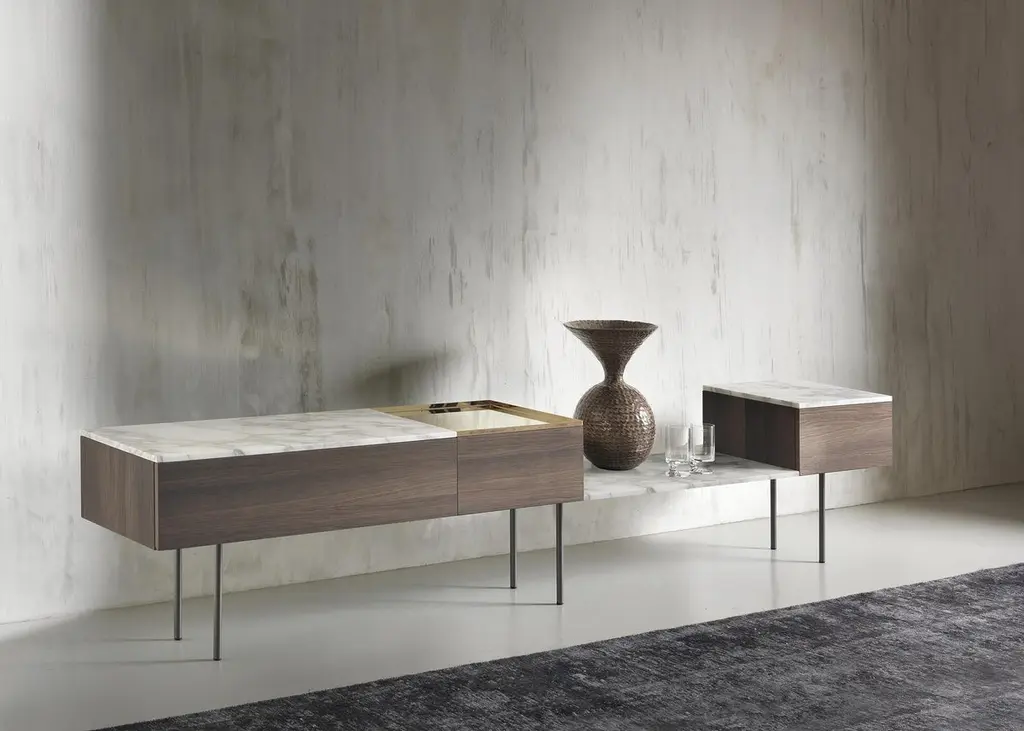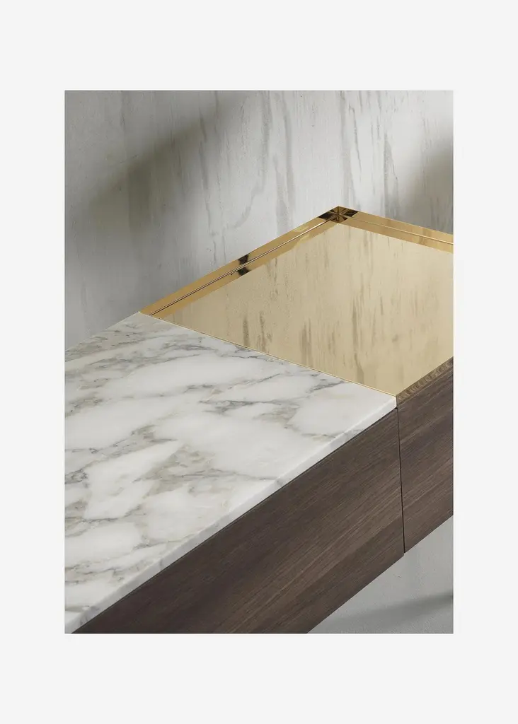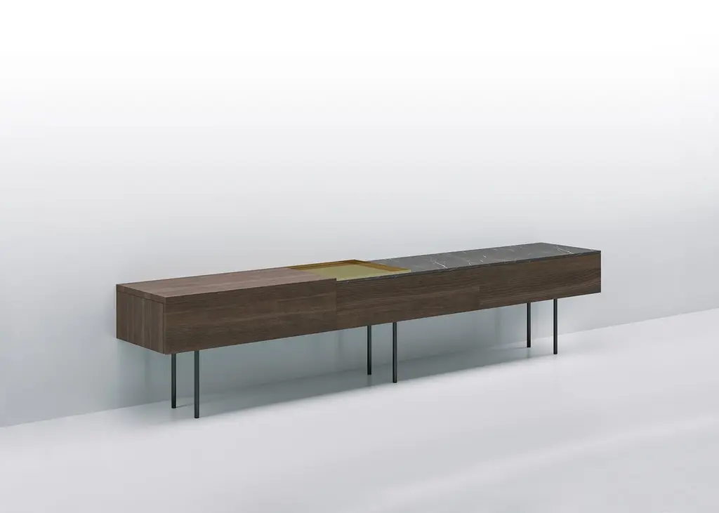 Low modular console resting on a structure of volumes and shelves in different contrasting materials: wood, marble, shiny metals, giving life to compositions in which full and empty volumes and materials differing by type, color nuances, texture and thickness alternate with each other.A polished metal tray, the thickness of which is designed to match perfectly with the different thicknesses of the table tops, can be added as a valet or utility tray. Dark matte grey painted support structure and feet. Shipped disassembled.Finishes:- Wood tops, thickness 30 mm, Swamp Oak or Swamp Ash- Marble tops, thickness 15 mm, white arabesque or grey graphite, matte finish- Tray, thickness 15 mm, in polished steel or brass- Cabinets and drawers in wood with matte slate grey finish interior.() Swamp oak and Swamp ashSpecial veneer identified as a ''fossil'' since obtained from trunks found below ground, where they have been preserved under layers of clay for hundreds of years. The anaerobic environment inhibited the growth of microorganisms preventing the inexorable process of slow decay. On the contrary, over time the internal elements are transformed and others have been added: the mineral salts are combined with those present in the wood matrix, slowly transforming the organic state. This long natural process, which cannot be replicated, gives the wood a unique, precious appearance, with surprising colors and textures. The aging of the wood can also cause the formation of cracks and splits which are puttied and repaired but not eliminated during processing, because they are the signs of time that provide evidence of the great age and uniqueness of the material.Born in Florence, Massimo Mariani lives and works in London. He studied architecture with Giancarlo De Carlo at the University of Genoa. After graduation he joined Renzo Piano Building Workshop in Genoa and later Herman Hertzberger Architectuurstudio in Amsterdam. He moved to London in 2001 to work freelance on architectural projects and urban renewal schemes throughout the United Kingdom. In 2006 he established his own private activity focusing on architecture and industrial design.Additional information:Material: Wood, Marble, SteelTop finish: Matt graphite grey marble MR03, Dark stained walnut ES59Tray finish: Satin polished steel - brass effect MT03Frame finish: Micaceous grey paintedDimensions: 240 W x 40 D x 53 H cm (C240-4)Available in other top finish options: Matt white arabesque marble MR02, Swamp ash ES57Available in other tray finish option: Shiny steel MT01Available in other size options: 240x40x51.5 (C240-1, C240-2, C240-3)