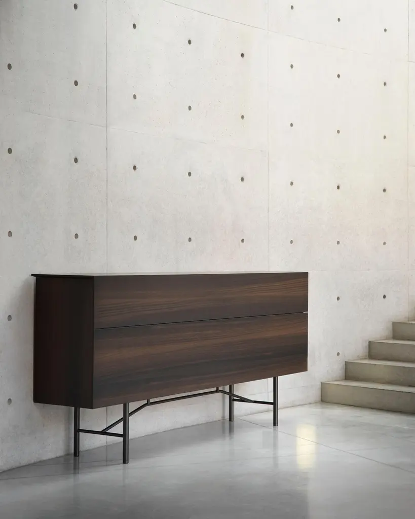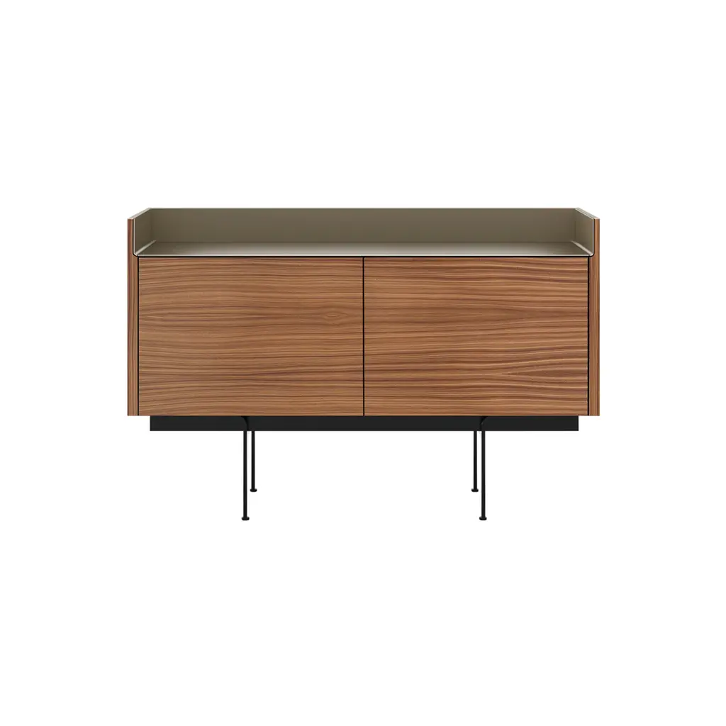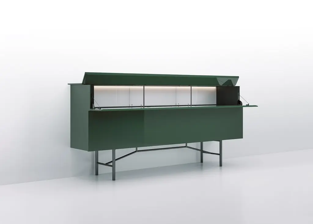 Particularly high buffet, of great storage capacity, characterized by the unusual horizontal division into two compartments with different heights, closed by two large flap doors of finely tapered edges. The upper compartment adopts an evolution of the innovative Dual-Flap® opening system (Acerbis patent). In just one simple gesture the front panel tilts down, while part of the top rises to reveal the full contents of the unit, backlit by a LED illuminated white methacrylate rear panel. The upper door, once open, offers a bearing surface at an especially convenient height for serving. Doors and top are matt lacquered, glossy lacquered or veneered. External sides are matt lacquered or veneered. Matt Slate Grey lacquered interior, dividers and back-lit rear panel in matt metahacrylate. LED lighting system with automatic switching on at door opening. Transparent glass shelves. Metal base with brushed nickel finish.Finishes- Lacquered colours: Black, White, White SW, Ghiaia Grey, Pietra Grey, Fumo Grey, Lino, Sabbia, Warm Grey, Argilla, Red NY, Red Vico, Blue Iseo, Green Iseo.- Veneers: brown oak, lauro preto, thermo-treated eucalyptus, black eucalyptus.Born on 13 November 1957, Massimo Castagna graduated in architecture in 1984 from Milan Politecnico; he began his professional activities in 1986, founding the studio AD architettura. He has gained considerable professional experience in the field of architecture, interior design, art direction and design in the furnishing sector. One of his major creations has been the “Piramide” laboratory the Everest-K2-CNR scientific committee for the Italian National Research Council, which was built in Nepal beginning in 1991 at an altitude of 5050 m., to be used as a high-altitude research laboratory, a project selected for the 18th Milan Triennale.Additional Information:Material: Wood, steelFrame finish: Glossy lacquered dark green LL22Base finish: Micaceous grey paintedDimensions: 190 W x 48 D x 111 H cmAvailable in other frame finish options: Glossy lacquered white LL02, Glossy lacquered SW white LL09, Glossy lacquered linen LL10, Glossy lacquered sand LL12, Glossy lacquered clay LL15, Glossy lacquered mustard yellow LL23, Glossy lacquered brick red LL24, Glossy lacquered burgundy LL20, Glossy lacquered pink LL21, Glossy lacquered Navy blue LL25, Glossy lacquered black LL06, Matt lacquered white LO73, Matt lacquered SW white LO74, Matt lacquered linen LO75, Matt lacquered sand LO76, Matt lacquered clay LO81, Matt lacquered mustard yellow LO91, Matt lacquered brick red LO92, Matt lacquered burgundy LO88, Matt lacquered pink LO89, Matt lacquered dark green LO90, Matt lacquered Navy blue LO93, Matt lacquered black LO72, Eucalyptus ES48, Black eucalyptus ES47Available in other size option: LargeAvailable in other versions:Power cable kit - Power cable with lucid LED power supply unit and touch switch a power supply unit must be added for each composition up to 240 cm, power supply unit 220-110 VOptional drawer - Max 1 per compartment, slate grey matt lacquer finishAvailable in other various options