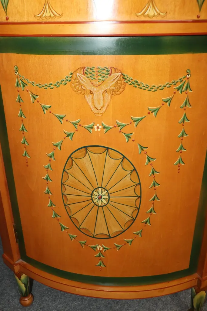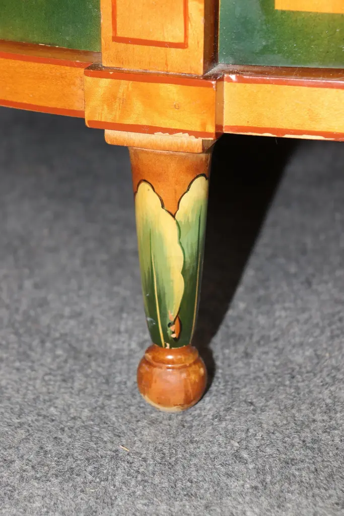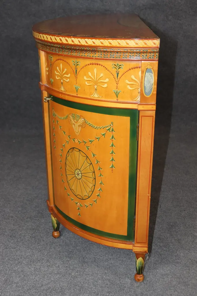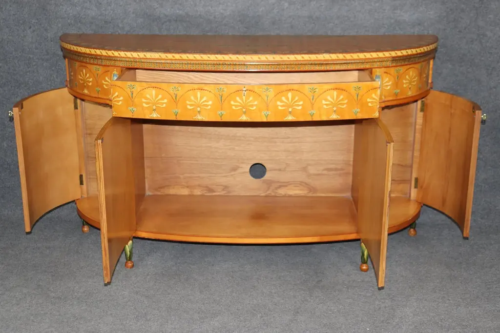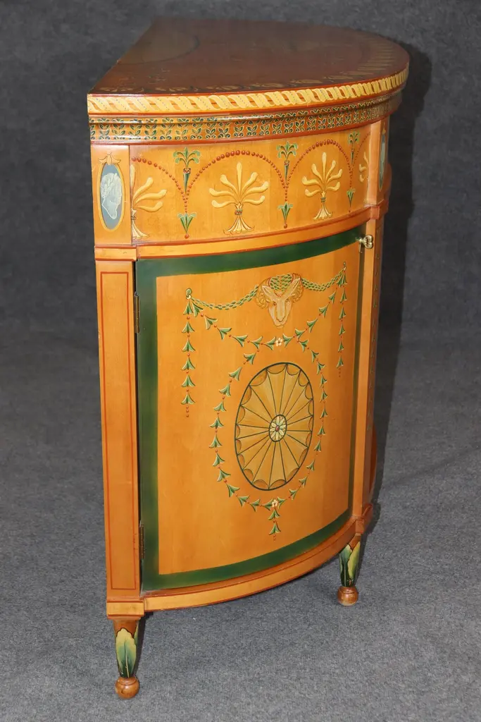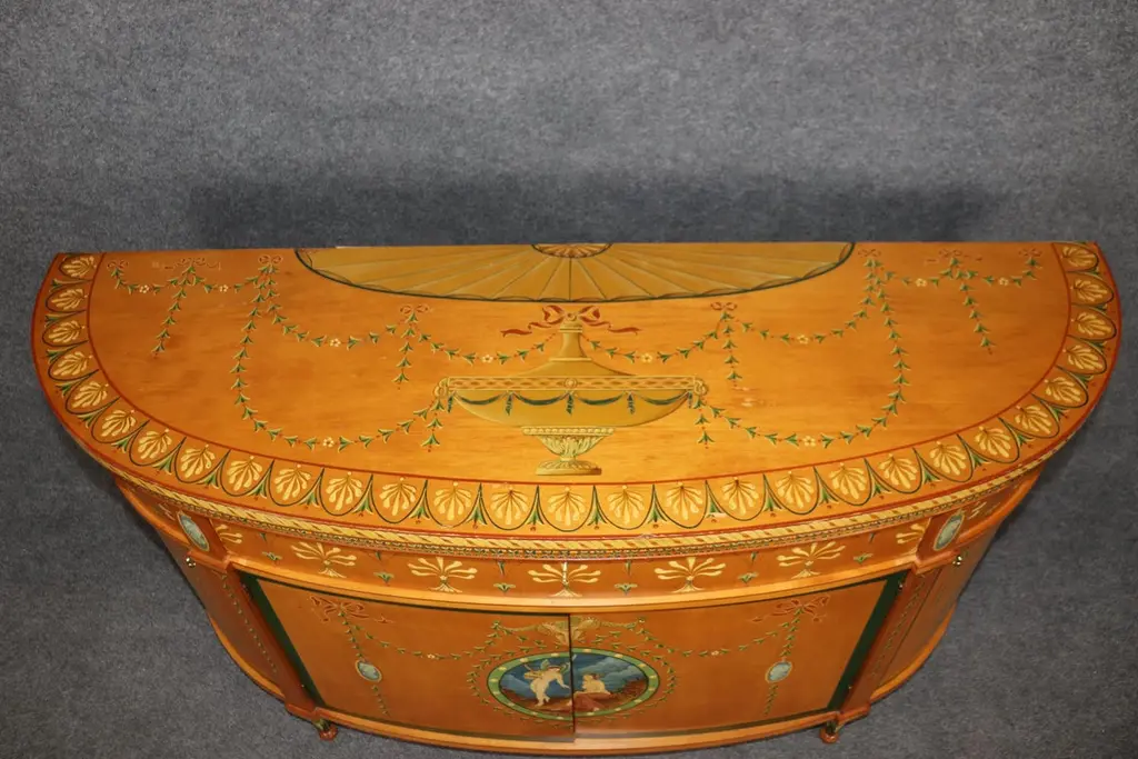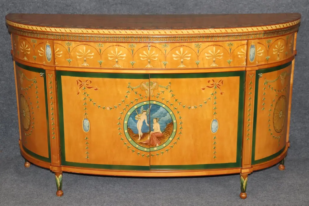 Dimensions - H: 34 3/4 in W: 60 in D: 19 inThis Adams Style Paint Decorated Demilune Sideboard or server, crafted by Historic New England, is a beautifully designed and intricately detailed piece that showcases the style and elegance of 18th-century English craftsmanship. The sideboard follows the neoclassical principles of the Adams style, which is characterized by its graceful proportions, refined decoration, and emphasis on symmetry.The demilune shape, with its half-moon form, gives the piece a sense of movement and fluidity, making it an ideal addition to any entryway, dining room, or formal space. The rich paint decoration adds to its visual interest, with delicate, hand-painted floral motifs and subtle geometric patterns, which recall the sophisticated artistry of Adams furniture. The carefully chosen color palette, typically featuring soft hues like creams, greens, and muted gold, enhances the sideboard's timeless appeal.Designed not only for its aesthetic qualities but also for its functional utility, the server offers ample storage space, often with drawers and cabinets, ideal for keeping dinnerware, linens, or other dining essentials neatly organized. The elegant, slender legs tapering down from the body of the sideboard/server elevate the piece, giving it an air of lightness and grace. This piece is perfect for use in any entryway, livingroom dining room or bedroom and can be used functionally on a daily basis! The piece is in good vintage condition with the exception of some finish loss and minor light surface scratches and chips as to be expected with items of age and use. otherwise good condition. If you have any other questions please do not hesitate to reach out and ask!- D&P Luxuries