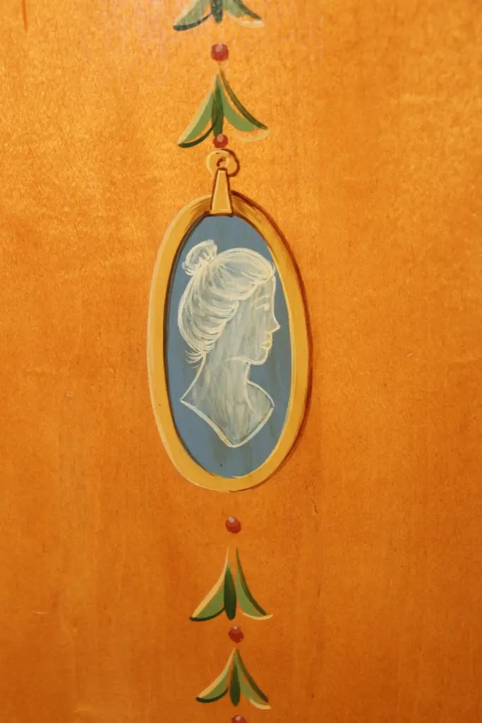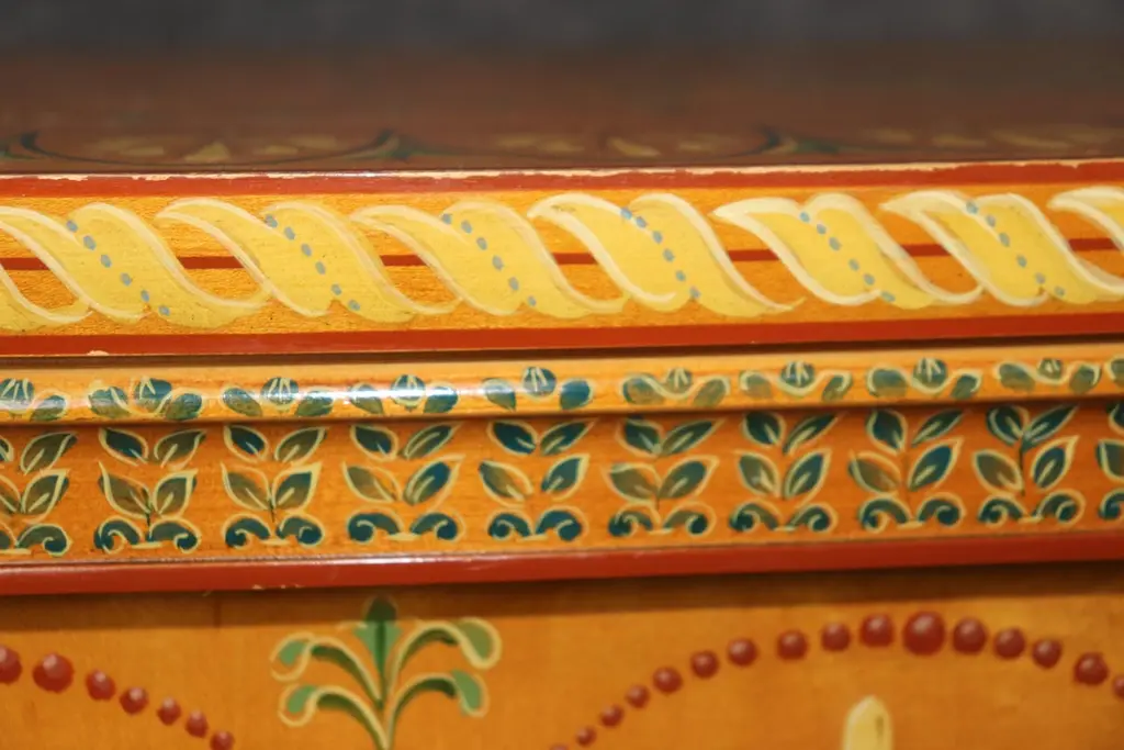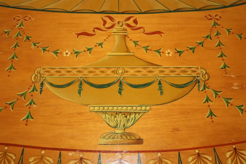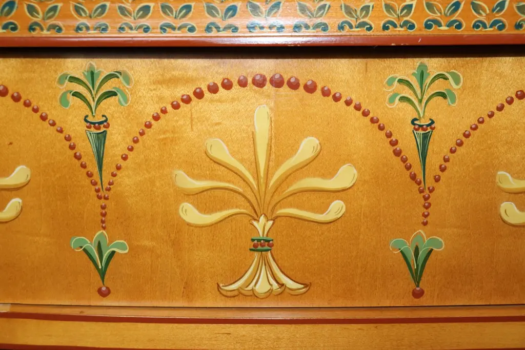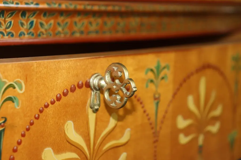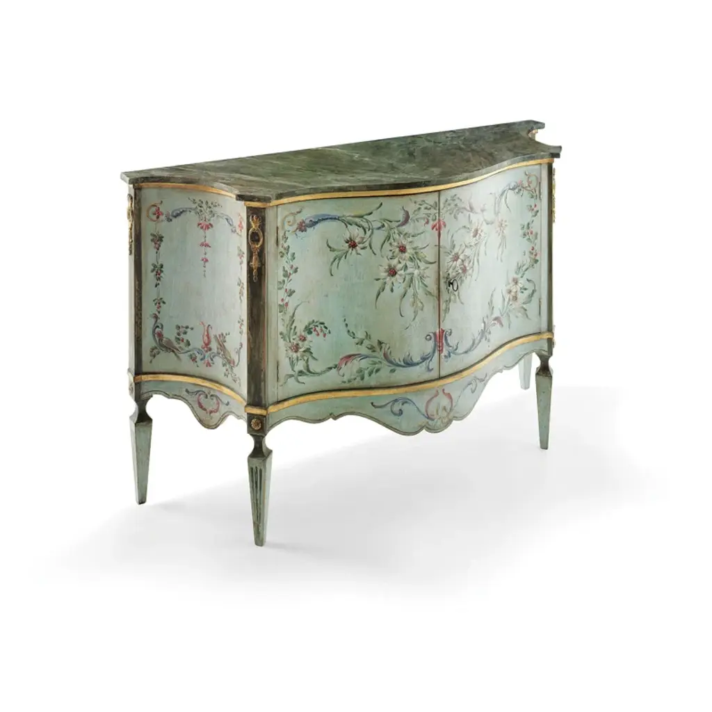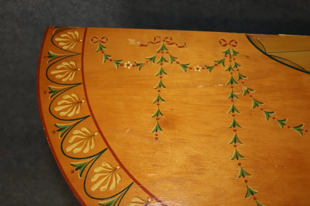 Dimensions - H: 34 3/4 in W: 60 in D: 19 inThis Adams Style Paint Decorated Demilune Sideboard or server, crafted by Historic New England, is a beautifully designed and intricately detailed piece that showcases the style and elegance of 18th-century English craftsmanship. The sideboard follows the neoclassical principles of the Adams style, which is characterized by its graceful proportions, refined decoration, and emphasis on symmetry.The demilune shape, with its half-moon form, gives the piece a sense of movement and fluidity, making it an ideal addition to any entryway, dining room, or formal space. The rich paint decoration adds to its visual interest, with delicate, hand-painted floral motifs and subtle geometric patterns, which recall the sophisticated artistry of Adams furniture. The carefully chosen color palette, typically featuring soft hues like creams, greens, and muted gold, enhances the sideboard's timeless appeal.Designed not only for its aesthetic qualities but also for its functional utility, the server offers ample storage space, often with drawers and cabinets, ideal for keeping dinnerware, linens, or other dining essentials neatly organized. The elegant, slender legs tapering down from the body of the sideboard/server elevate the piece, giving it an air of lightness and grace. This piece is perfect for use in any entryway, livingroom dining room or bedroom and can be used functionally on a daily basis! The piece is in good vintage condition with the exception of some finish loss and minor light surface scratches and chips as to be expected with items of age and use. otherwise good condition. If you have any other questions please do not hesitate to reach out and ask!- D&P Luxuries