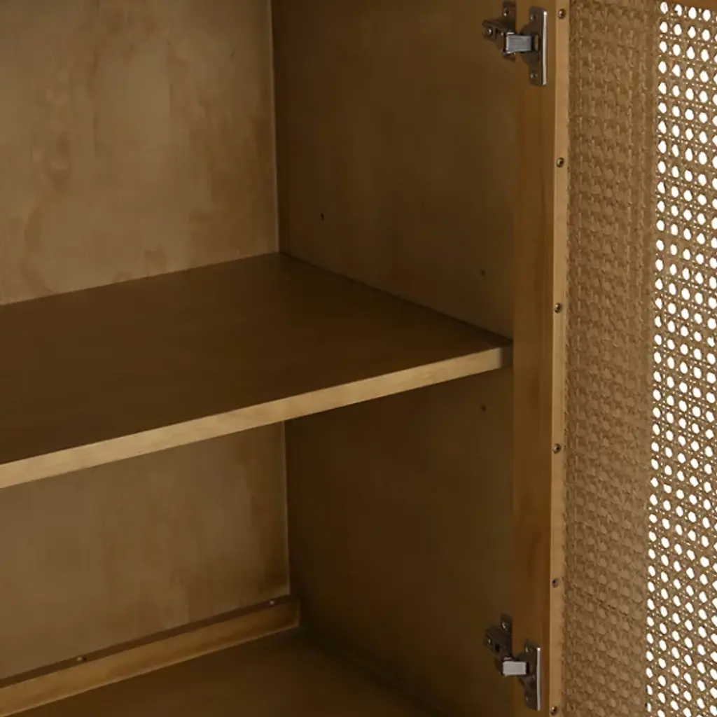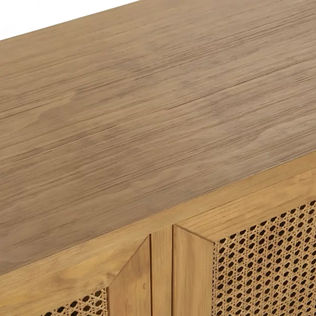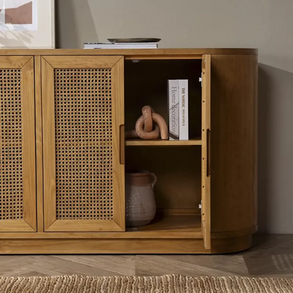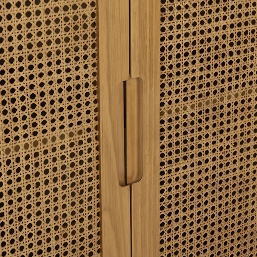 The Adelheid Sideboard from Classic Home combines pine wood construction with natural cane door panels that introduce texture and warmth to storage solutions. This media-ready cabinet features integrated wire management holes and adjustable shelving that adapts to your organizational needs. The cut-out handles maintain clean lines while providing easy access to the interior compartments. Constructed from pine veneer, it ensures lasting durability, while the cane detailing adds an organic element that softens the overall design. This piece balances practical storage with natural materials in a refined package.