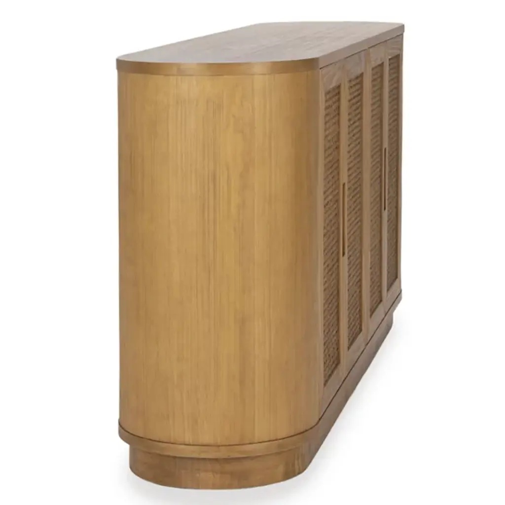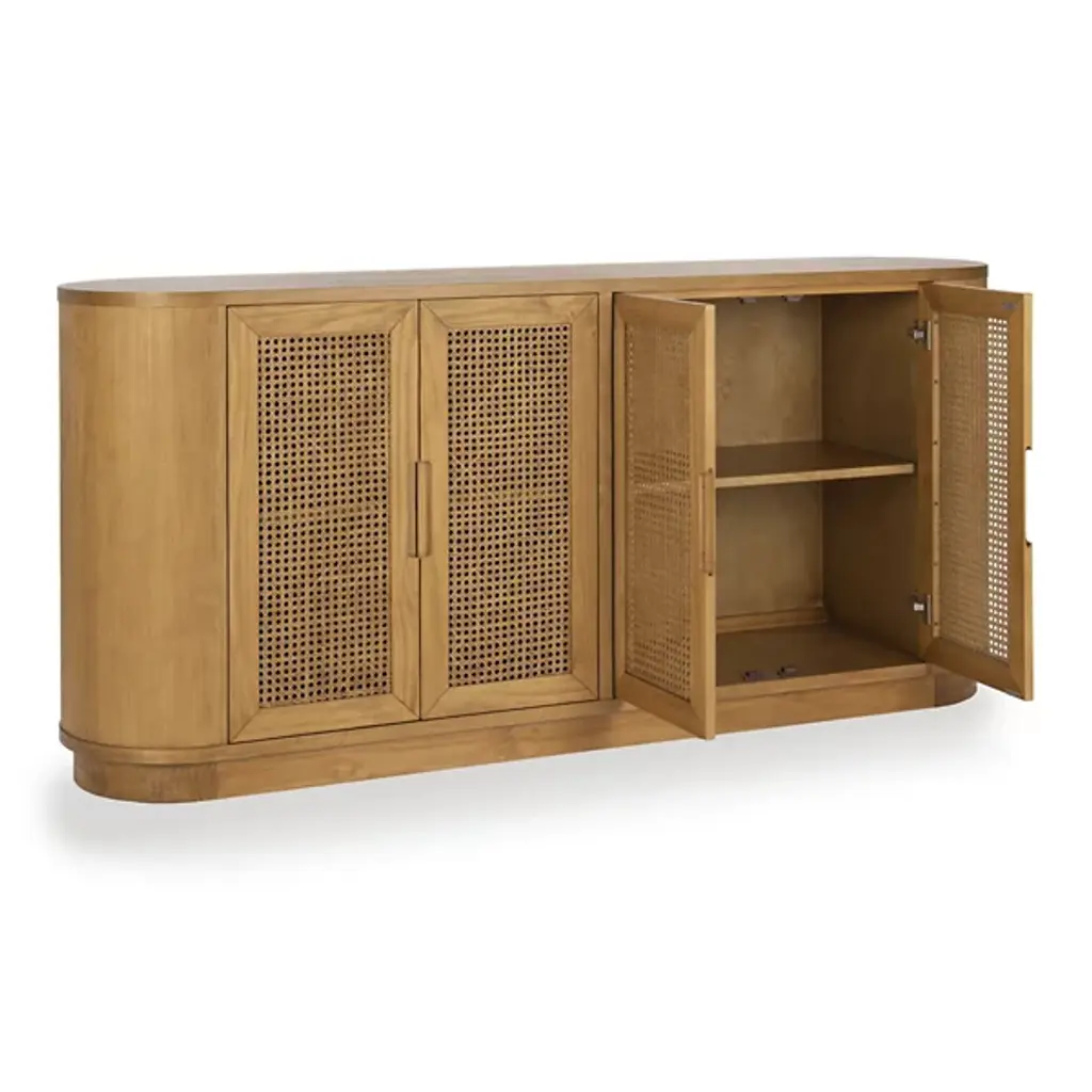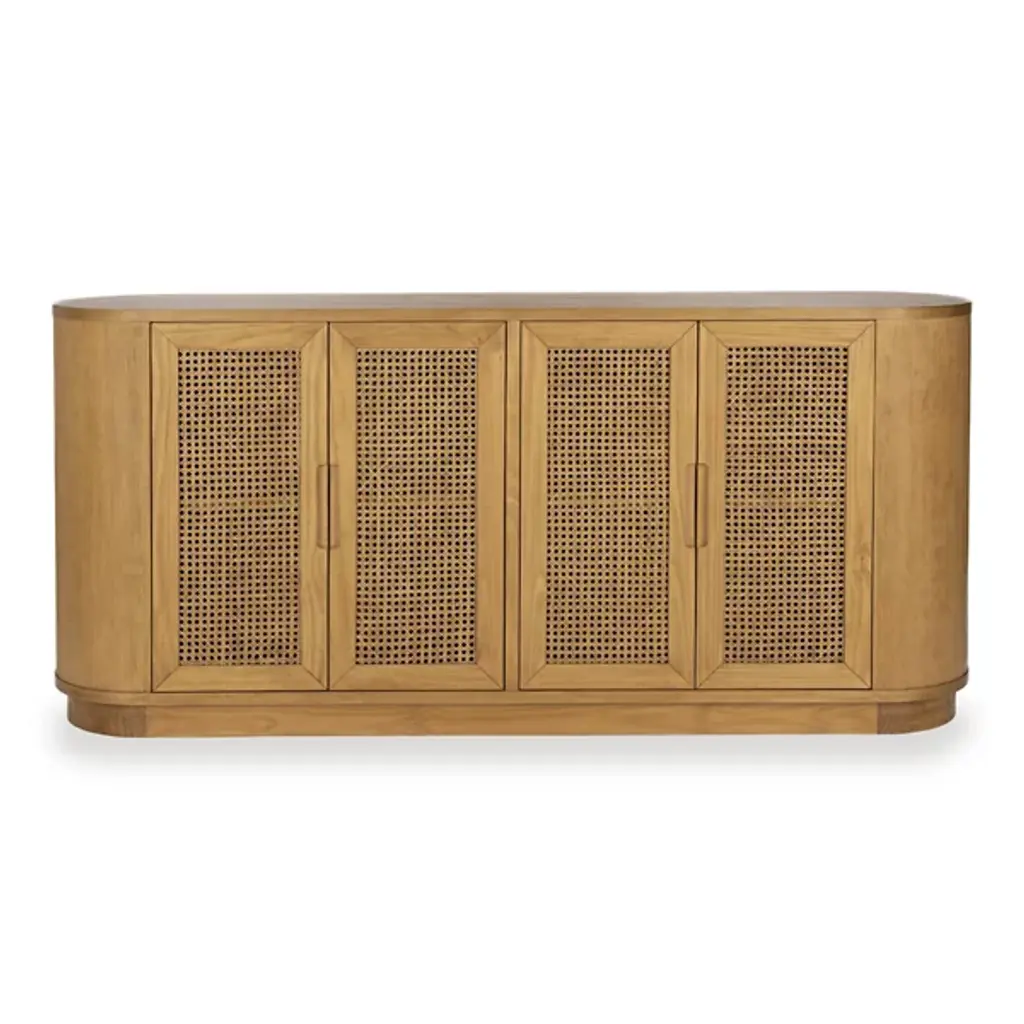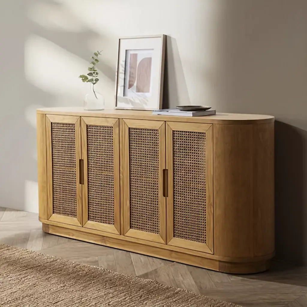 The Adelheid Sideboard from Classic Home combines pine wood construction with natural cane door panels that introduce texture and warmth to storage solutions. This media-ready cabinet features integrated wire management holes and adjustable shelving that adapts to your organizational needs. The cut-out handles maintain clean lines while providing easy access to the interior compartments. Constructed from pine veneer, it ensures lasting durability, while the cane detailing adds an organic element that softens the overall design. This piece balances practical storage with natural materials in a refined package.