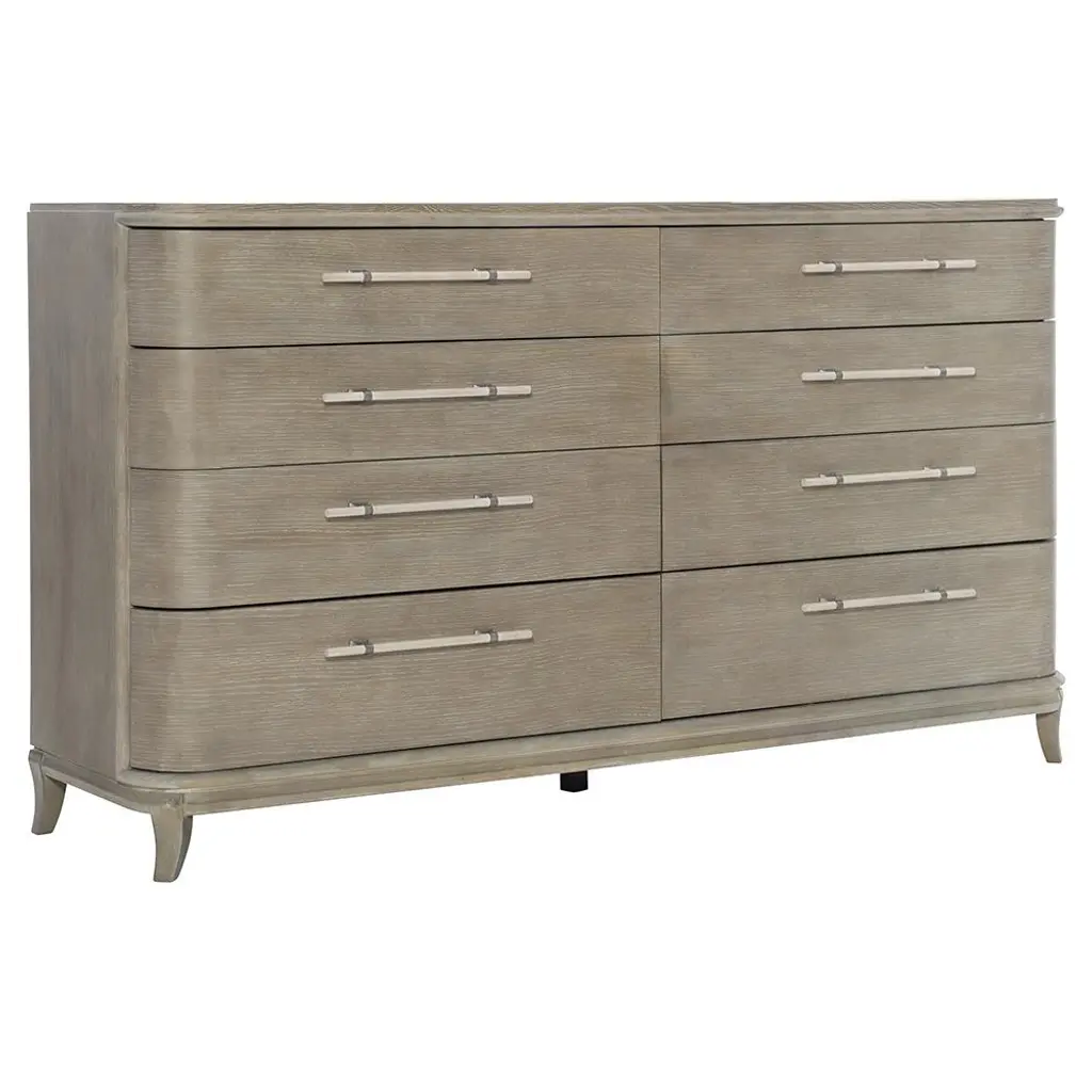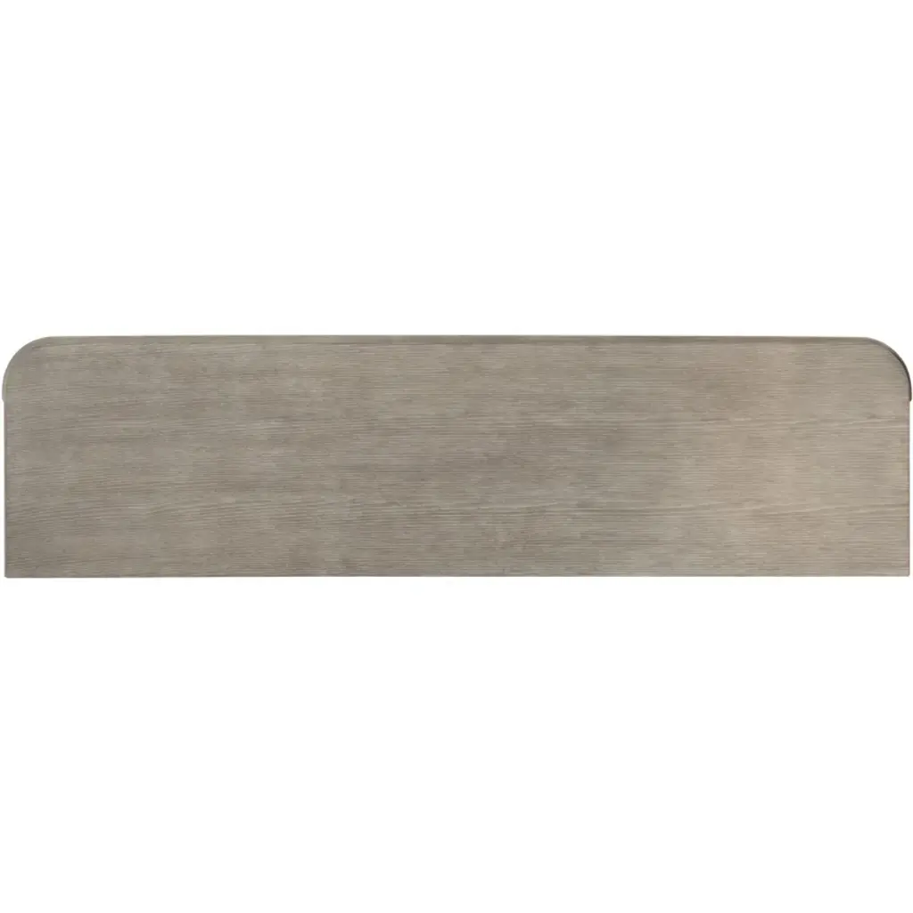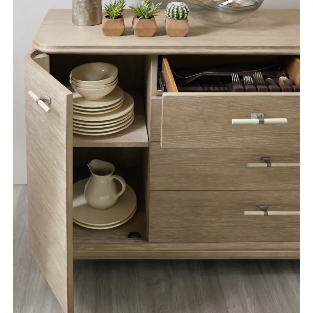 In a softly rounded form, the Affinity Server combines a greige sand-blasted finish on Quartered Oak Veneers with cream and pewter bar pulls and flared legs. With two doors, there is one adjustable wood shelf behind each door. Five drawers. The top left drawer has drop-in felt silverware and the top right drawer has a drop-in felt liner. The bottom drawer is cedar lined. Soft, rounded forms combine with sand-blasted greige and antique white finishes to create an inviting transitional boutique collection in Affinity. The main finish for the 20-piece collection of bedroom, dining room, occasional, accents and home entertainment is a wire-brushed greige (gray/beige) on quartered white oak. Pewter and antique white hardware and soft linen fabrics add intrigue.