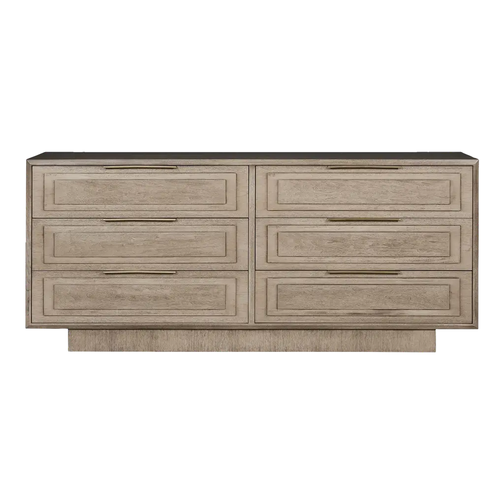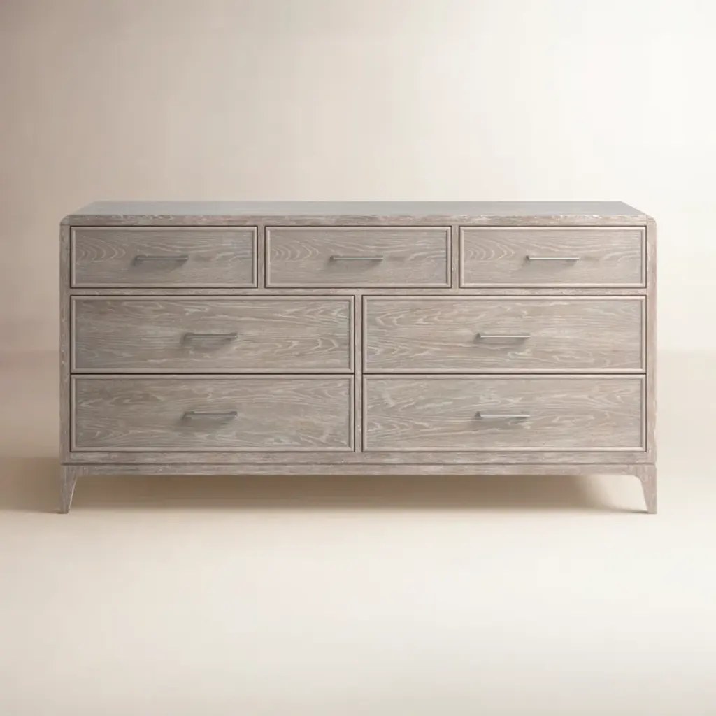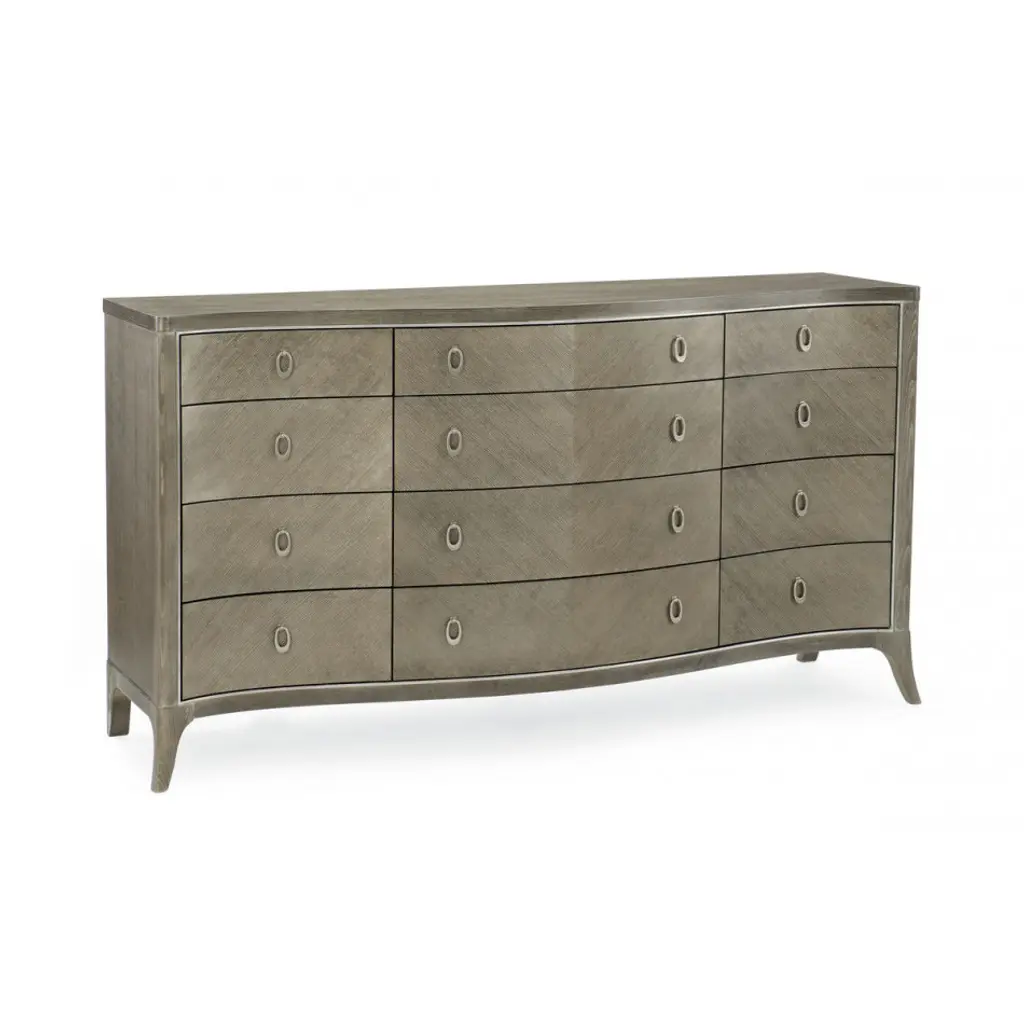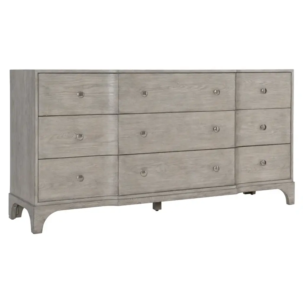 In a softly rounded form, the Affinity Server combines a greige sand-blasted finish on Quartered Oak Veneers with cream and pewter bar pulls and flared legs. With two doors, there is one adjustable wood shelf behind each door. Five drawers. The top left drawer has drop-in felt silverware and the top right drawer has a drop-in felt liner. The bottom drawer is cedar lined. Soft, rounded forms combine with sand-blasted greige and antique white finishes to create an inviting transitional boutique collection in Affinity. The main finish for the 20-piece collection of bedroom, dining room, occasional, accents and home entertainment is a wire-brushed greige (gray/beige) on quartered white oak. Pewter and antique white hardware and soft linen fabrics add intrigue.