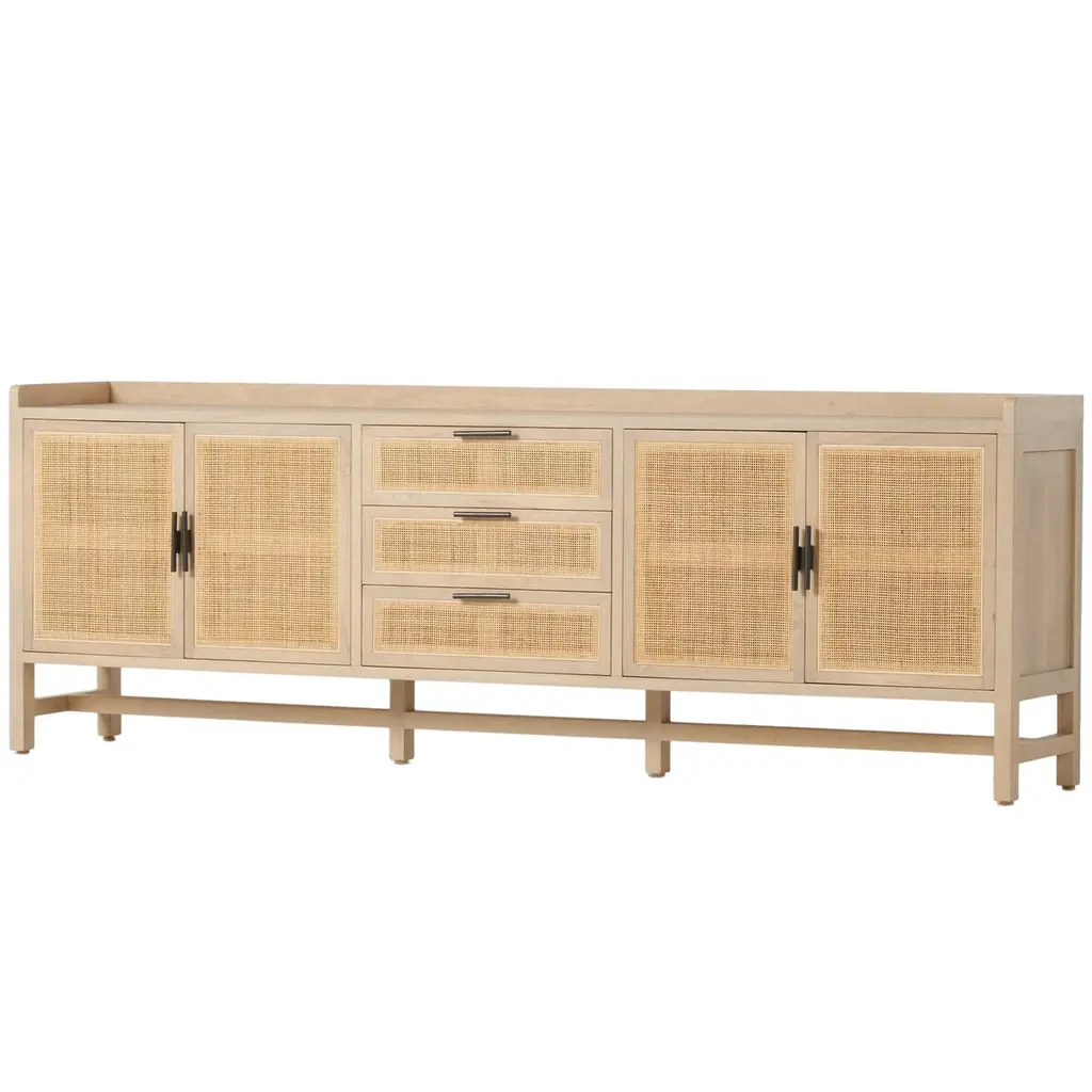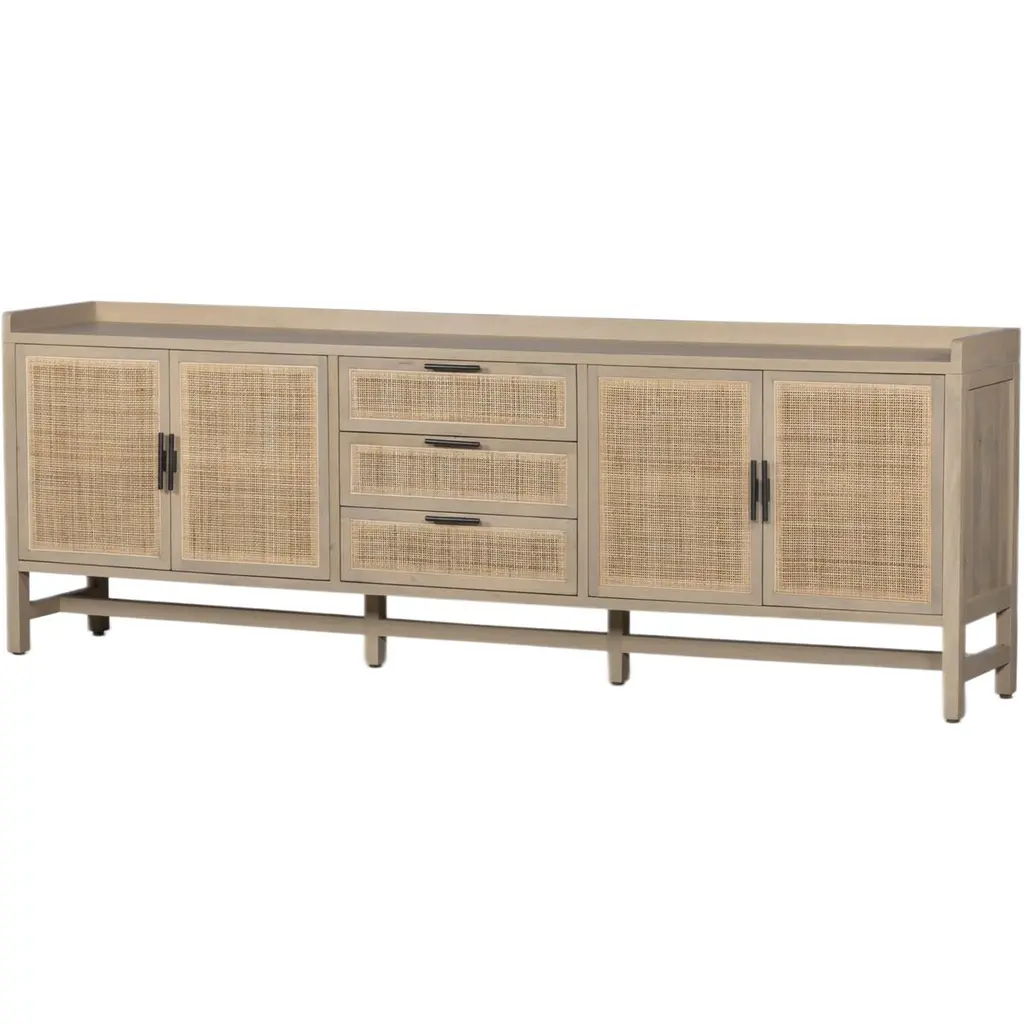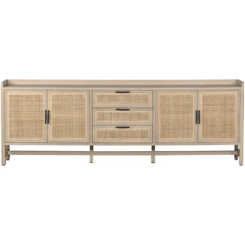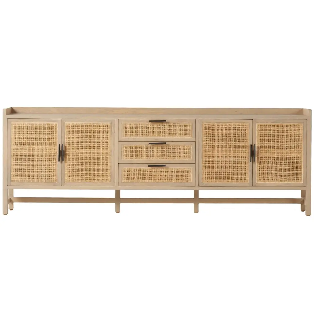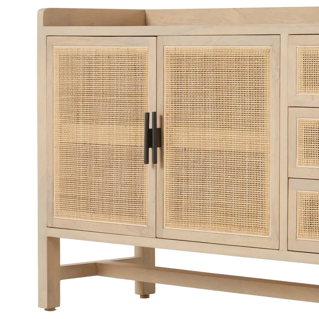 Bring a subtle touch of the tropics to your living room, dining room, or den with this sideboard. Made of woven cane, the door and drawer insets provide an enticing textural complement to the durable mango-wood frame. Behind each pair of doors flanking the three center drawers is a removable shelf and a rear cutout for cord management.