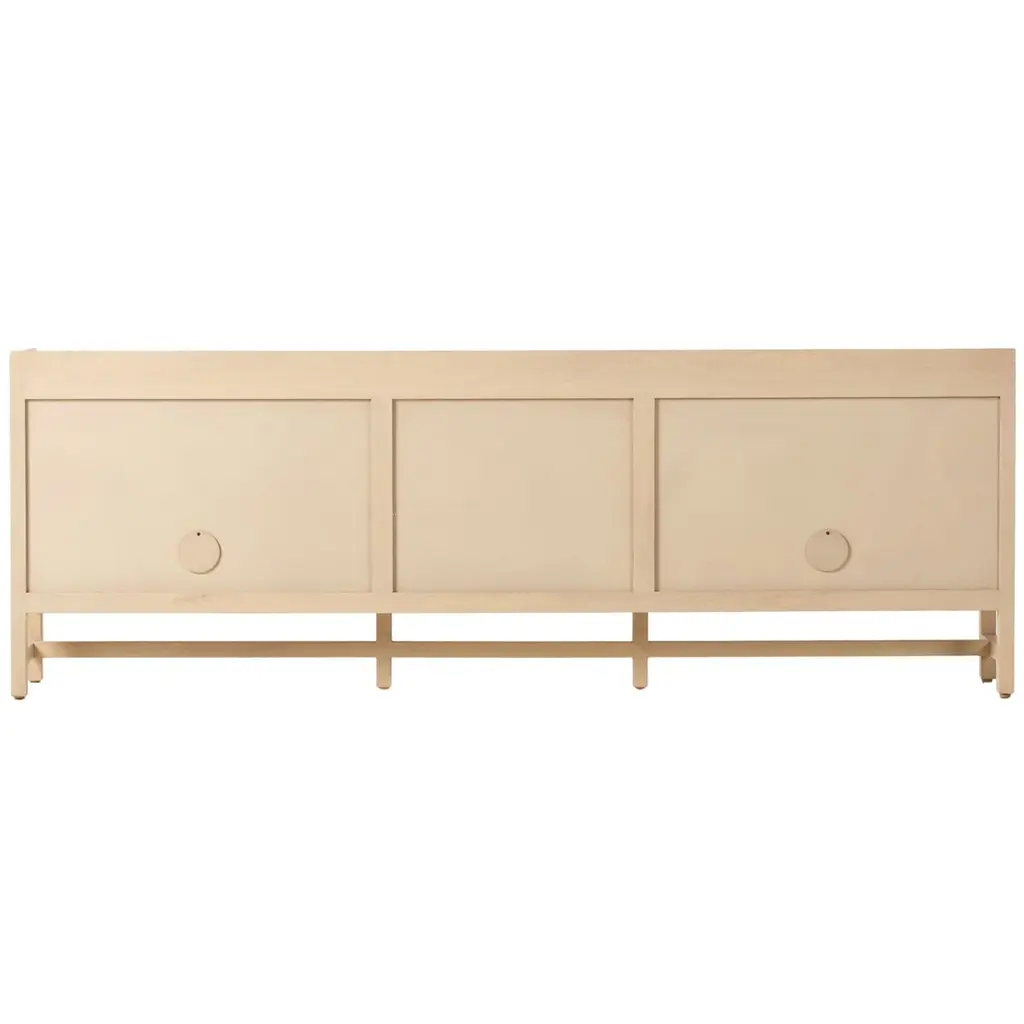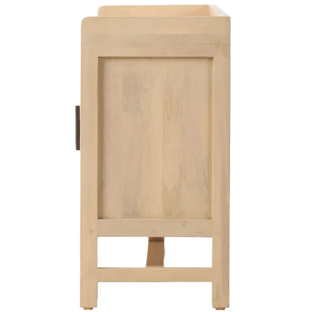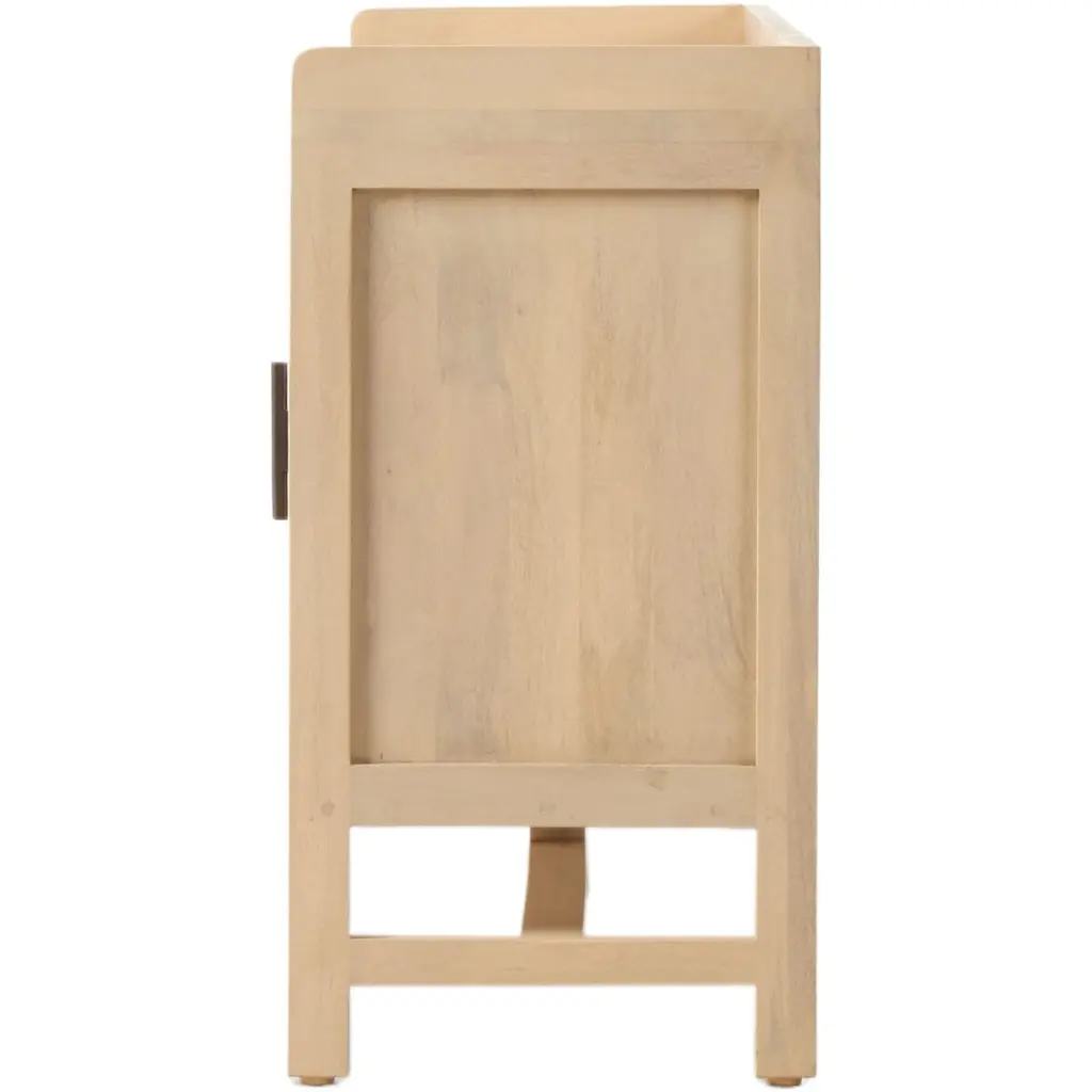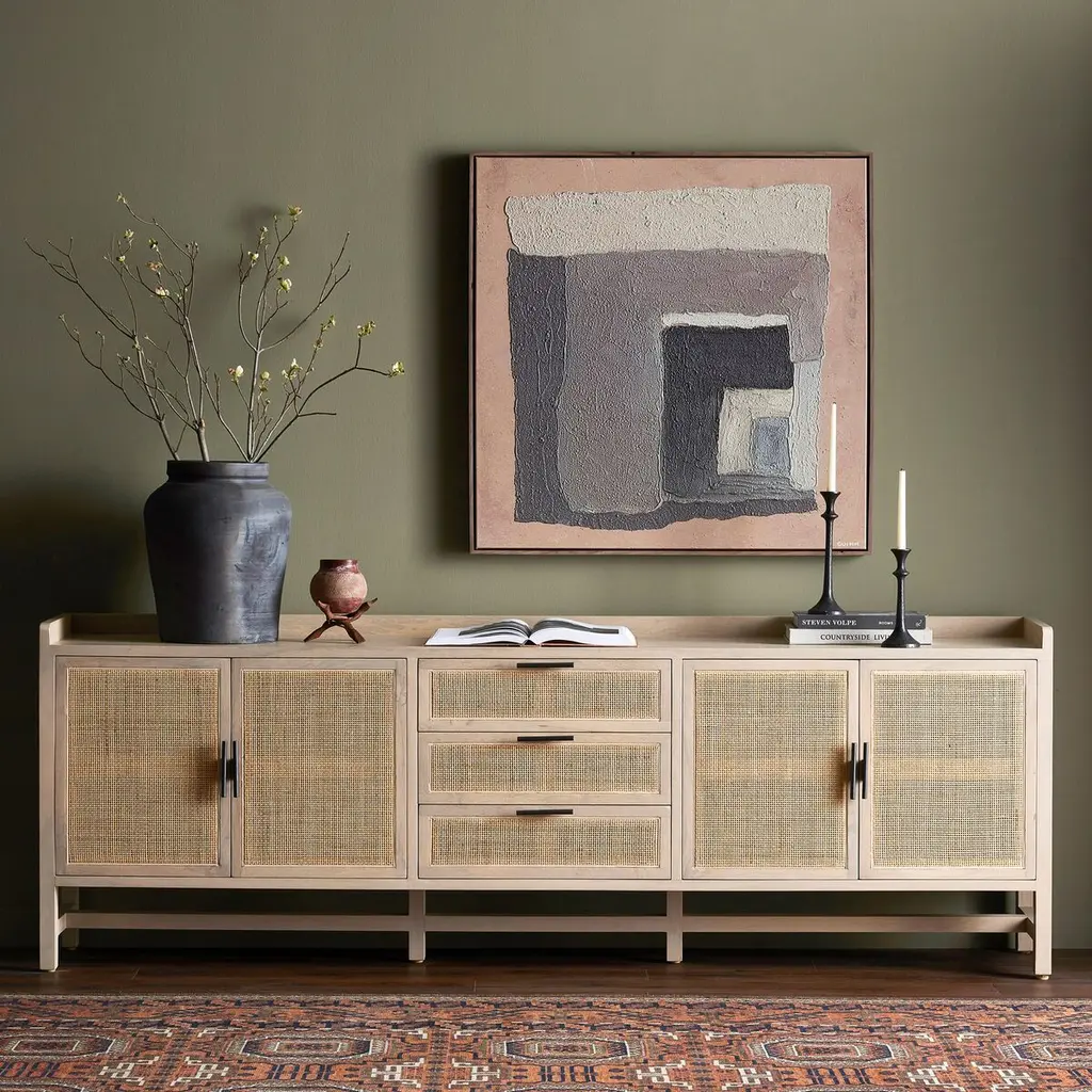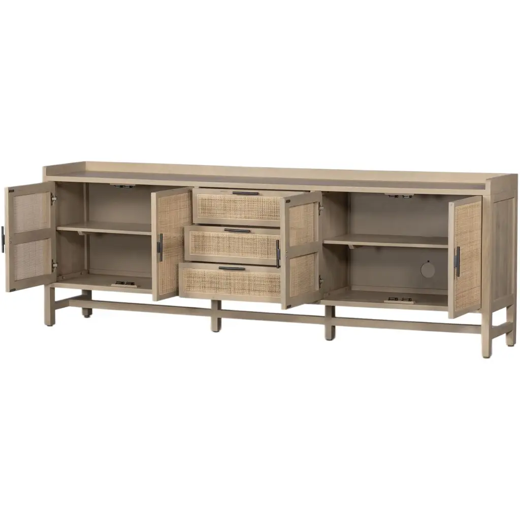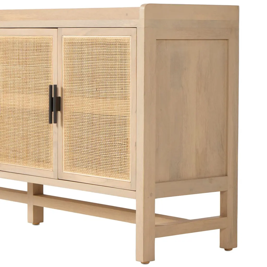Bring a subtle touch of the tropics to your living room, dining room, or den with this sideboard. Made of woven cane, the door and drawer insets provide an enticing textural complement to the durable mango-wood frame. Behind each pair of doors flanking the three center drawers is a removable shelf and a rear cutout for cord management.