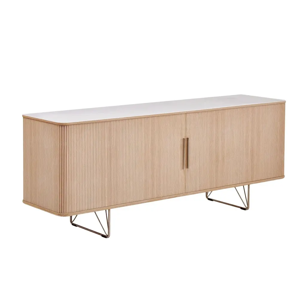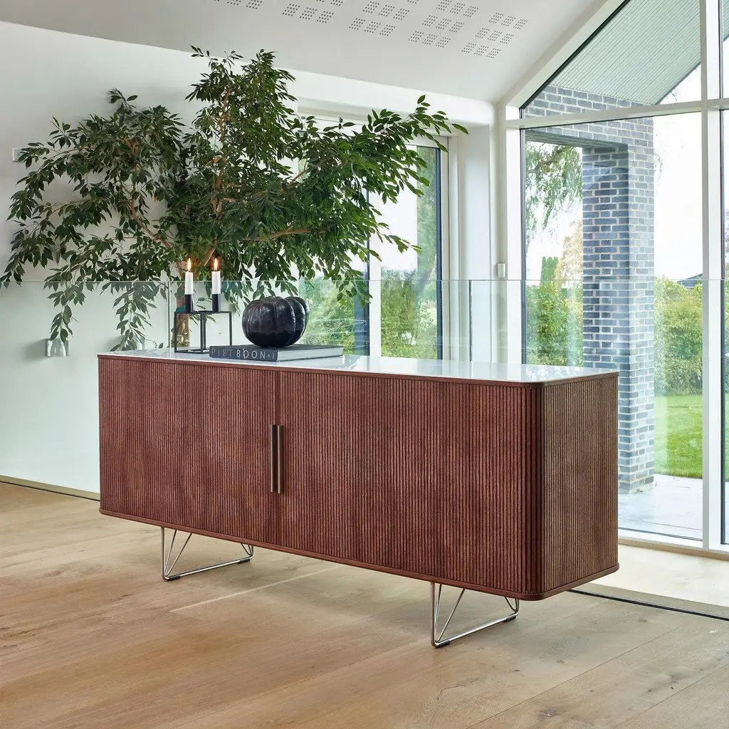 AK2730 Sideboard Designer: Nissen & Gehl MDD Manufactured by: Naver Collection Sideboard with white Corian top and tambour doors, handles and base in stainless steel. It is a new interpretation of a classic design. The sideboard has three storage options. In the middle with two trays, and the other two with adjustable shelves.