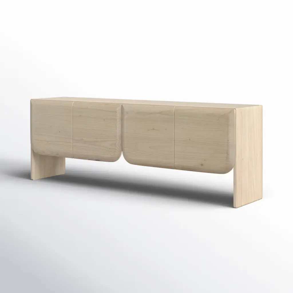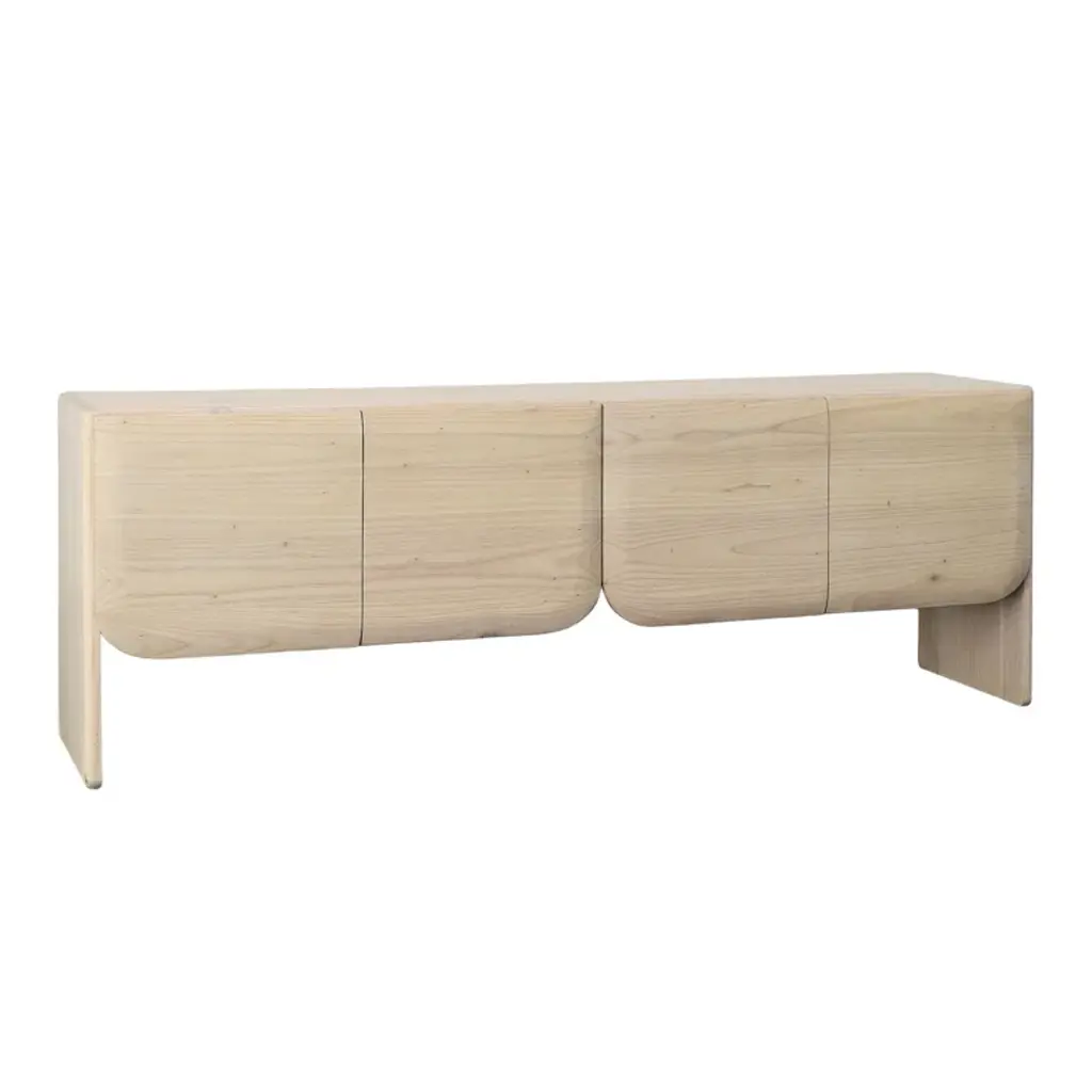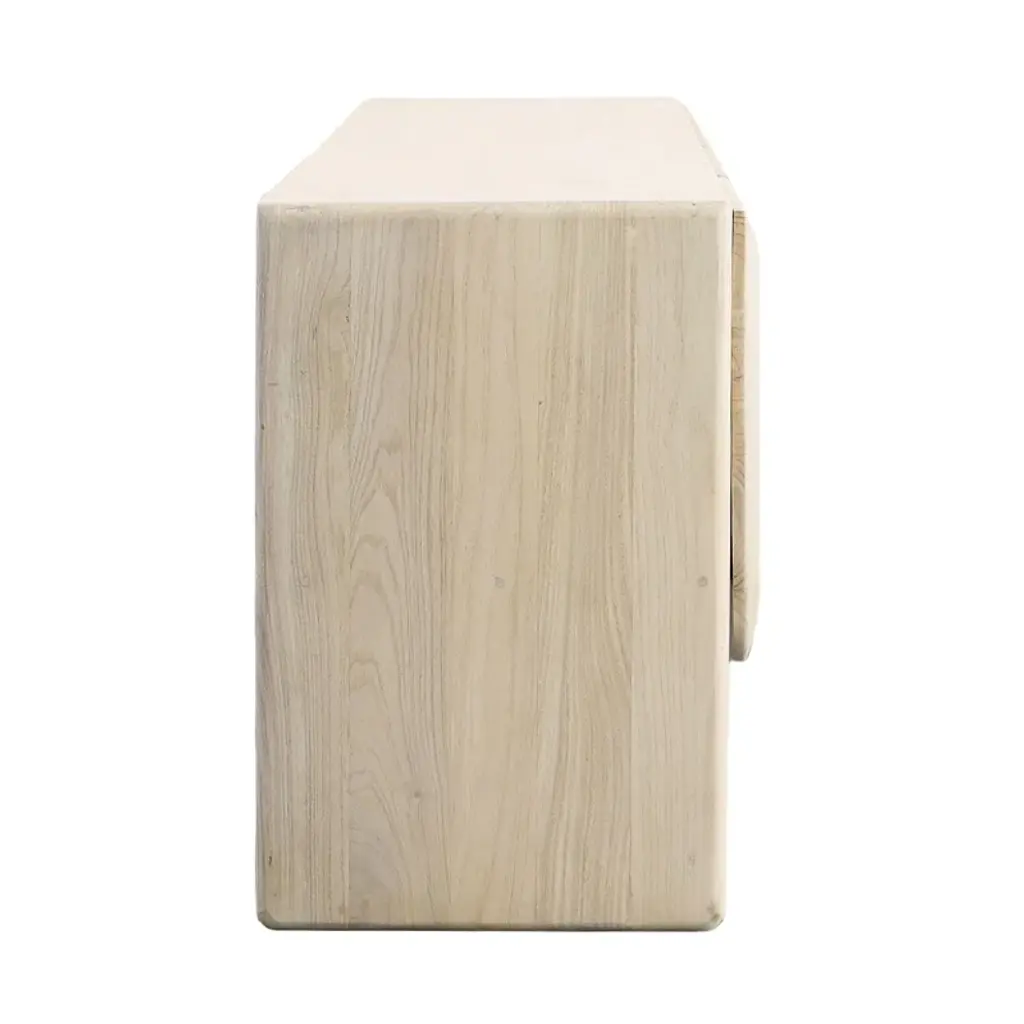 Organize your living space with the Alaia Sideboard. Made from mindi and bayor wood, this sideboard boasts a construction that speaks to both durability and organic elegance. The bleached natural finish enhances the wood's inherent beauty, creating a piece that seamlessly blends into various interior styles. It features 2 sets of butterfly doors, providing access to 4 open interior storage spaces. The natural wood grain pattern further enhances its charm, ensuring that each piece is a distinctive work of art.