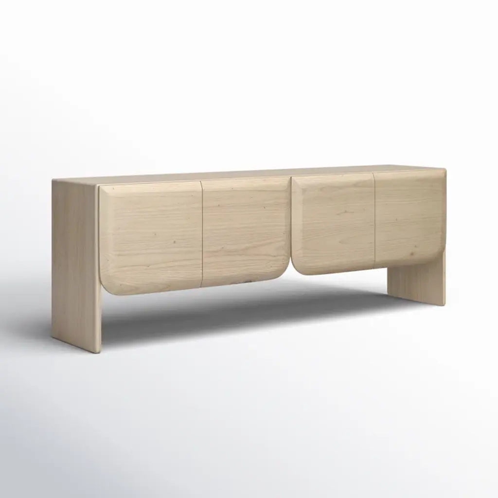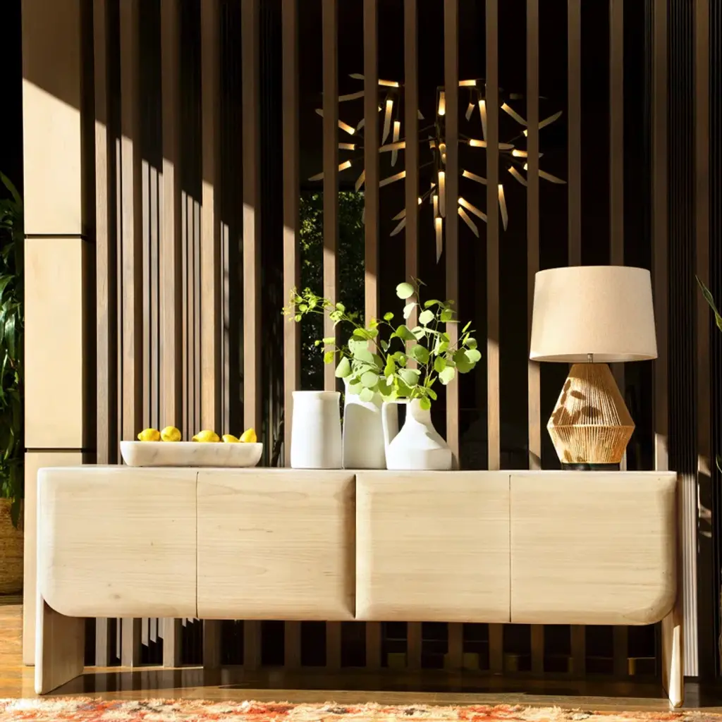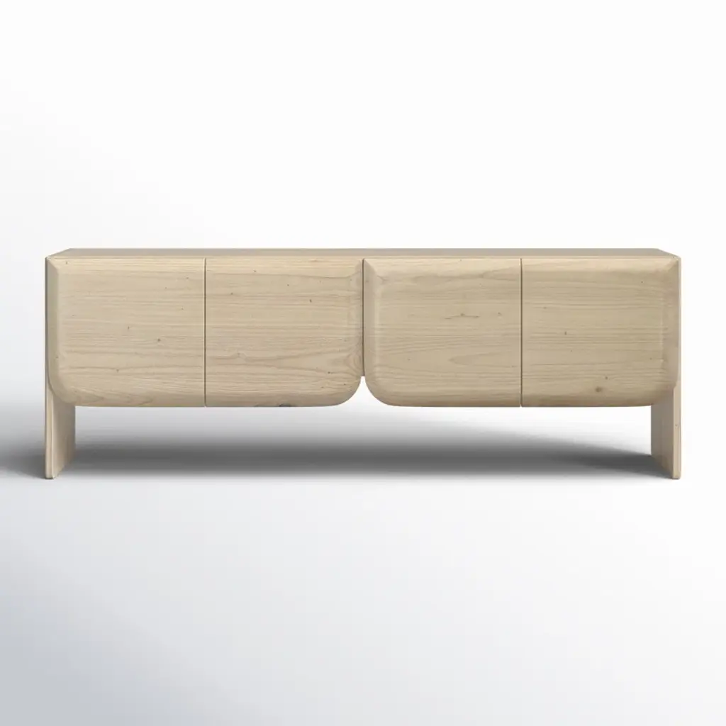 Organize your living space with the Alaia Sideboard. Made from mindi and bayor wood, this sideboard boasts a construction that speaks to both durability and organic elegance. The bleached natural finish enhances the wood's inherent beauty, creating a piece that seamlessly blends into various interior styles. It features 2 sets of butterfly doors, providing access to 4 open interior storage spaces. The natural wood grain pattern further enhances its charm, ensuring that each piece is a distinctive work of art.
