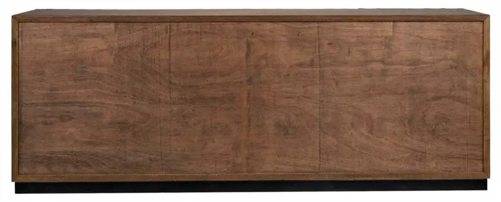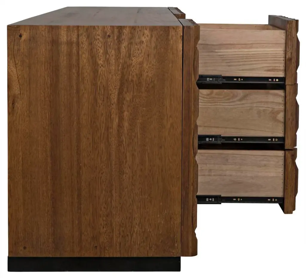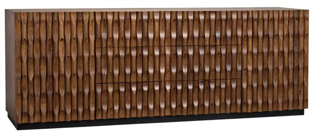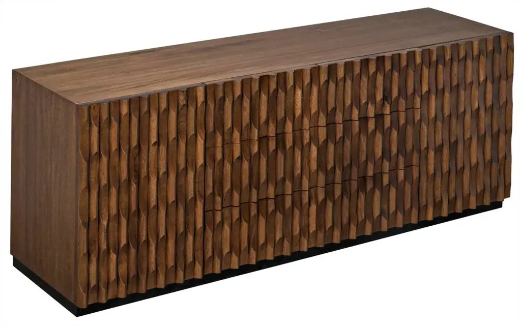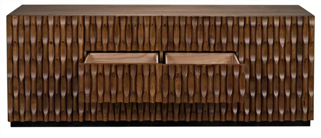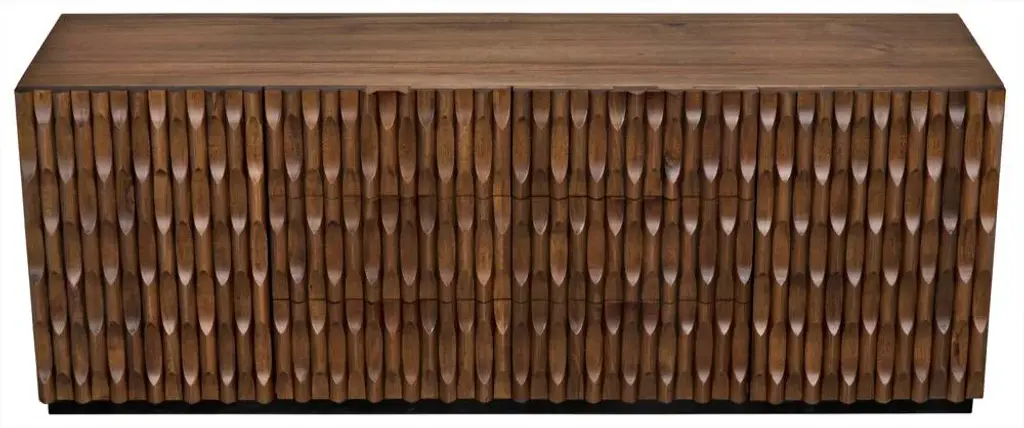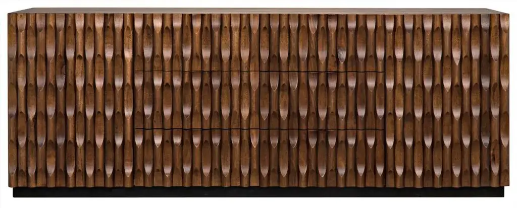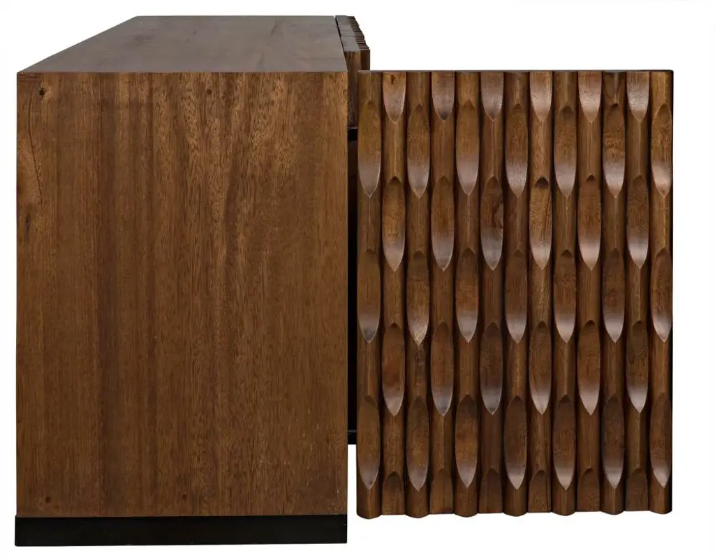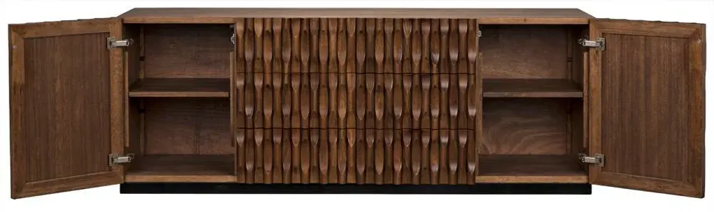 Intricate hand-carved embellishments adorn this gorgeous walnut sideboard. Finished in a rich, hand-applied dark stain, the carvings conceal generous cupboards and two large drawers for stashing necessities.