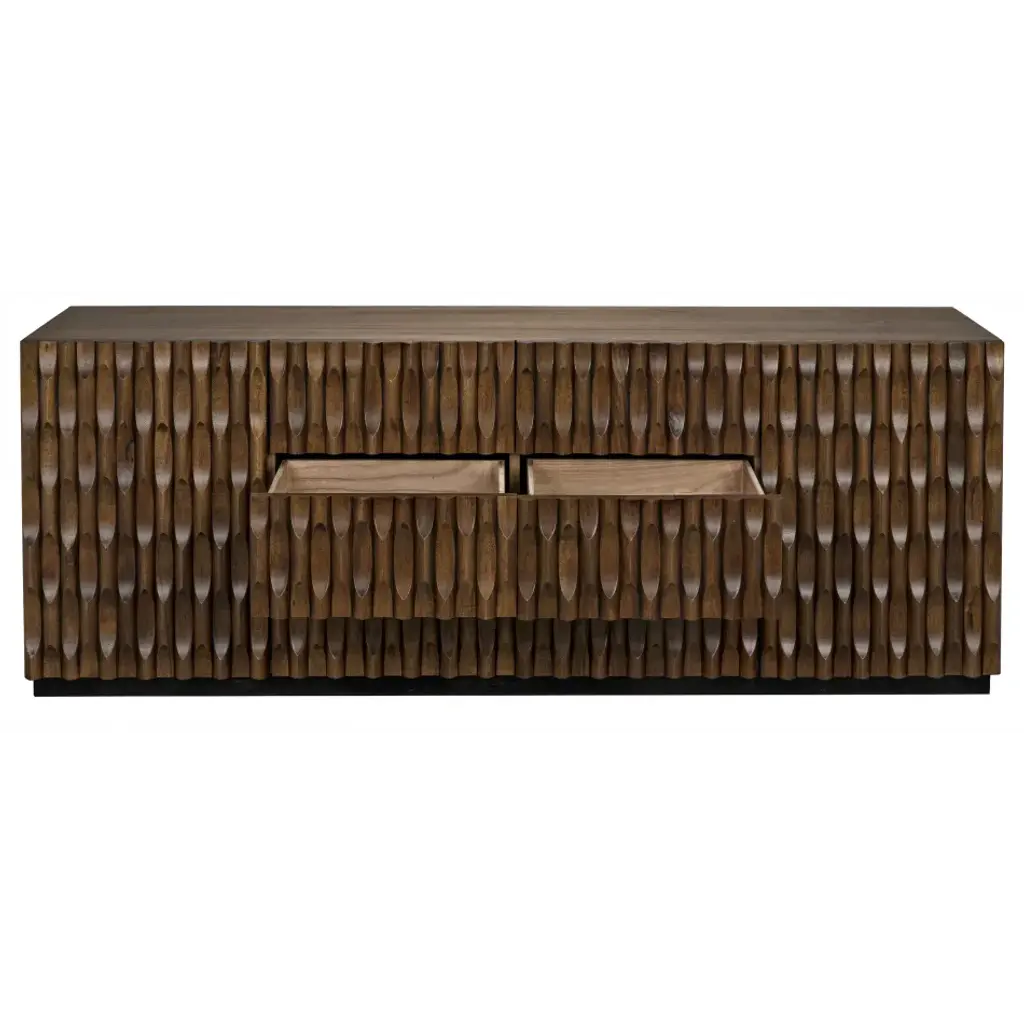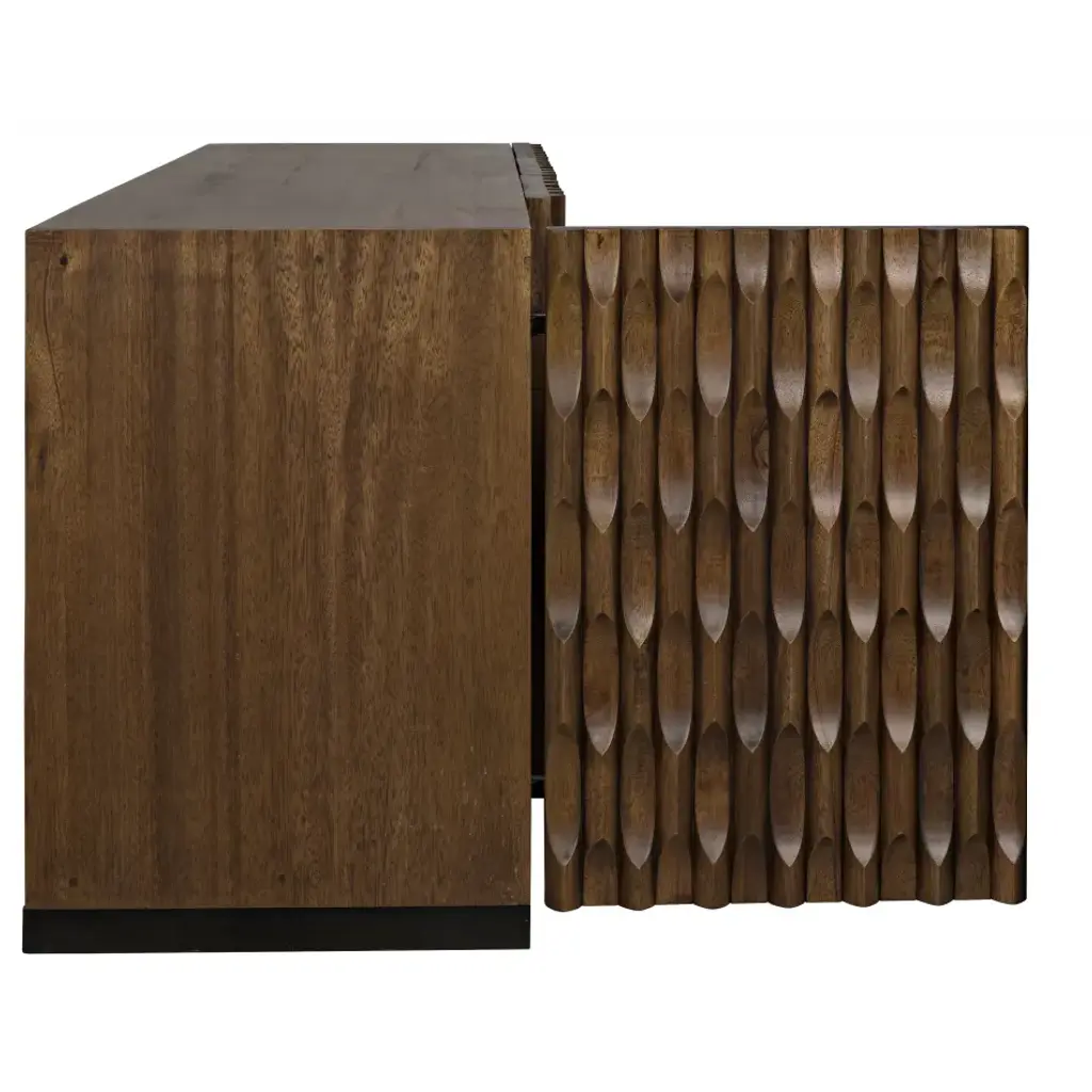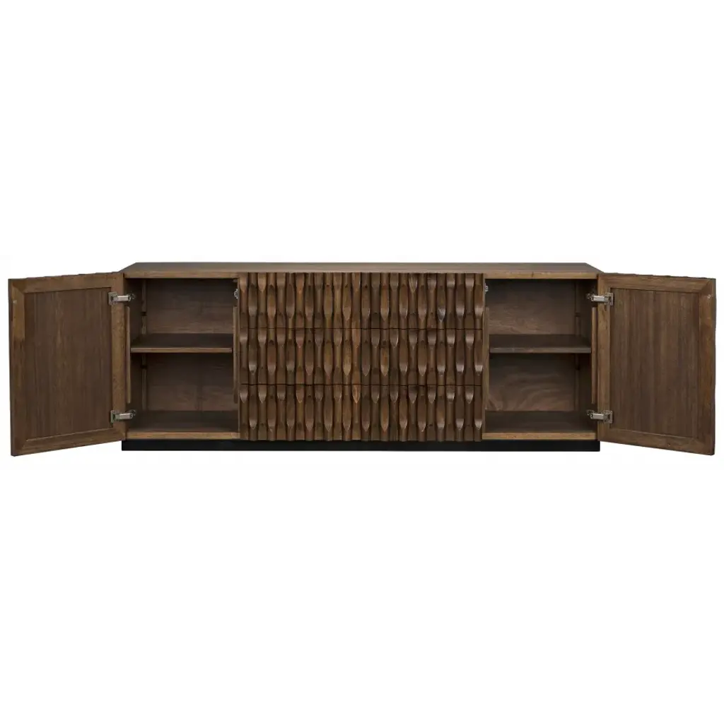 Intricate hand-carved embellishments adorn this gorgeous walnut sideboard. Finished in a rich, hand-applied dark stain, the carvings conceal a generous cupboards and two large drawers for stashing necessities.