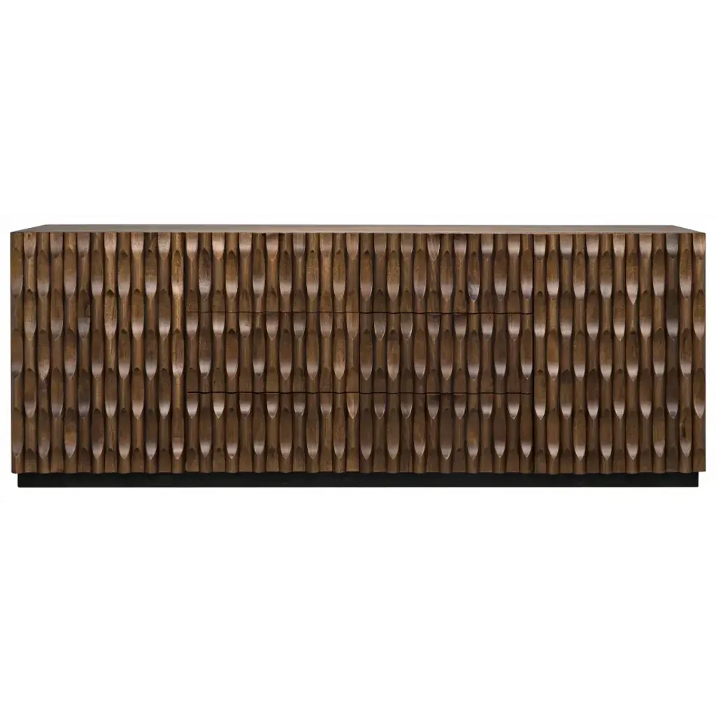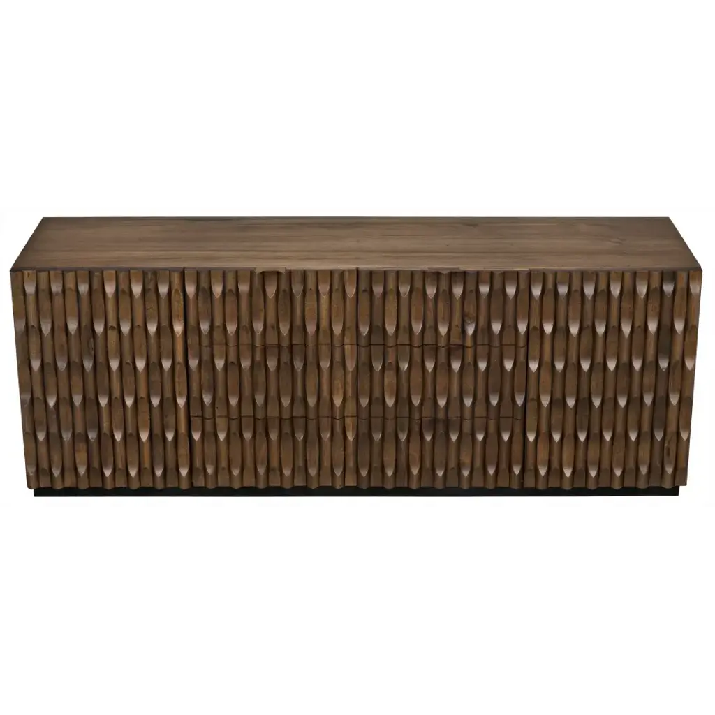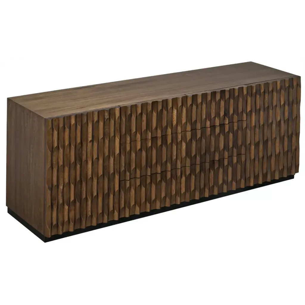 Intricate hand-carved embellishments adorn this gorgeous walnut sideboard. Finished in a rich, hand-applied dark stain, the carvings conceal a generous cupboards and two large drawers for stashing necessities.