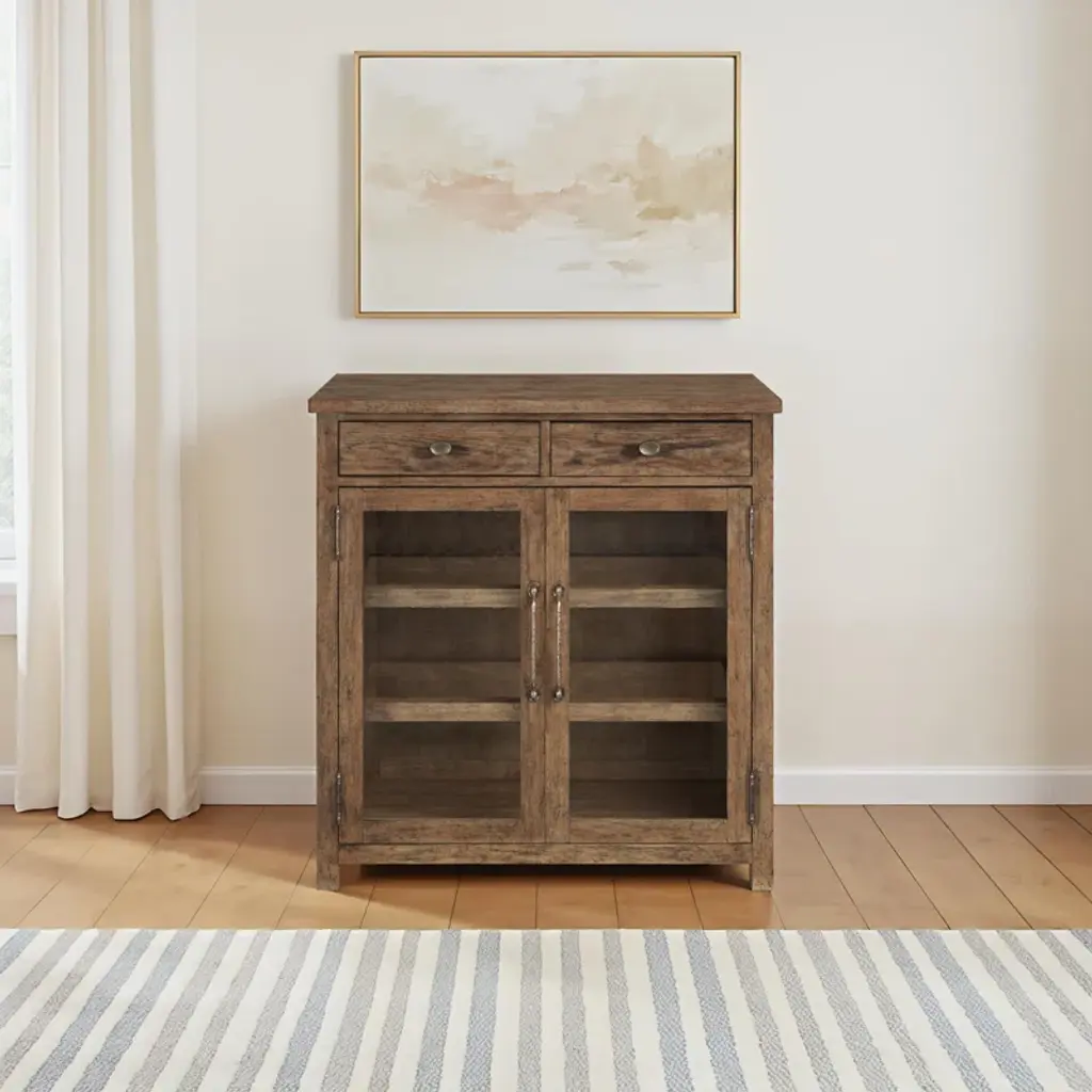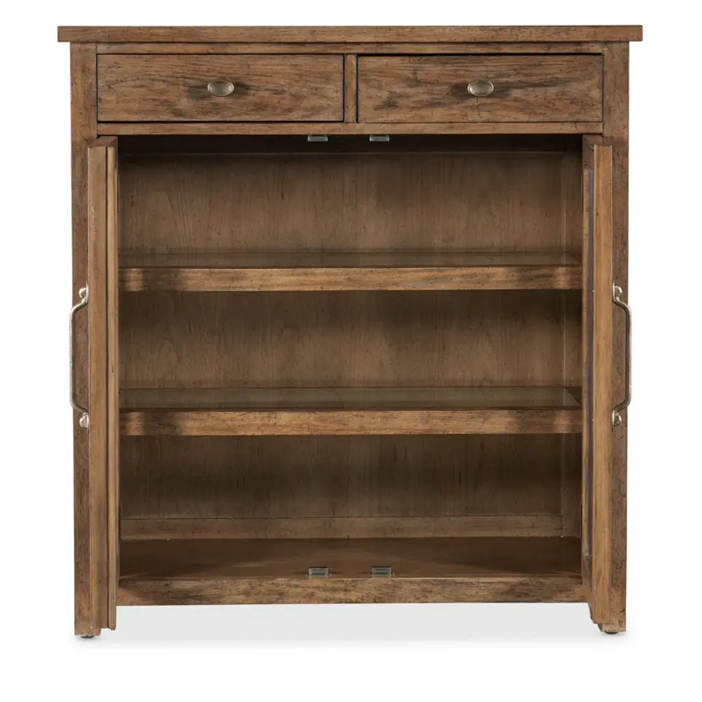 Reimagining a historical design with a fresh take on finish, function, and form, the Alcy pie chest has two wood-framed seeded glass doors with magnetic catches and a light in the door area. Crafted of oak veneer, it is finished in a gentle warm Honey tone with distressing for authenticity. It has two self-closing drawers and two adjustable wood-framed tempered glass shelves with plate grooves. Metal alloy oval and bar pull in an antique bronze finish.