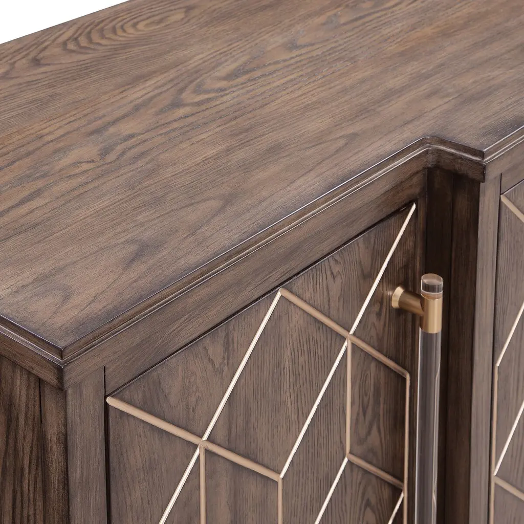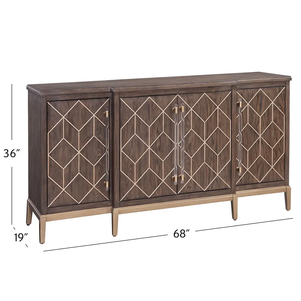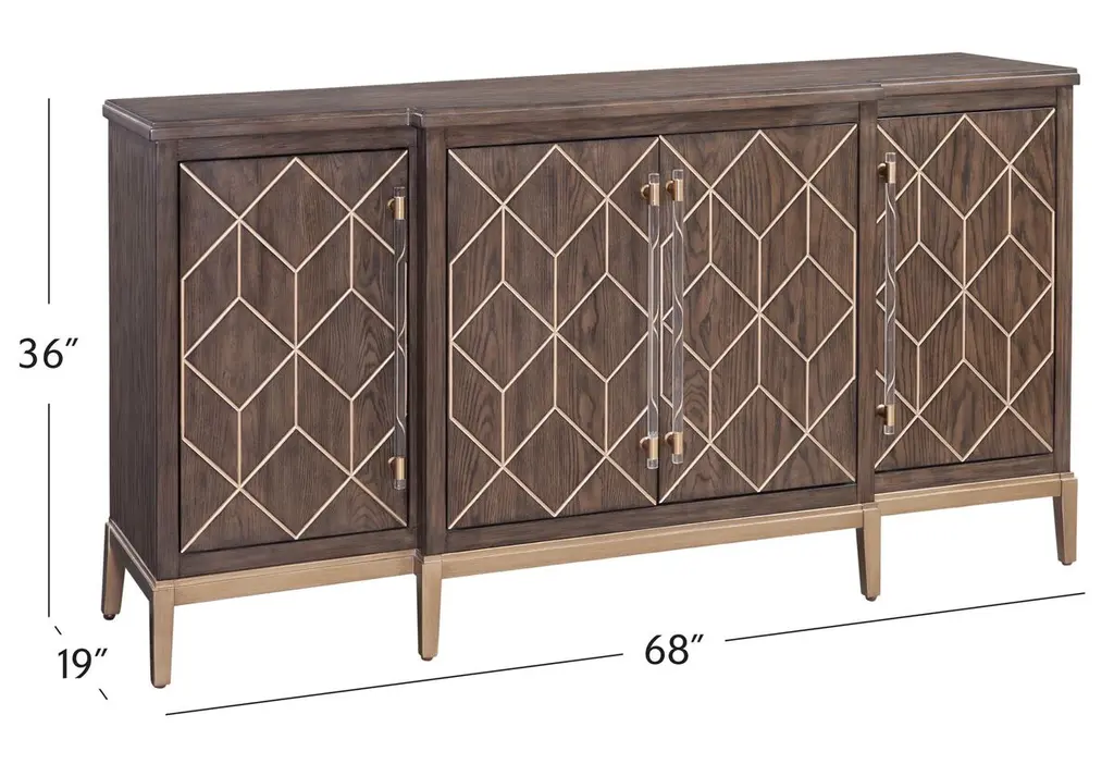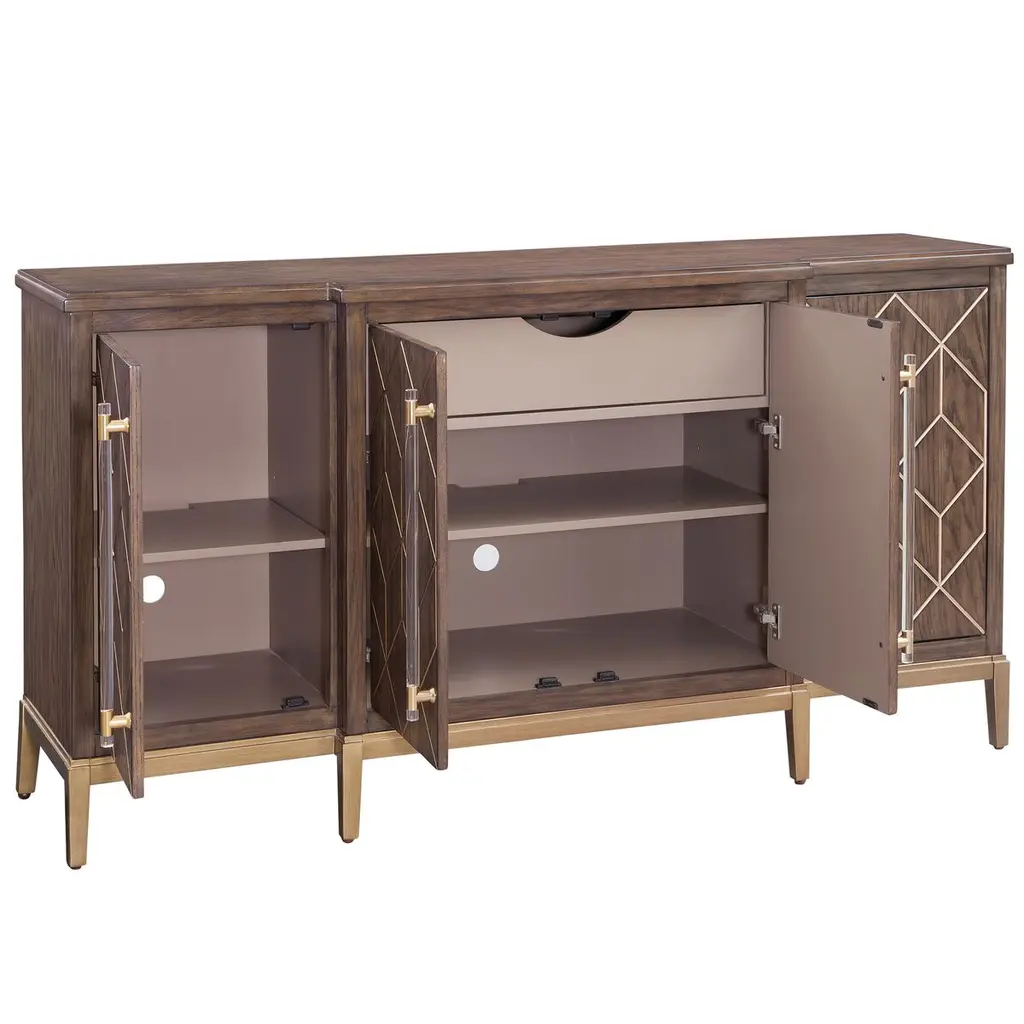 The Alden Server features breakfront styling with geometric design carved into the doors. The custom acrylic hardware has satin brass holders. The outside sets of doors have two shelves behind them and the center set of doors have a drawer and shelf. The interior features a drawer and three adjustable shelves with cutouts for media cord management.