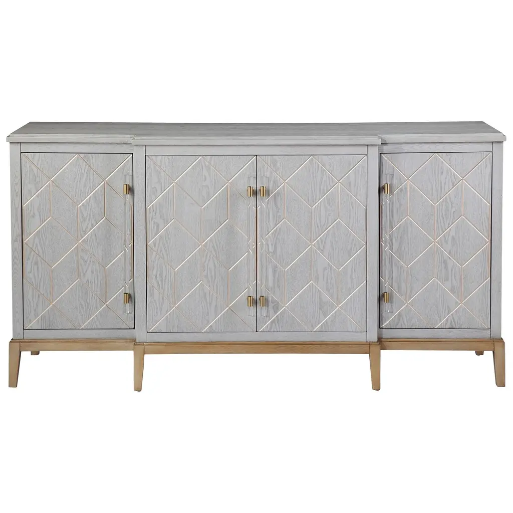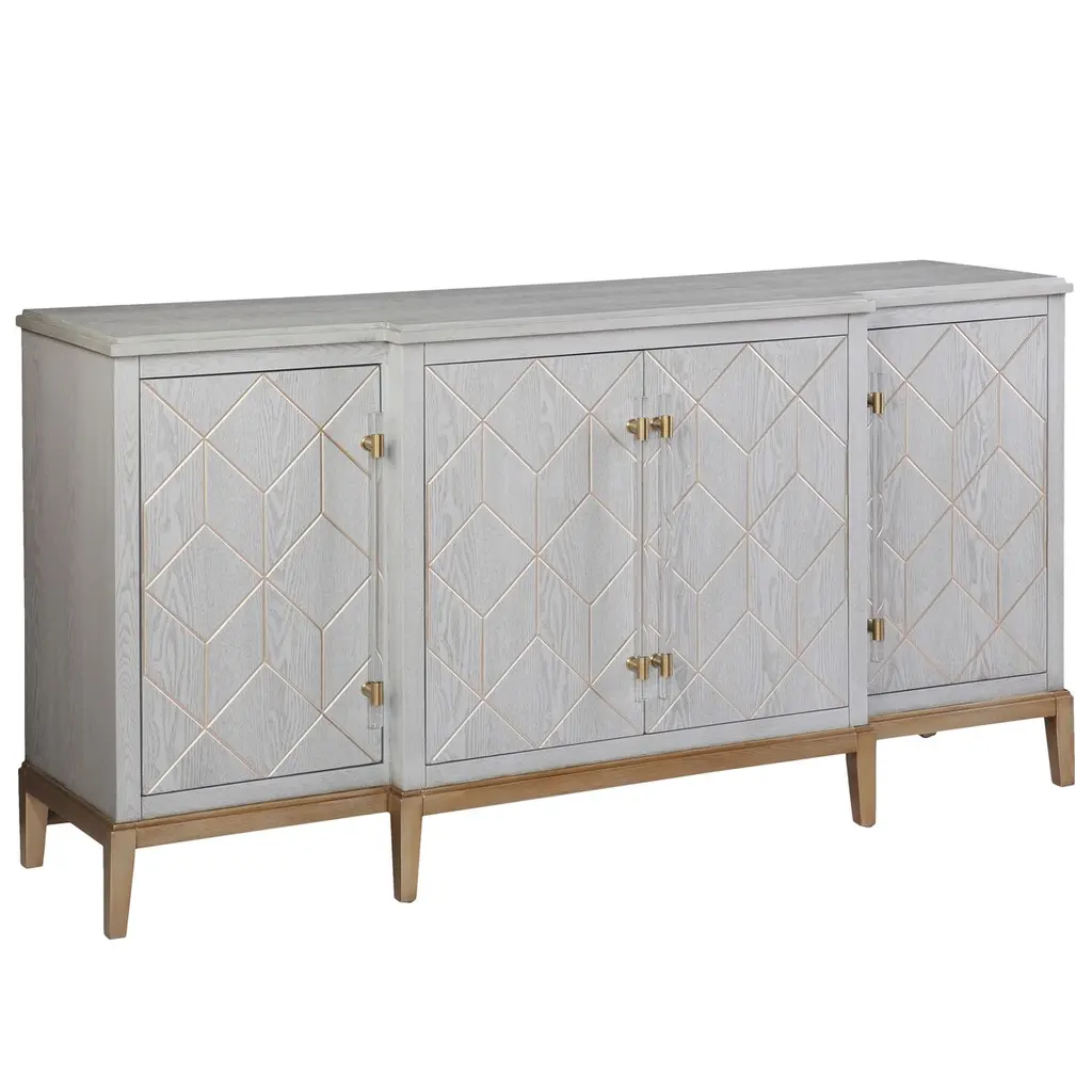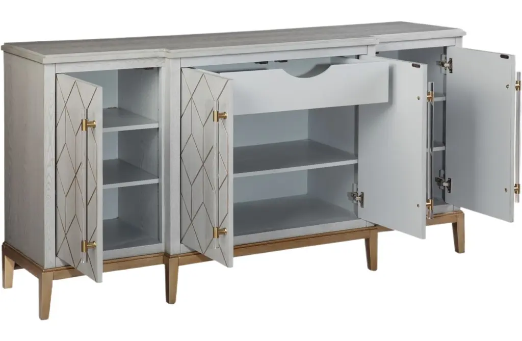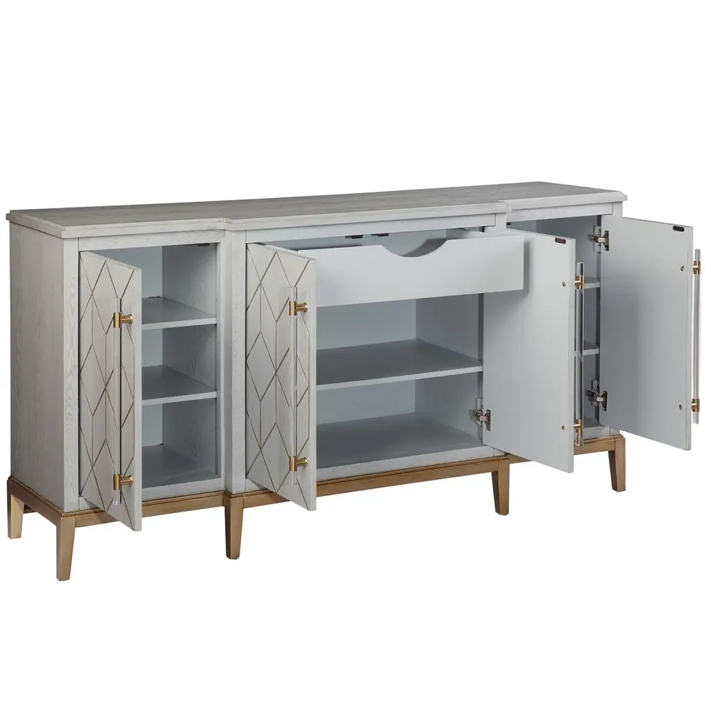 The Alden Server features breakfront styling with geometric design carved into the doors. The custom acrylic hardware has satin brass holders. The outside sets of doors have two shelves behind them and the center set of doors have a drawer and shelf. The interior features a drawer and three adjustable shelves with cutouts for media cord management.