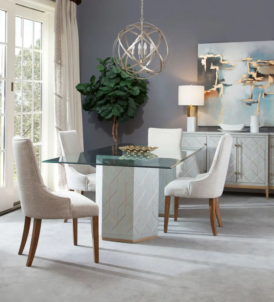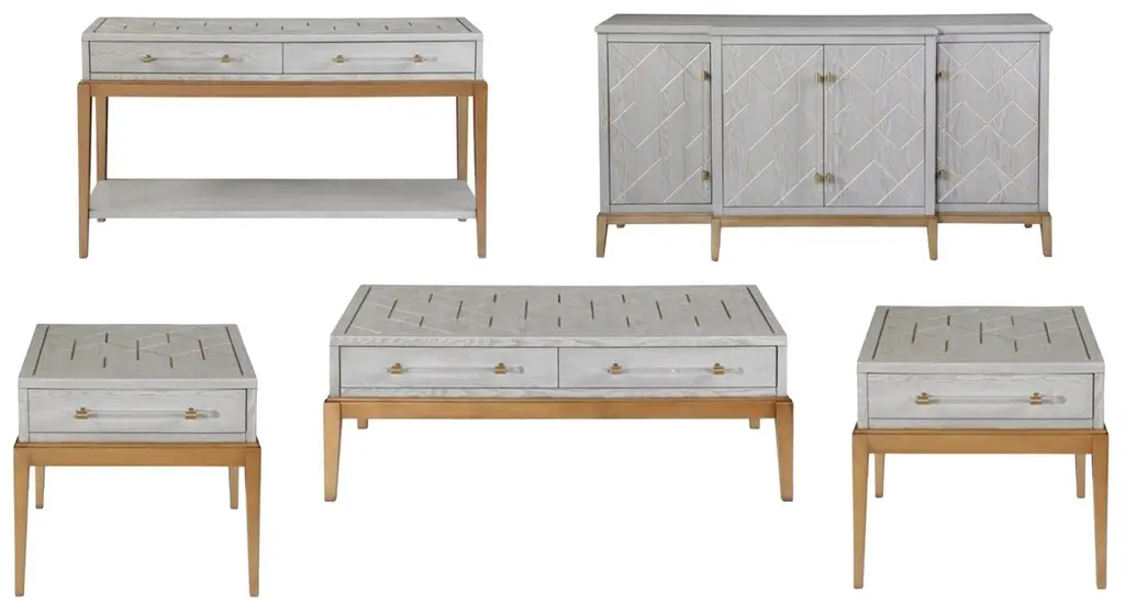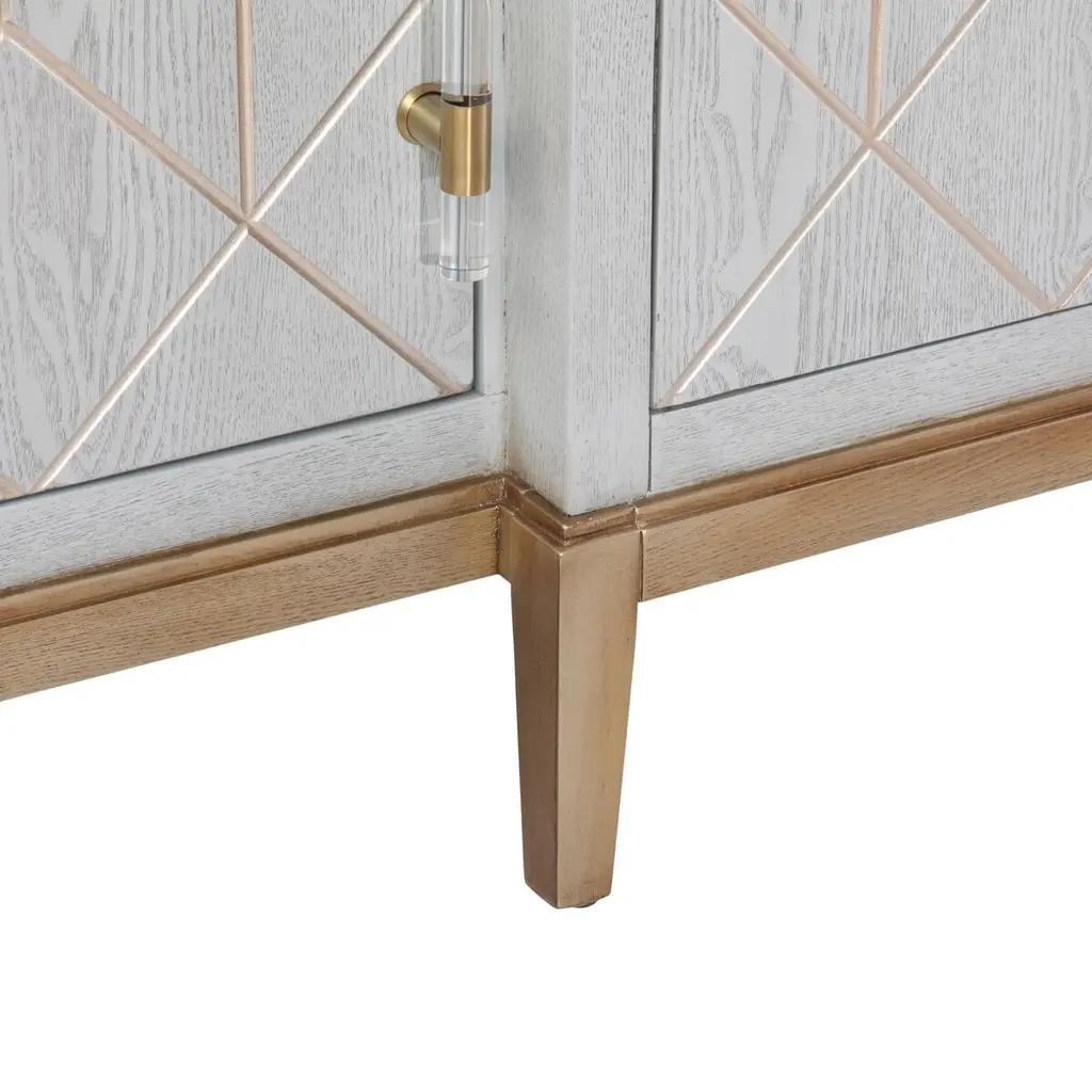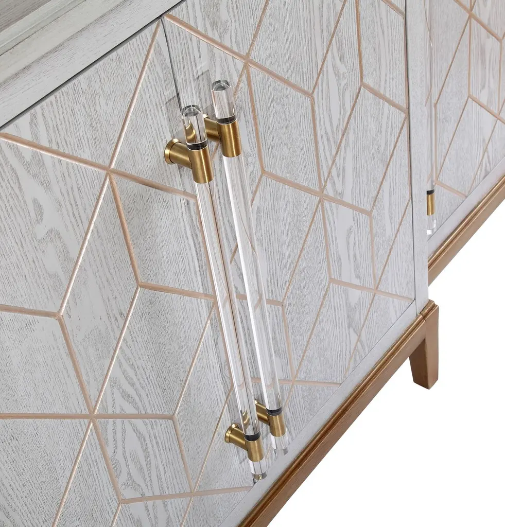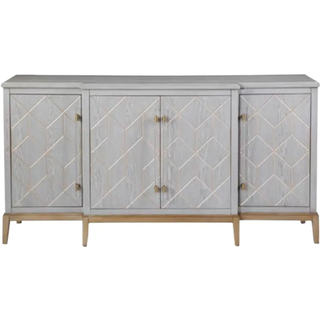 The Alden Server features breakfront styling with geometric design carved into the doors. The custom acrylic hardware has satin brass holders. The outside sets of doors have two shelves behind them and the center set of doors have a drawer and shelf. The interior features a drawer and three adjustable shelves with cutouts for media cord management.