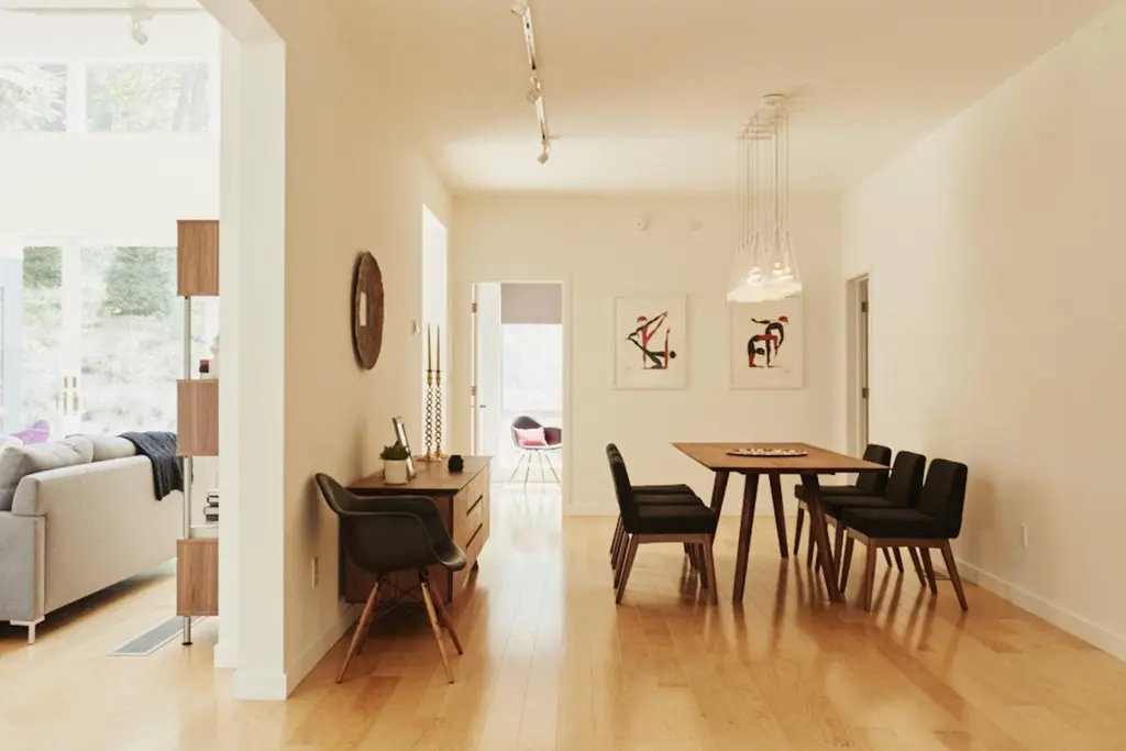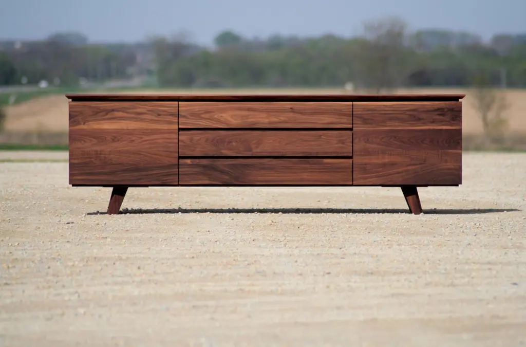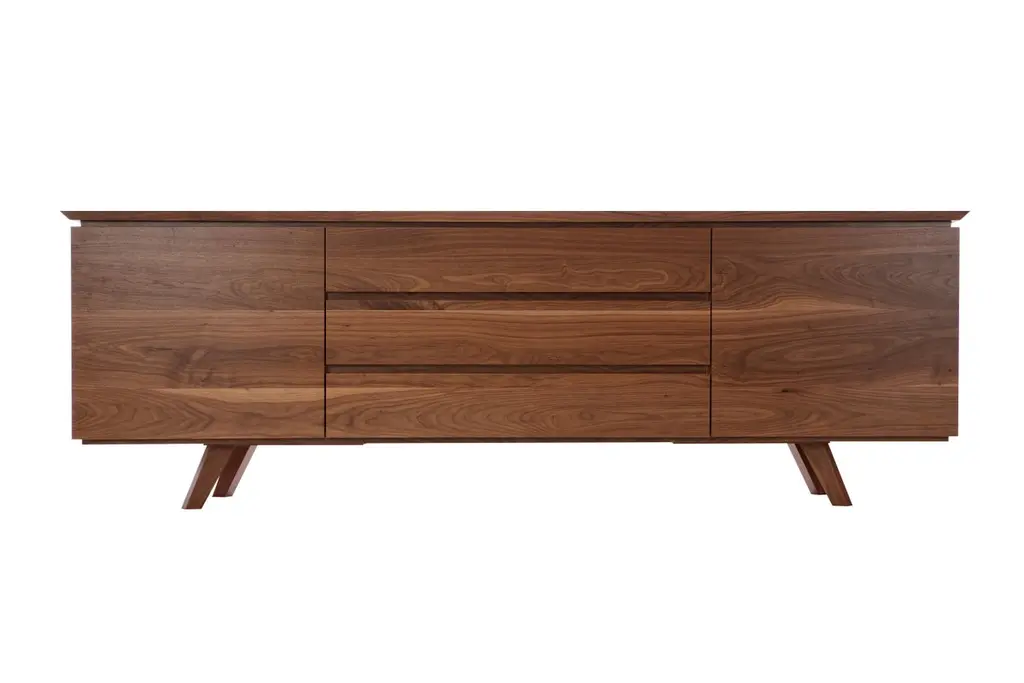 A new fan favorite, the rich, solid wood grain is our signature element behind this warm and elegant sideboard. The wood really speaks for itself in the Alden Sideboard, with the grain running seamlessly across the door and drawer fronts and even integrating into the handles. A back beveled, solid wood top keeps this substantial piece from feeling too heavy and the Alden Sideboard floats on airy, splayed legs to add extra lightness to this piece. All finished with a durable, non-toxic finish. Made for traditional storage needs or concealing the tech center of your home with wire passages, adjustable shelves, soft-closing, dovetailed drawer boxes and hidden door hinges, the Alden Sideboard was designed to handle just about any room of your home or office. Pairs with the Alden Dining Table. Made in Minnesota