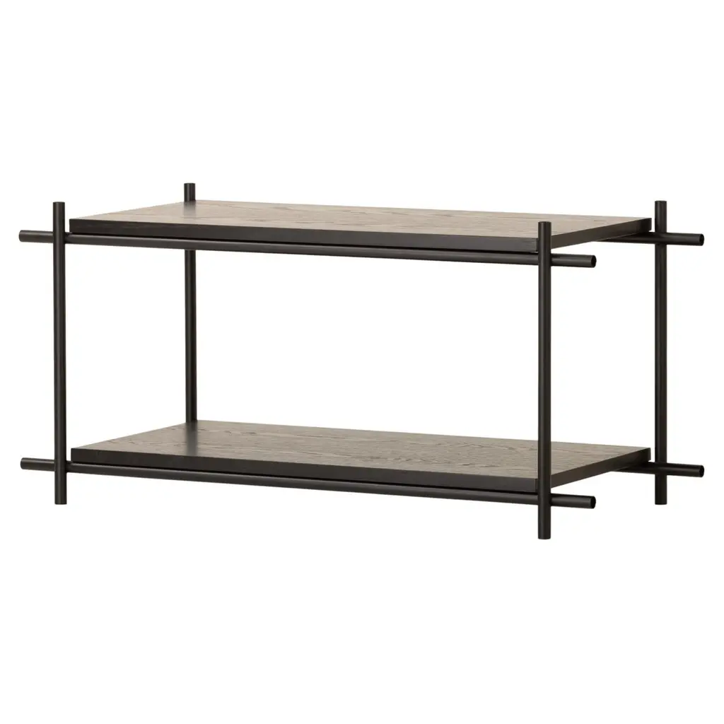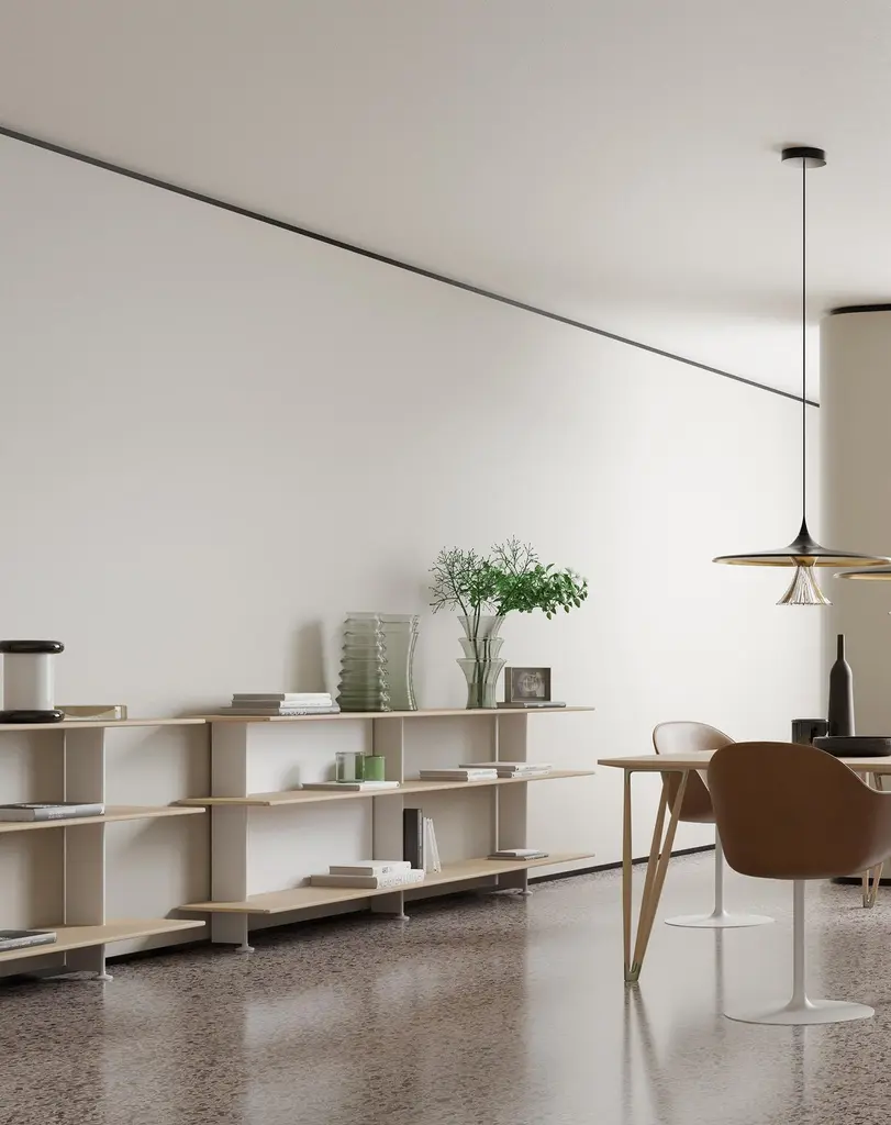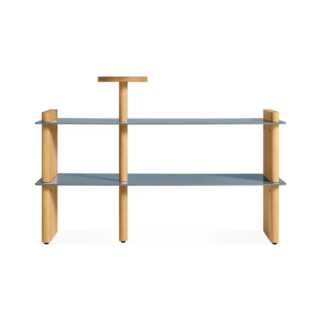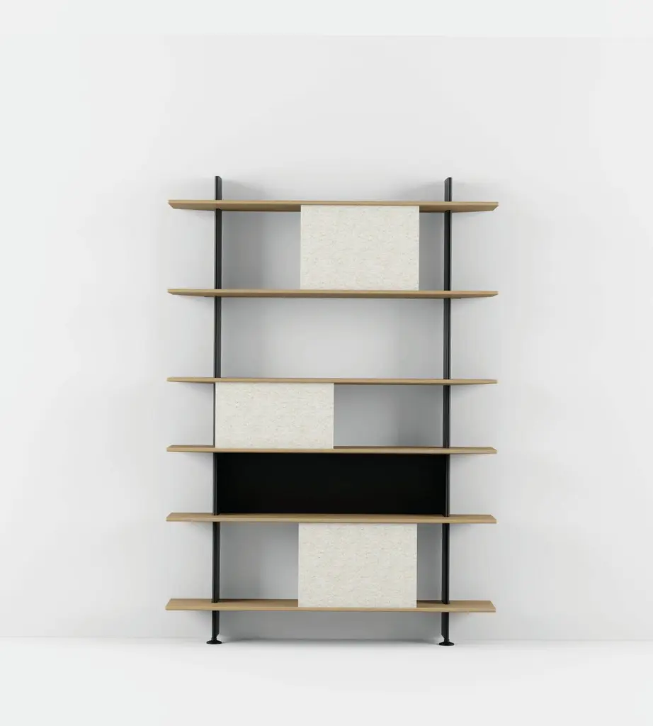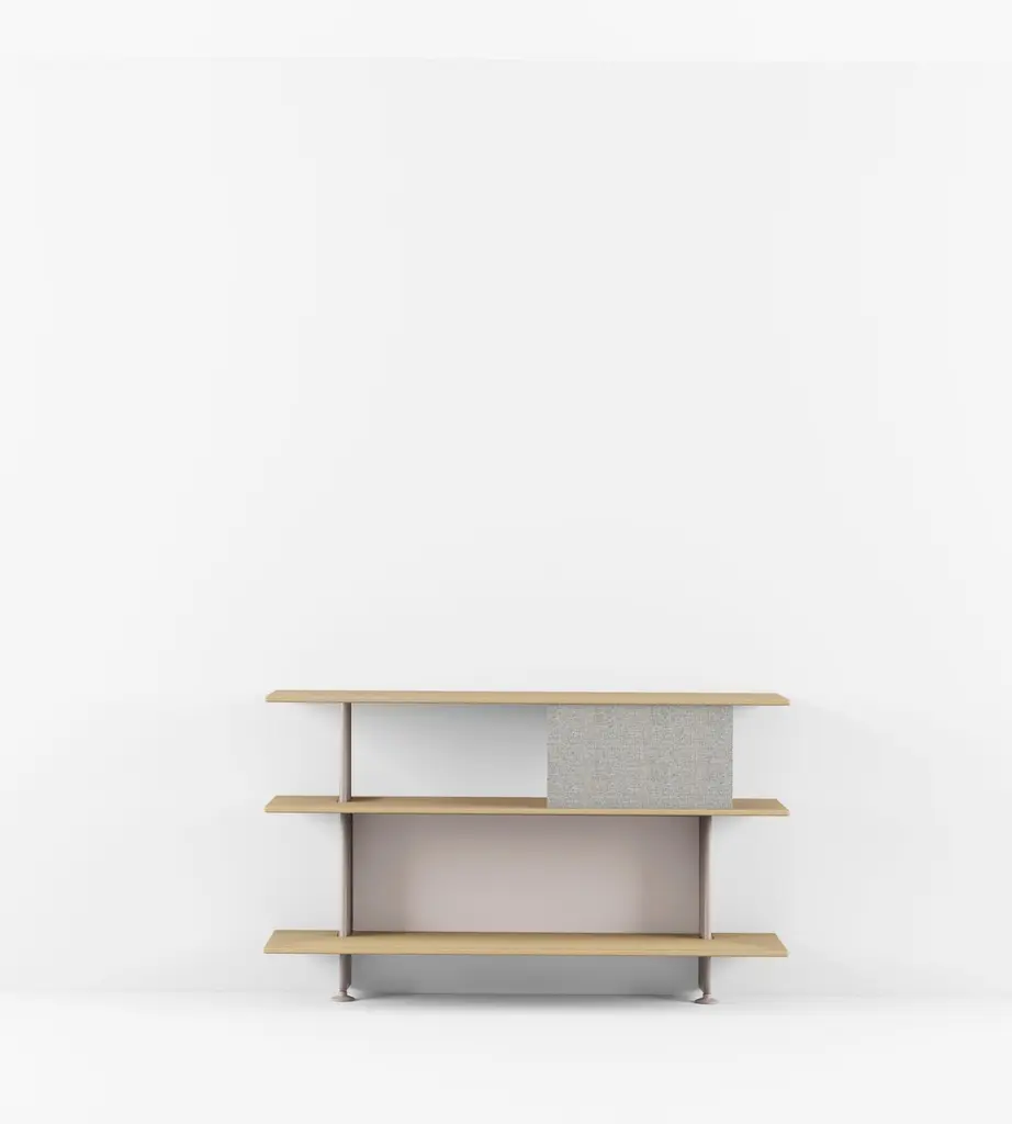 Sideboard with vertical elements in lacquered aluminium and shelves in oak veneered multilayer plywood.Finish in natural oak wood, lacquered (whitened, Canaletto walnut, dark, ash grey) or coloured stains. Available in two depths: 28 cm or 38 cm.ACCESSORIES: it is possible to add front and back panels (the shelves are already prearranged).Alberto and Francesco Meda design hub for Alias, the collection that in its rigorous design interprets a typology of modular system that is fixed to the wall. Is possible to create different compositions, real furnishing solutions that meet the different needs of the living room: capacious bookcases, practical sideboards and light open wall units extend the different functional possi- bilities of the living room.The shelves are made of veneered plywood and are available in two depths (280 mm and 380 mm). They are elegantly shaped and include a millings to let the front panels slide, thus highlighting some spaces and hiding others to create a story of full and empty spaces.Exploring the living area, hub becomes the fulcrum capable of gathering the different functions of the living room: the proposed configurations, bookcase, sideboard and open wall units, satisfy the most vari- ed needs.The extruded elements are fixed to the wall thanks to a system of invisible hooks. The vertical elements are available in two versions: the first one rests on the floor, it is equipped with an adjustable foot to unload part of the weight off;the second is a suspended version, which can be fixed to the wall.Additional Information:Available in other seat finish option: Light Grey (A051)Available in other frame finish options: Black (A011), white (A019), sand (A047), light grey (A051)Available in other various options