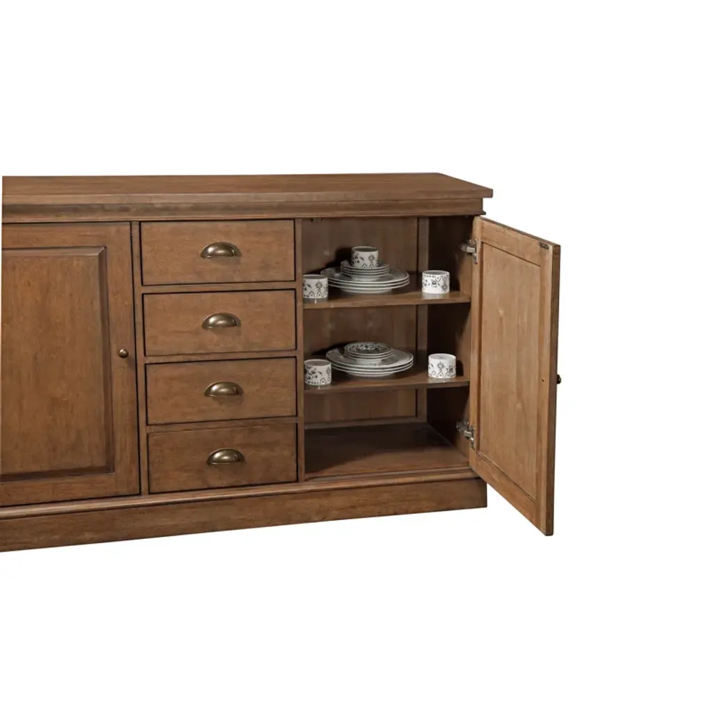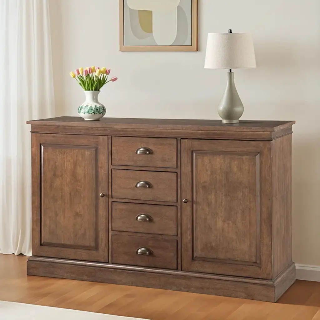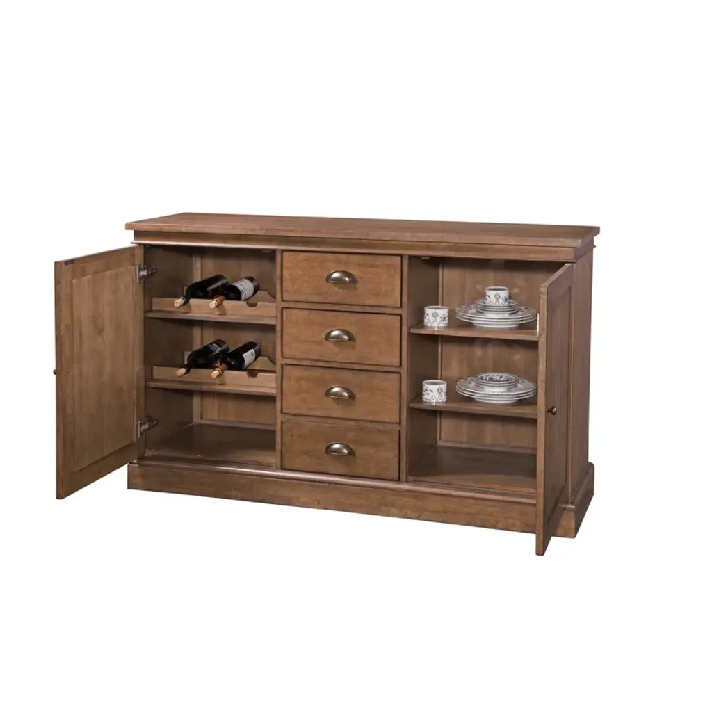 Add a touch of modern elegance to your dining room with the stunning modern server. Expertly crafted from high-quality birch veneer with a toffee finish, this server is both stylish and durable. The clean lines and mid-century modern design add a touch of sophistication to any space.The server features four storage drawers, adjustable shelves, and wine storage, providing ample space to store your dishes, glassware, silverware, and wine. The adjustable shelves allow you to customize the storage space to meet your needs, and the wine storage can safely accommodate up to 6 bottles of wine.The server also features a spacious top surface that can be used to display your favorite décor items or serve food and drinks. The base adds a touch of elegance and stability, and the non-marking feet protect your floors from scratches.Whether you're using it to store your essentials or simply to add a touch of style to your dining room, this server is the perfect addition to any home.