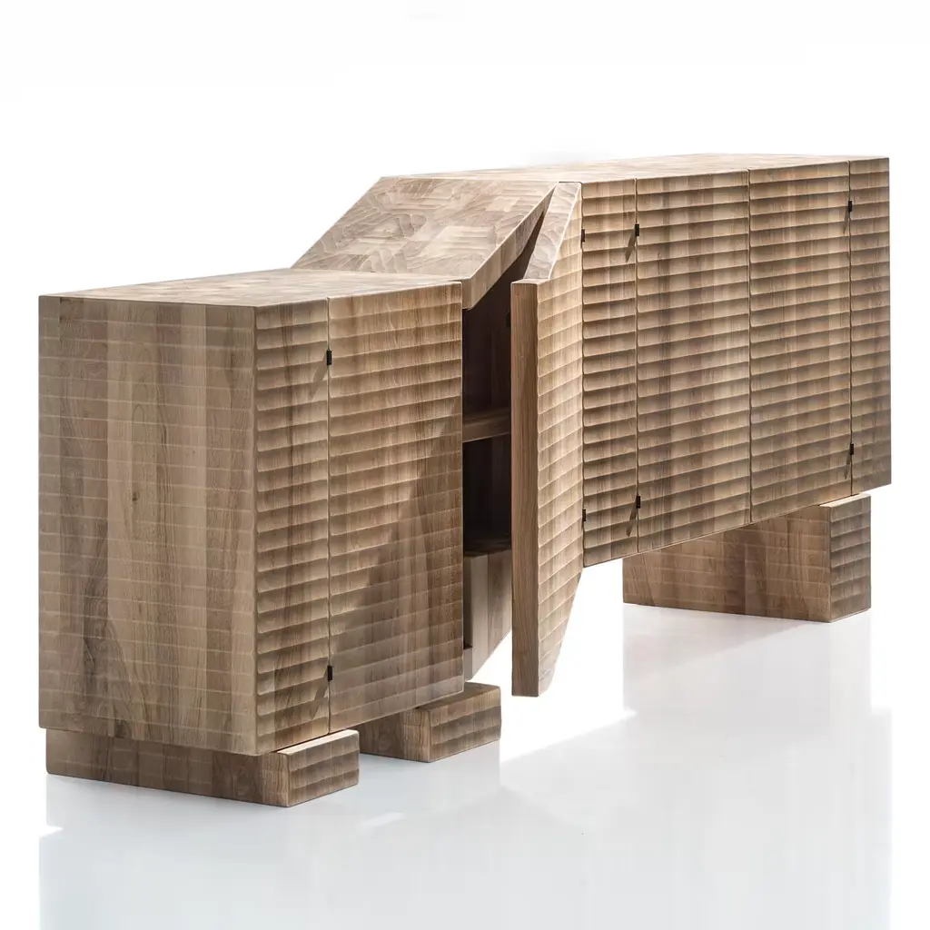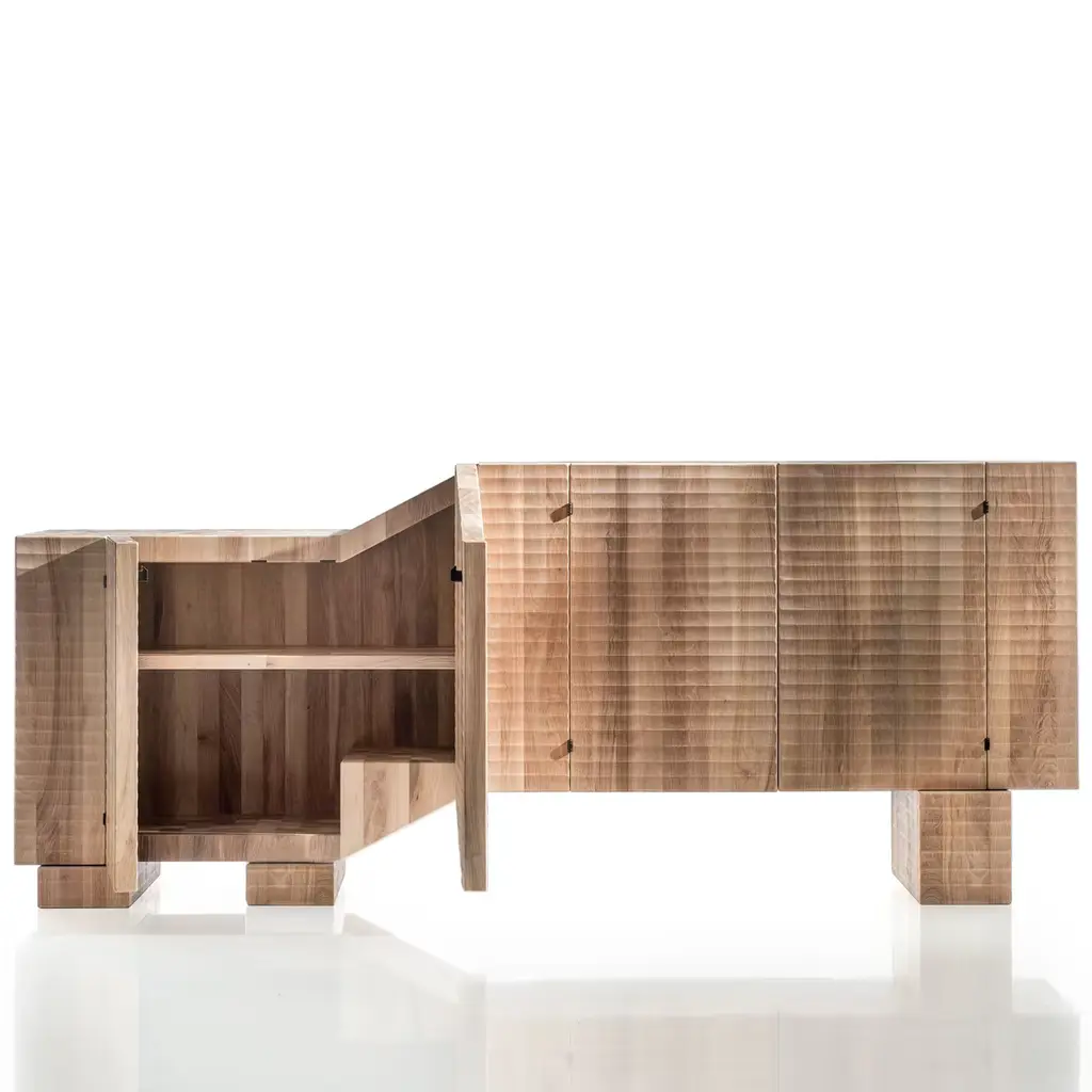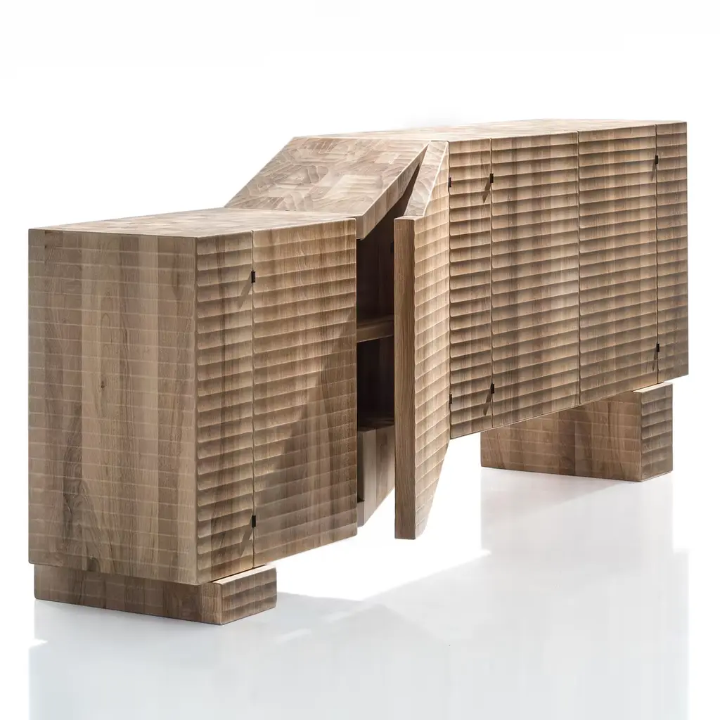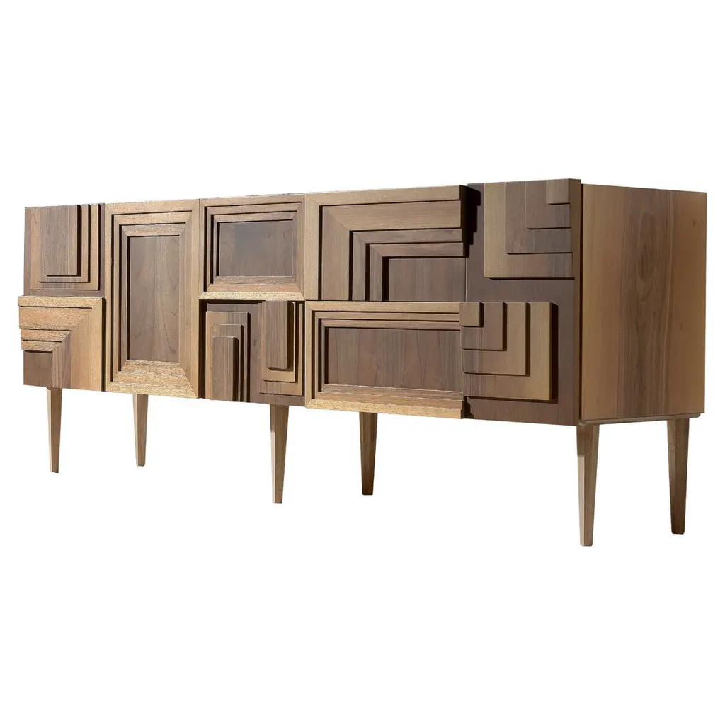 The front panel of this striking four-door sideboardis hand-carved in full relief with a gouge and plane to obtain the geometrical pattern decoration. The hidden steel lock and the invisible metal hinges are hand made. There are two adjustable shelves inside.
