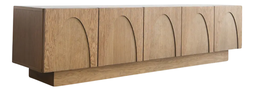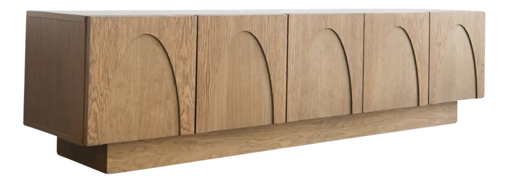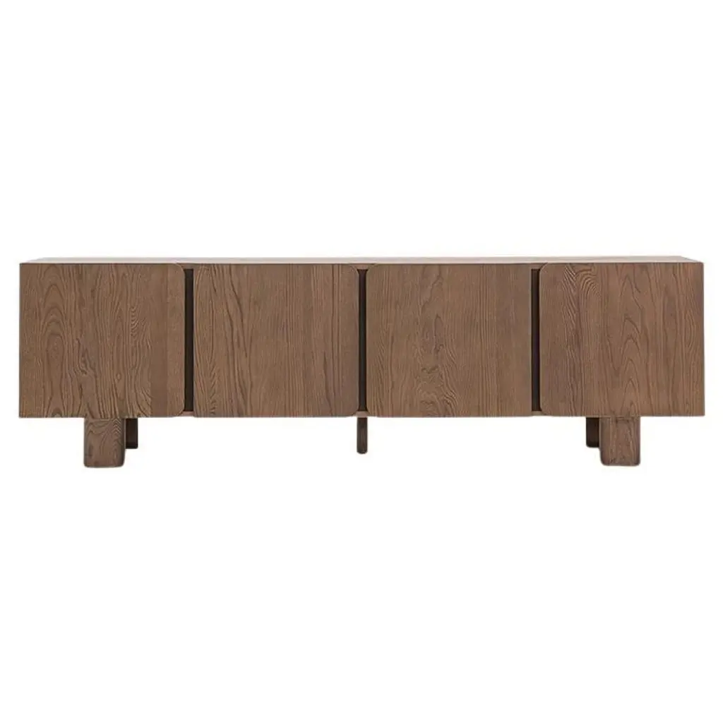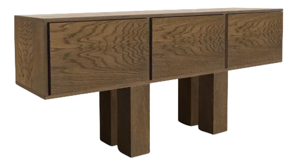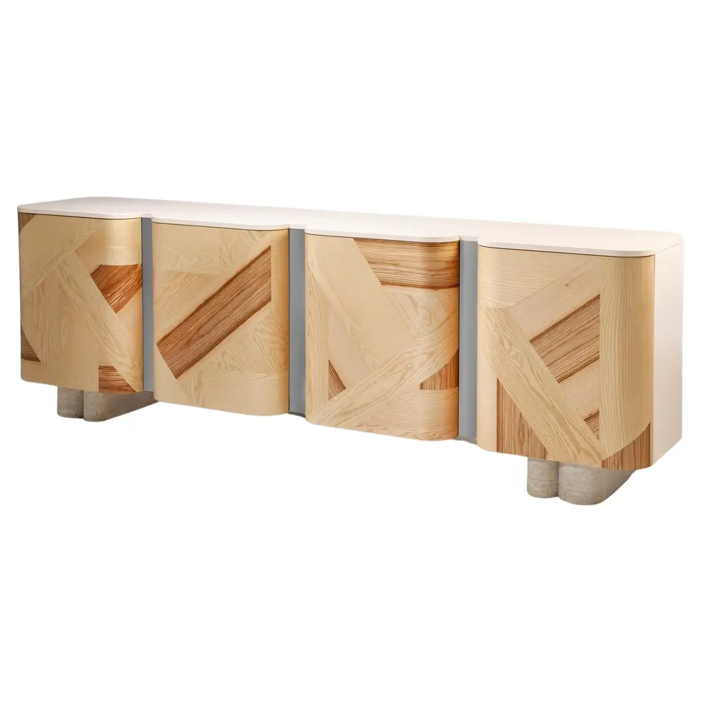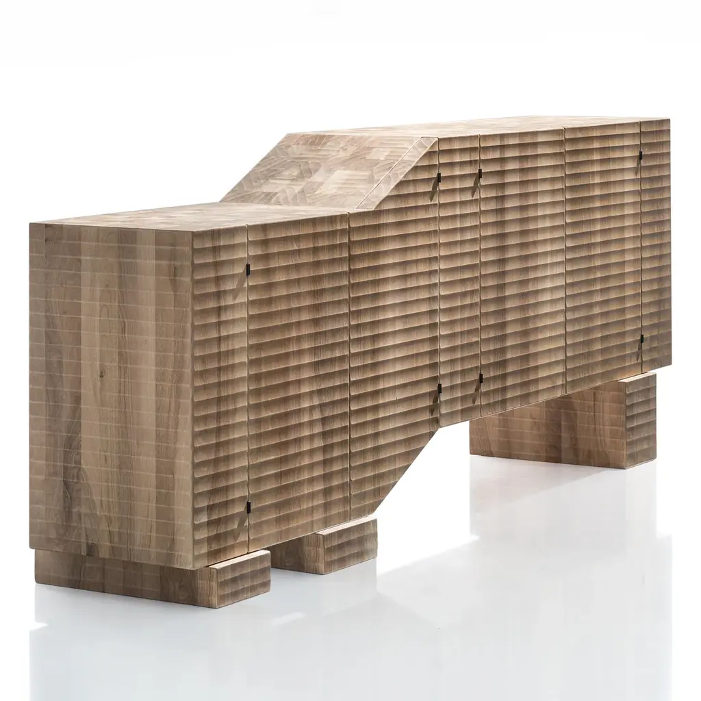 The front panel of this striking four-door sideboardis hand-carved in full relief with a gouge and plane to obtain the geometrical pattern decoration. The hidden steel lock and the invisible metal hinges are hand made. There are two adjustable shelves inside.